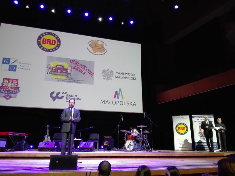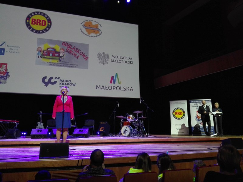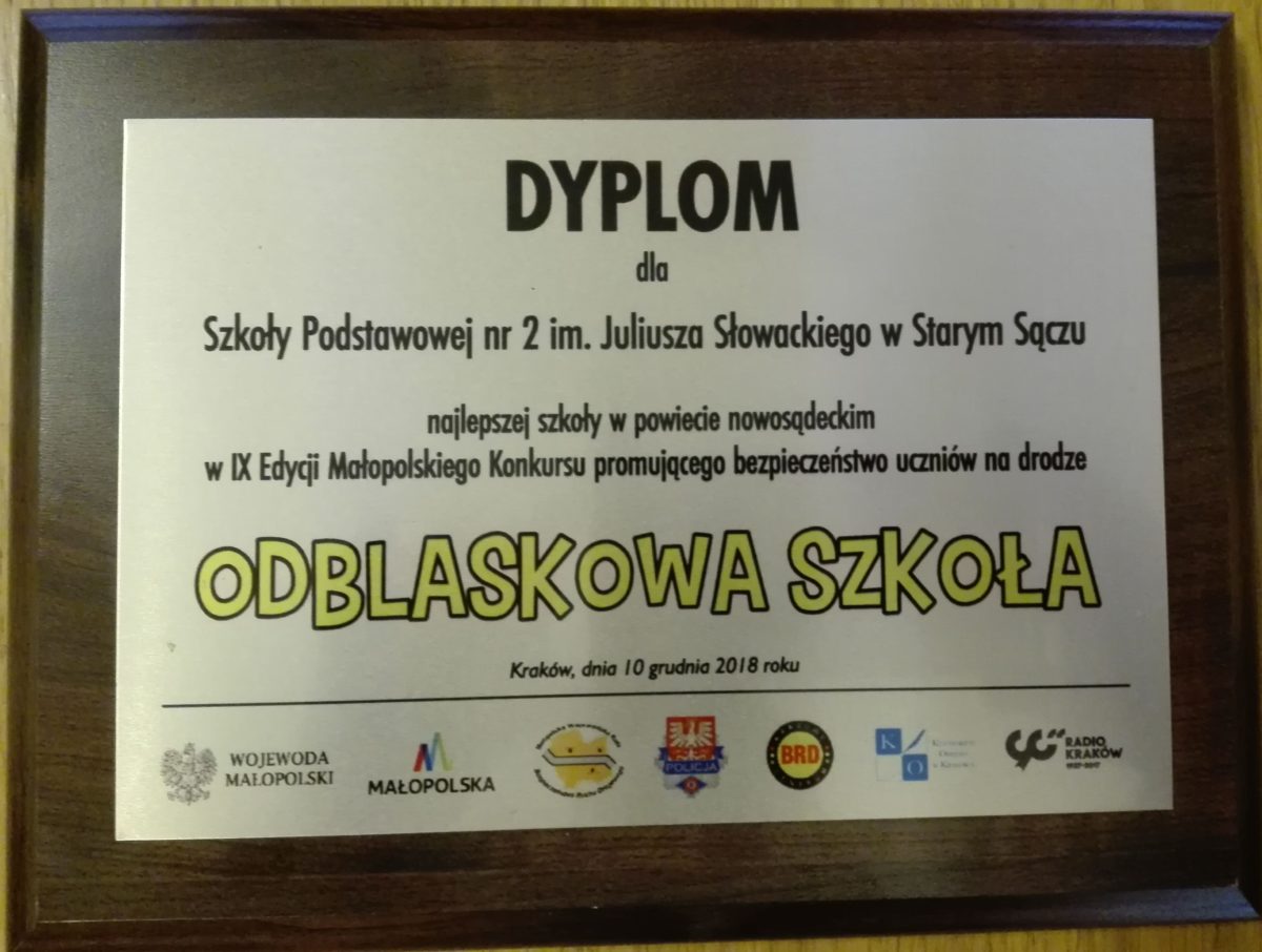 Delegacja Szkoły Podstawowej nr 2 im Juliusza Słowackiego ze Starego Sącza – p. dyrektor Wioletta Nowak, koordynator szkolnych działań konkursowych p. Agnieszka Obrzud oraz uczniowie: Natalia Gargula, Emilia Gabryś, Damian Dziarmaga, Sebastian Tomecki, Oliwia Tokarczyk i Ewelina Tarko uczestniczyli w uroczystej gali wręczenia nagród laureatom IX Edycji Małopolskiego Konkursu „Odblaskowa Szkoła”, która miała miejsce w Centrum Kongresowym ICE w Krakowie. Powód tego udziału był znaczący, bowiem „Dwójka” okazała się najlepszą w powiecie nowosądeckim (spośród 33 zgłoszonych szkół) pod względem działań związanych z bezpieczeństwem swoich uczniów, ich rodziców jak również mieszkańców Starego Sącza.