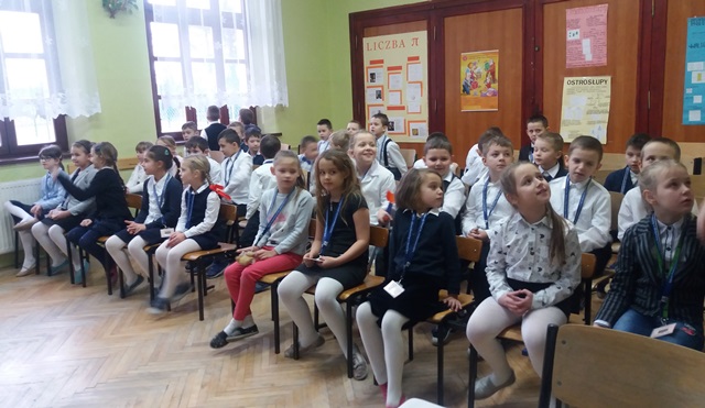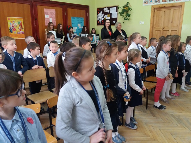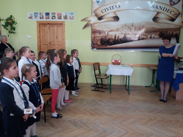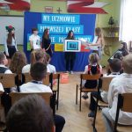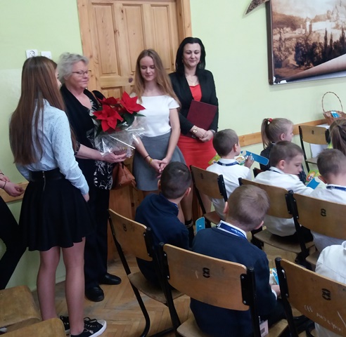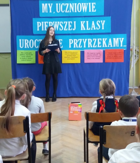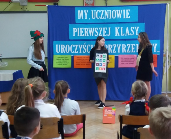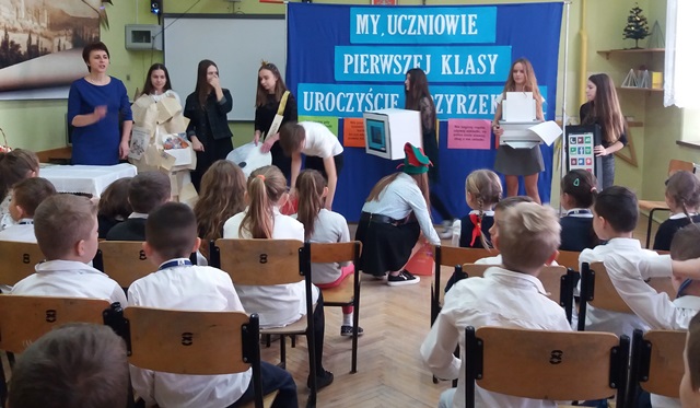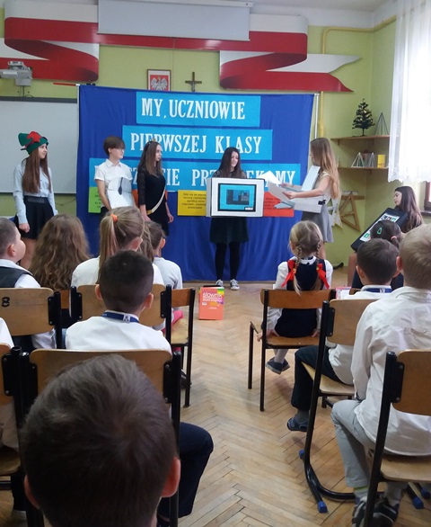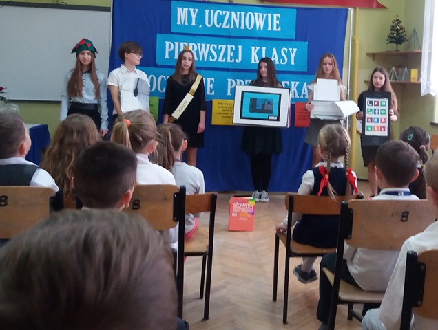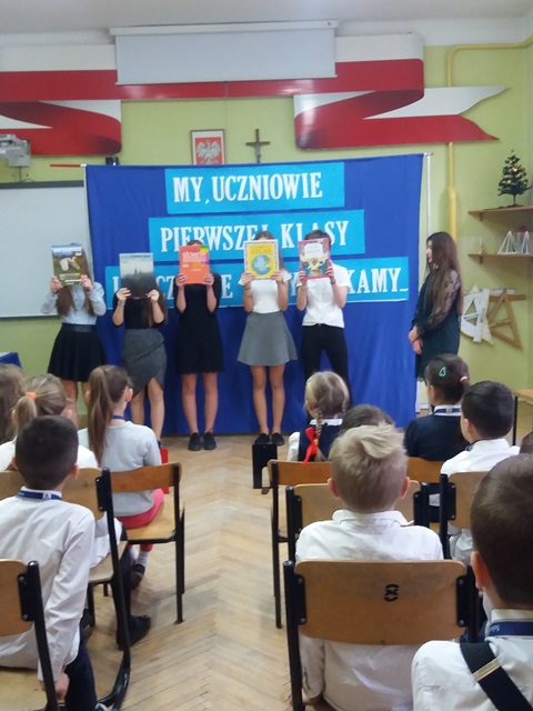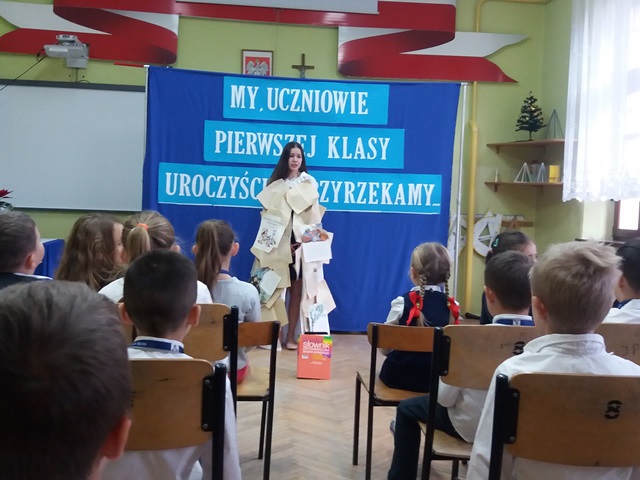 O godzinie 900 do pięknie przygotowanej sali nr 8 przybyli: pani Jolanta Młodkowska – Czech – redaktor czasopisma „Z Grodu Kingi”, dyrektor naszej szkoły pani Wioletta Nowak i najważniejsi goście – pierwszoklasiści z wychowawczyniami Stanisławą Bielak – 1A i Bożeną Bielak – 1B. Spotkanie rozpoczęła Kasia Rejowska (ucz. kl. 3A) recytacją wiersza „Książka”. Następnie pani Halina Madziar przywitała zebranych. Wielką przyjemnością było popatrzeć na zadziwione i uśmiechnięte buzie pierwszaków, gdy na scenie pojawiły się: stara, zniszczona książka (przepiękna kreacja Kasi Sadowskiej), Atlas, Encyklopedia, Album, Słownik, Baśnie (Joanna Wójcik, Weronika Dolińska, Aleksandra Szczęsna, Sylwia Wojtas, Zuzanna Lis) i czytelnik, wybierający jedną z nich – Laura Korona. Dzieci zaprezentowały swoje umiejętności czytelnicze, samodzielnie odczytując z dużych, kolorowych plakatów prośby zniszczonej książki. Jednak największą atrakcją wzbudzającą ogólną wesołość było przedstawienie „Moda na czytanie”. „Rywale książki”: komputer, Internet, mysz komputerowa, drukarka, telefon komórkowy zachwalający swoje walory przegrali na korzyść książki, bo:„………………………………każda moda kiedyś minie. Lecz jest jedna co zostanie. Jaka? Moda na czytanie”