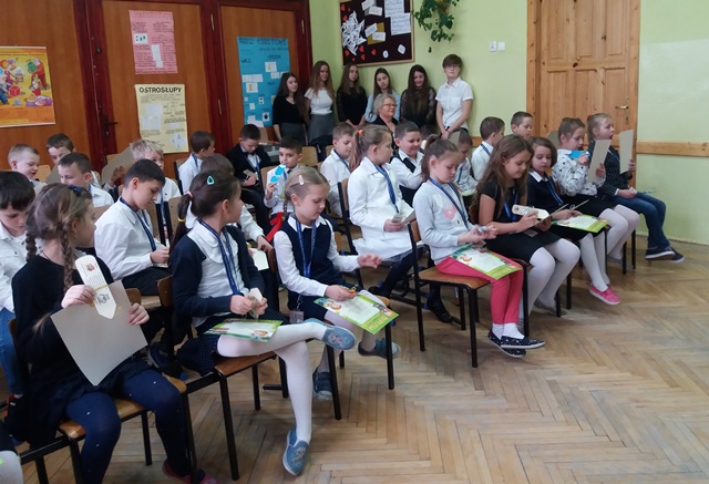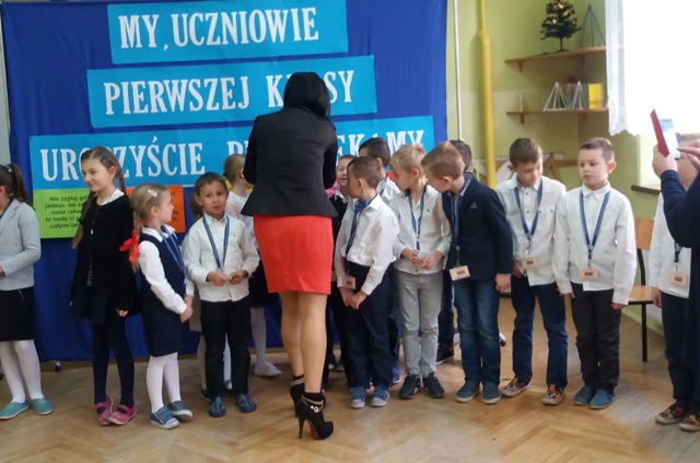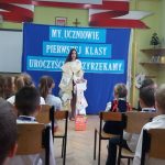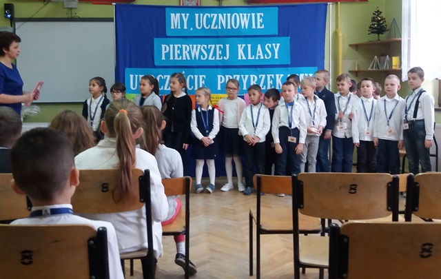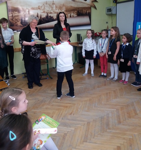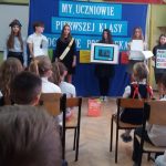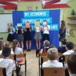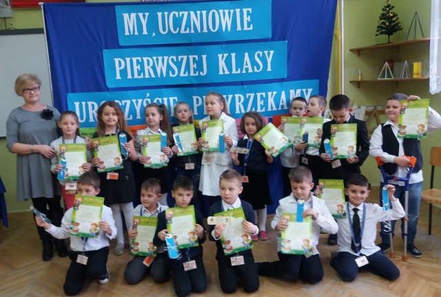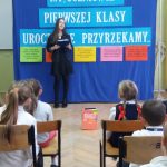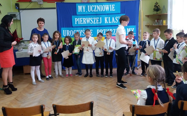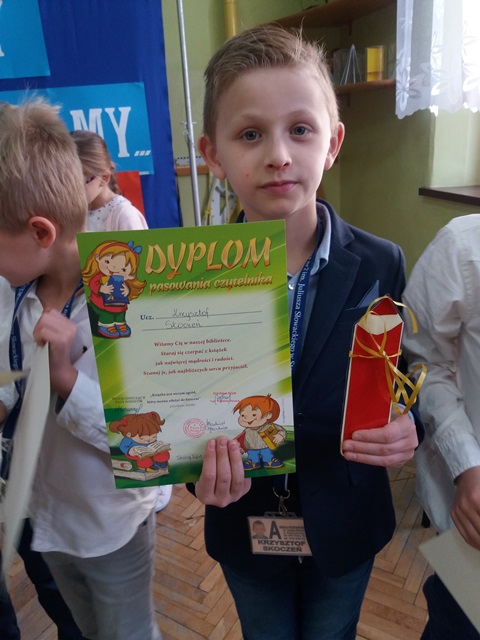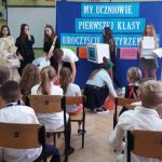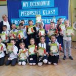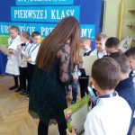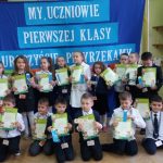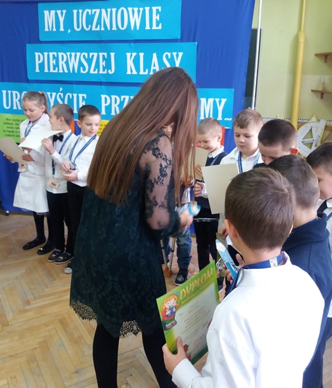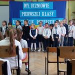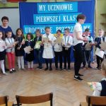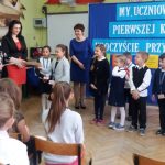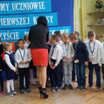 Po części artystycznej nadszedł czas na złożenie ślubowania i moment pasowania na czytelnika. Z rąk pani dyrektor szkoły Wioletty Nowak oraz pani Jolanty Młodkowskiej – Czech uczniowie otrzymali pamiątkowe dyplomy ufundowane przez Radę Rodziców i zakładki wykonane przez grupę projektową. Zaproszenie czytelników do biblioteki oraz wspólne zdjęcia zakończyły uroczystość.