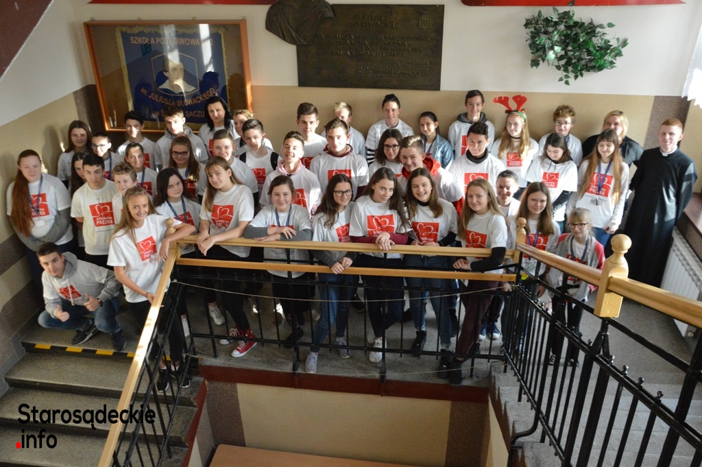 Po szkole krzątają się uczniowie w biało czerwonych koszulkach. Skrupulatnie segregują i zbierają potrzebne dary. Wszystko pod okiem ks Tomasza Chrupka i pedagog Małgorzaty Koszyk. Atmosfera udziela się wszystkim. W przerwie…tańczą. Wszak radość z pomagania jest olbrzymia.