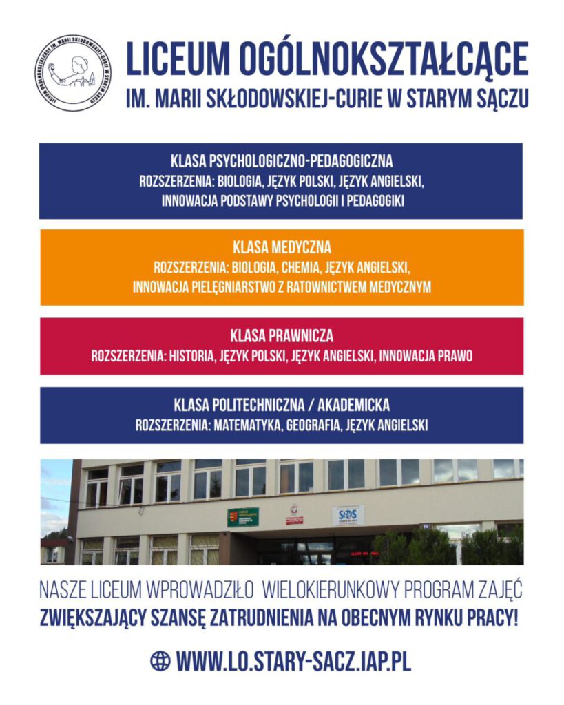 Ósmoklasisto, poznaj nas i odkryj naszą szkołę! ZAPRASZAMY NA DZIEŃ OTWARTEJ SZKOŁY! To będzie dzień jak co dzień. Bez udawania i specjalnego przygotowania – dokładnie tak jak wygląda każdy dzień w naszym Liceum –tak zaprasza w swoje progi przyszłych swoich uczniów Liceum Ogólnokształcące im. Marii Skłodowskiej-Curie w Starym Sączu.