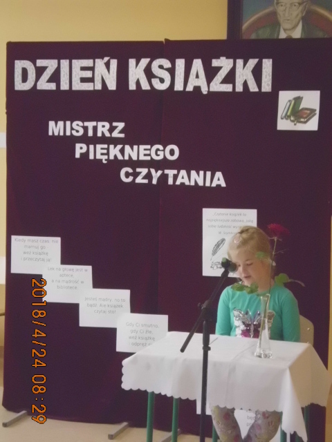 Następnie, po przerwie, odbyła się IV edycja konkursu Mistrz Pięknego Czytania. Uczniowie mieli za zadanie odczytać wylosowany fragment książki – oceniana była nie tylko płynność, intonacja czy dykcja, ale i strona emocjonalna przekazu. Następnie każdy uczestnik musiał podać tytuł i autora książki oraz wymienić głównych bohaterów. Mistrzem Pięknego Czytania w kategorii klas młodszych została Malwina Chochorowska z klasy IV, natomiast w kategorii klas starszych Agnieszka Pawłowska z klasy VII. Każdy z uczestników otrzymał dyplom, a zwycięzcy I, II, III miejsc i wyróżnień zostali dodatkowo nagrodzeni książkami, statuetkami Mistrza Pięknego Czytania oraz smyczą z logo książki.