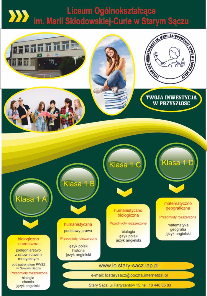 Liceum w Starym Sączu proponuje 4 klasy o profilu biologiczno-chemicznym, humanistycznym, humanistyczno-biologicznym i matematyczno-geograficznym, dając tym samym szansę na dodatkowy rozwój, który z pewnością zaprocentuje w przyszłości. Ta szkoła sprosta wymaganiom wielu uczniów i pozwala na efektywną naukę, która z pewnością zaowocuje doskonałymi wynikami na maturze.Rozszerzony język angielski w każdej z tych klas pozwolą w przyszłości na podjęcie studiów na bardzo różnych kierunkach.