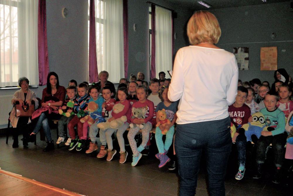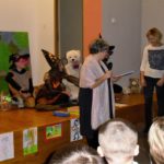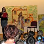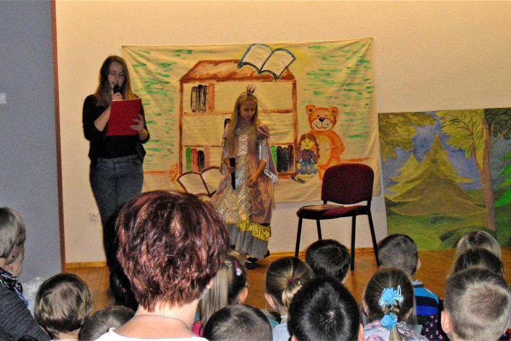 Piątkowe przedpołudnie w naszej bibliotece rozpoczęło się od wejścia do sali Misia, którego dzieci przywołały piosenką. W ślad za Misiem na scenę wkroczyły bajkowe postaci, które wystąpiły w przedstawieniu pt. „Zmartwienia Królowej Książek”. Historia dzieje się w bibliotece do, której nie przychodzą dzieci. Zmartwiona Królowa Książek wzywa na pomoc postaci z różnych bajek, aby te pomogły jej zachęcić dzieci do pożyczania i czytania książek. Zabawna i momentami zaskakująca opowieść mocno wciągnęła i rozśmieszyła małą publiczność.
