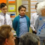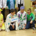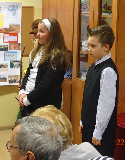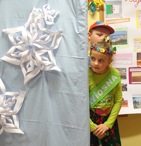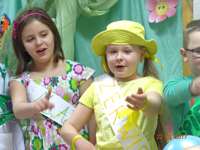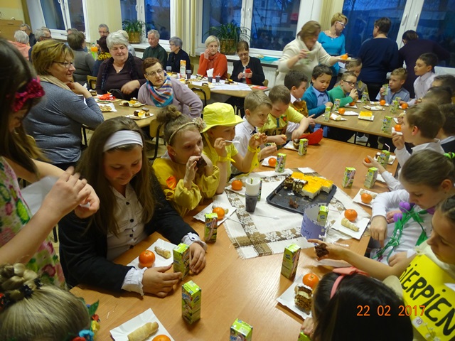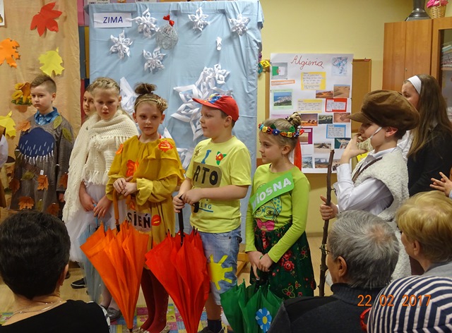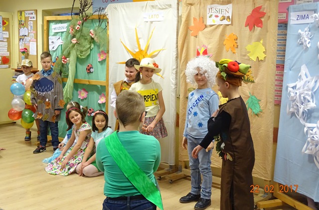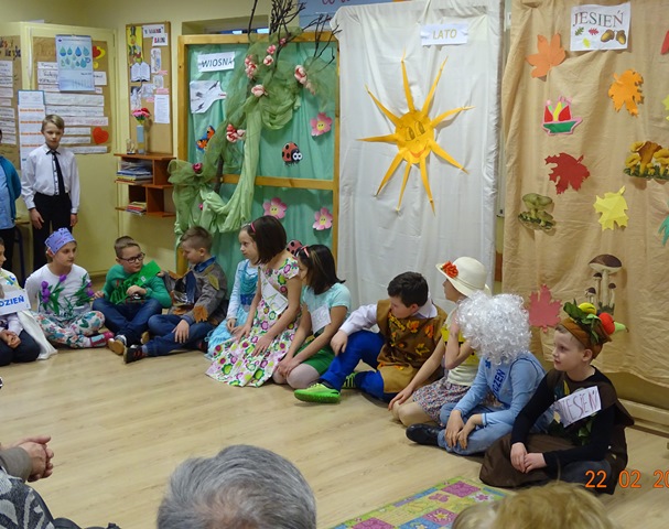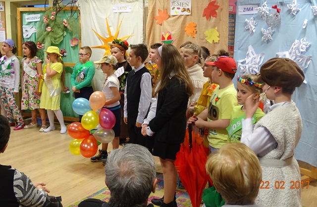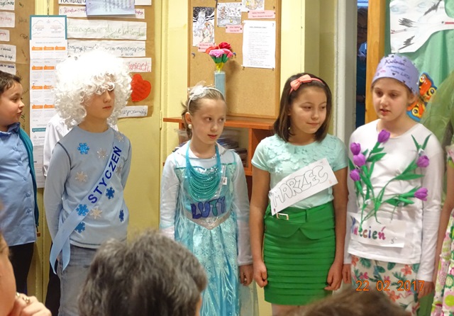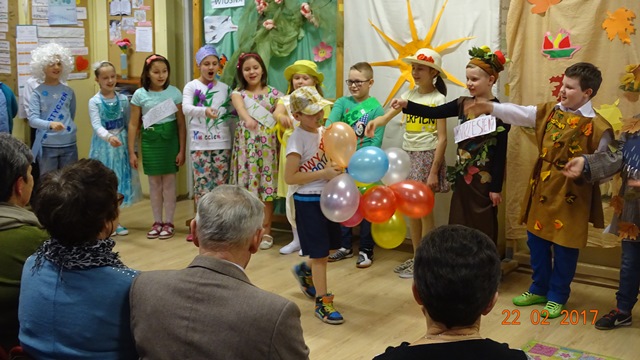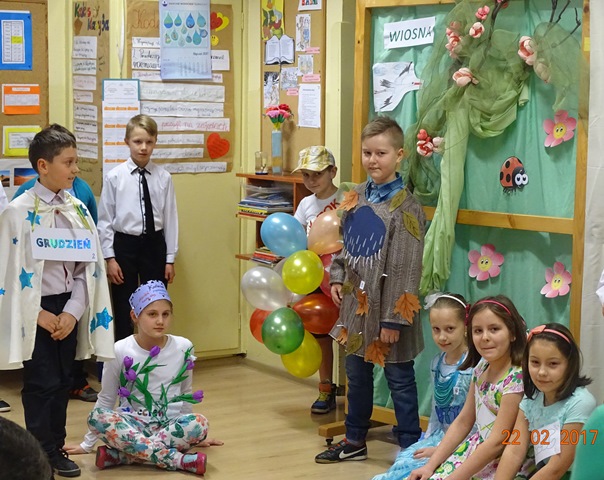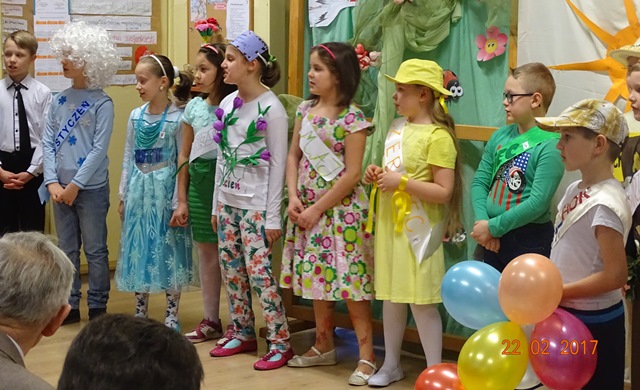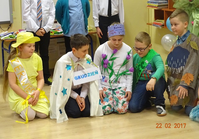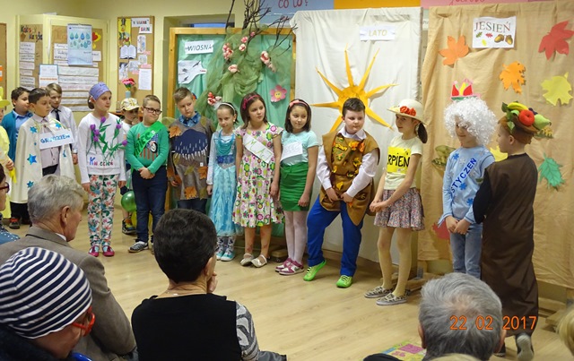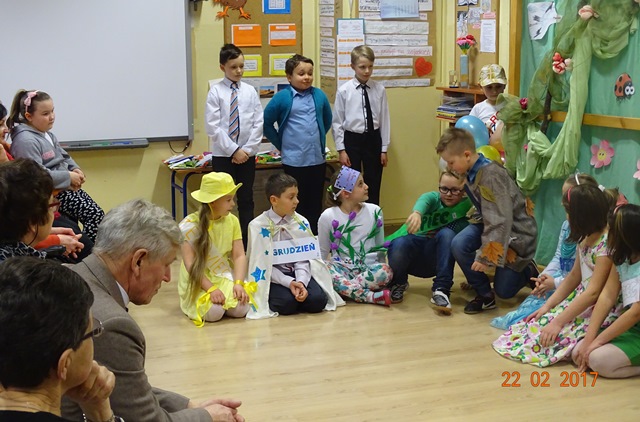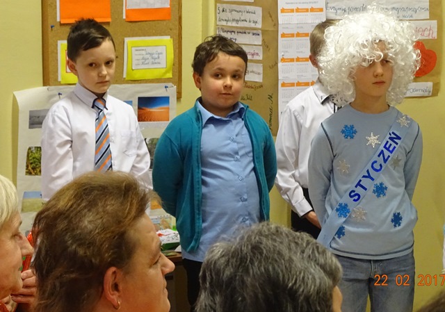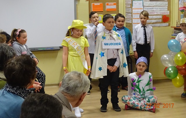Uczniowie z klasy 3a wraz z wychowawcą, p. Bożeną Bielak, przygotowali dla nich miłą niespodziankę. Było to przedstawienie zatytułowane „Kłótnia miesięcy”. Dzieci, przebrane za pory roku, miesiące oraz stary i nowy rok, odegrały wesołe scenki ze spotkania sprzeczających się miesięcy. W programie znalazły się także piosenki i życzenia dla babć i dziadków.