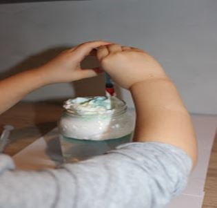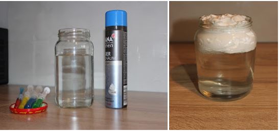 Słoik napełniamy wodą (tak 3/4 słoika) następnie wciskamy piankę do golenia…i zaczyna się zabawa. Kroplomierzem wpuszczamy barwnik. Początkowi zbiera się on pod pianką, a później zaczyna kolorowo kapać…efekt rewelacyjny
