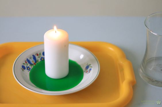 Zapaloną świeczkę stawiamy na podstawce, na której znajduje się woda z sokiem, następnie