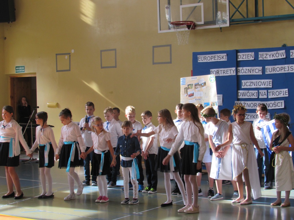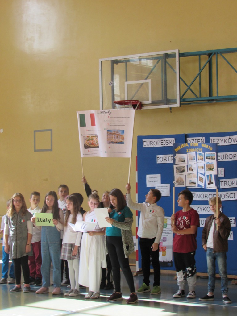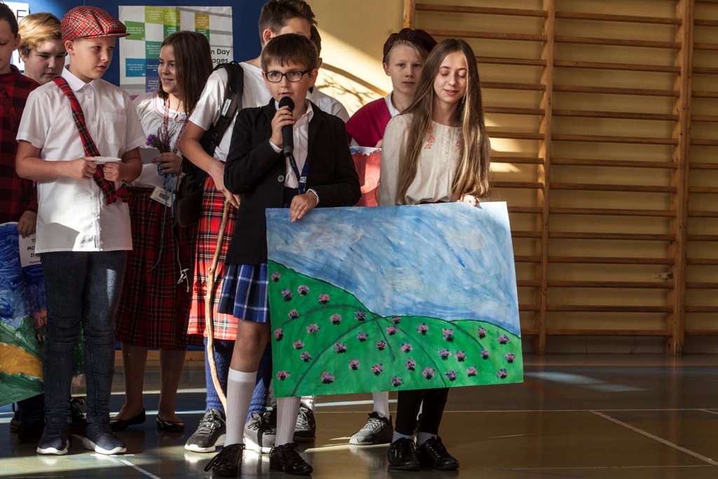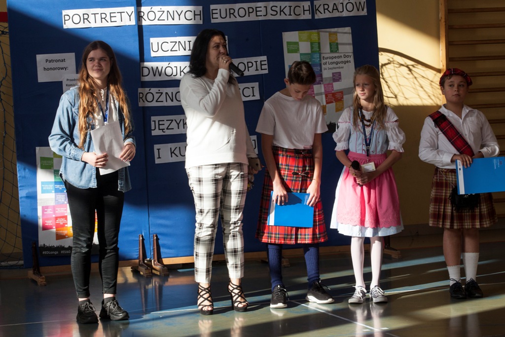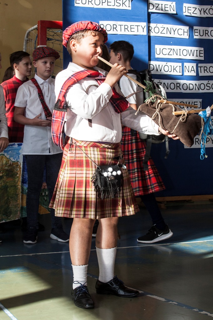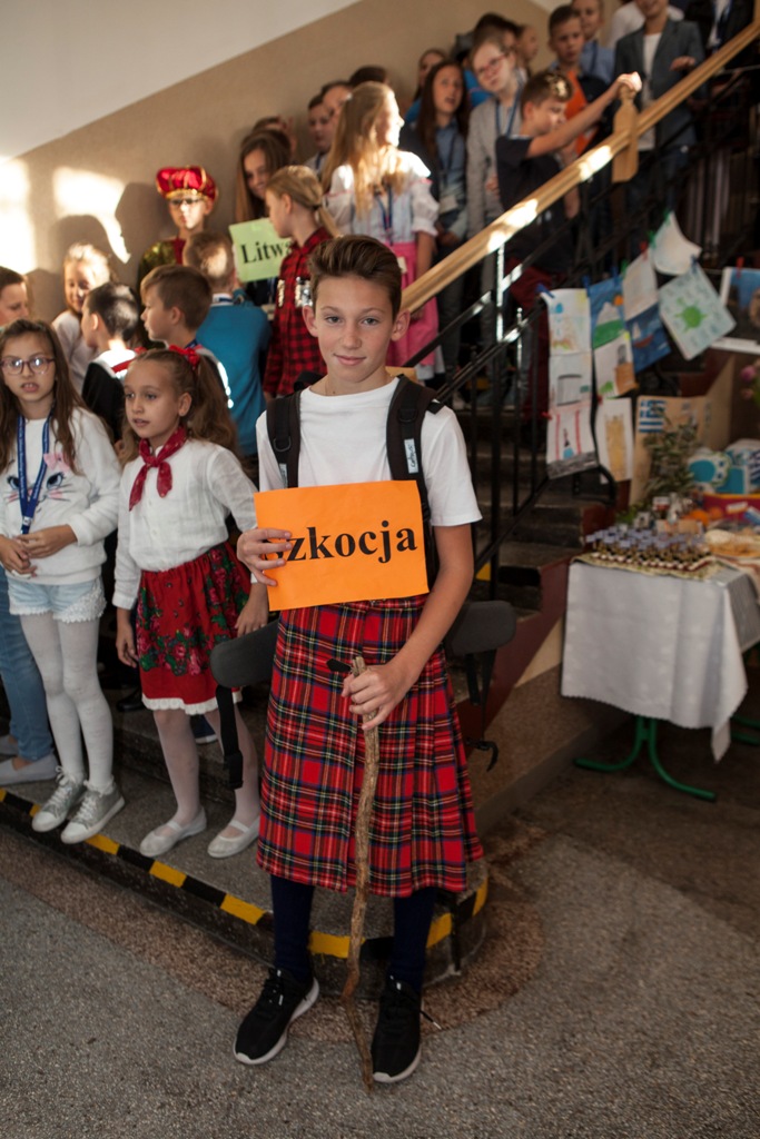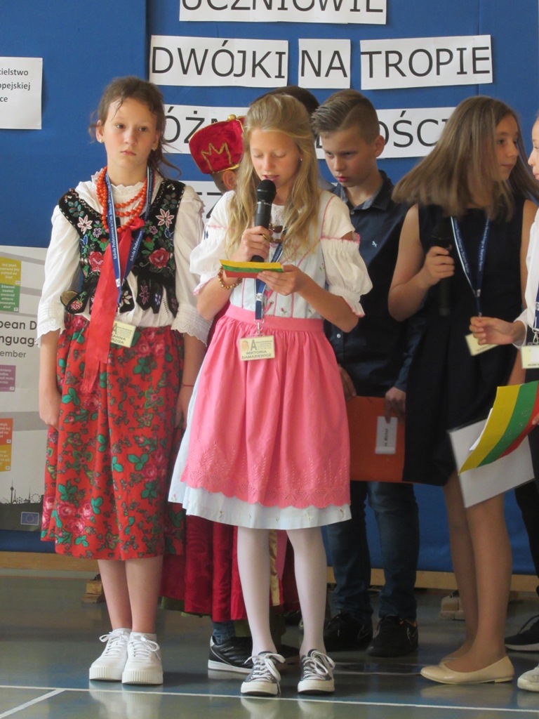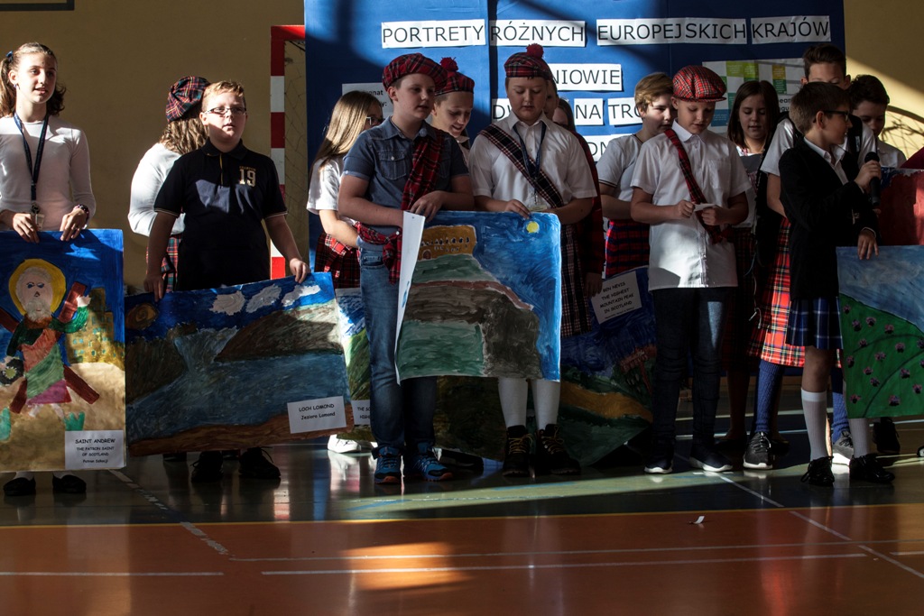 Gdy we czwartek, 26 września, w szkole rozbrzmiały dźwięki „Ody do radości”, na sali gimnastycznej pojawiły się wszystkie klasy wraz z nauczycielami. Każda klasa reprezentowała jeden z 16 europejskich krajów objętych projektem. Uroczysty przemarsz reprezentacji z 16 europejskich krajów rozpoczął szkolny finał projektu. Szymon Kostrzeba i Piotr Damasiewicz z kl. VIa ubrani w tradycyjne stroje szkockie w towarzystwie Wiktorii Damasiewicz z kl. Va w stroju litewskim powitali obecną na sali gimnastycznej dyrekcję szkoły, uczniów oraz nauczycieli. Przypomnieli również, iż nie tylko podczas Europejskiego Dnia Języków, ale każdego dnia, należy pamiętać o tym, że inny język to inna wizja świata. Finał szkolnego projektu pod patronatem honorowym Przedstawicielstwa Komisji Europejskiej otwarła dyrektor szkoły, Wioletta Nowak. Część artystyczną, podczas której wystąpiły wszystkie klasy poprowadziła Amelia Tokarczyk z kl.VIIIa.