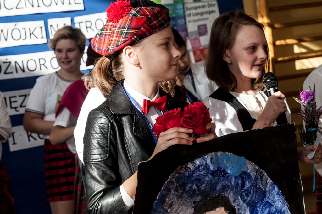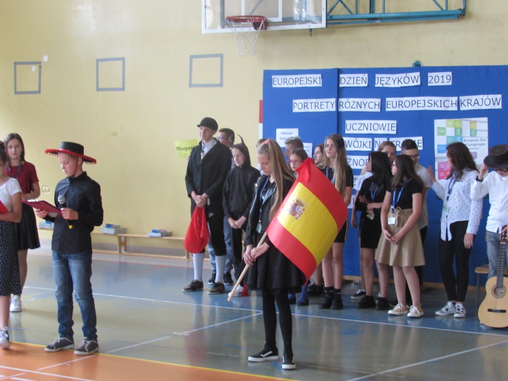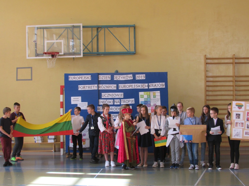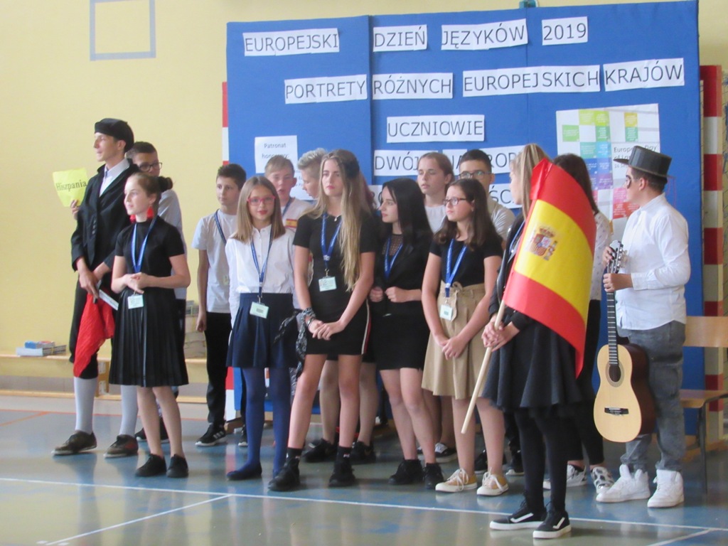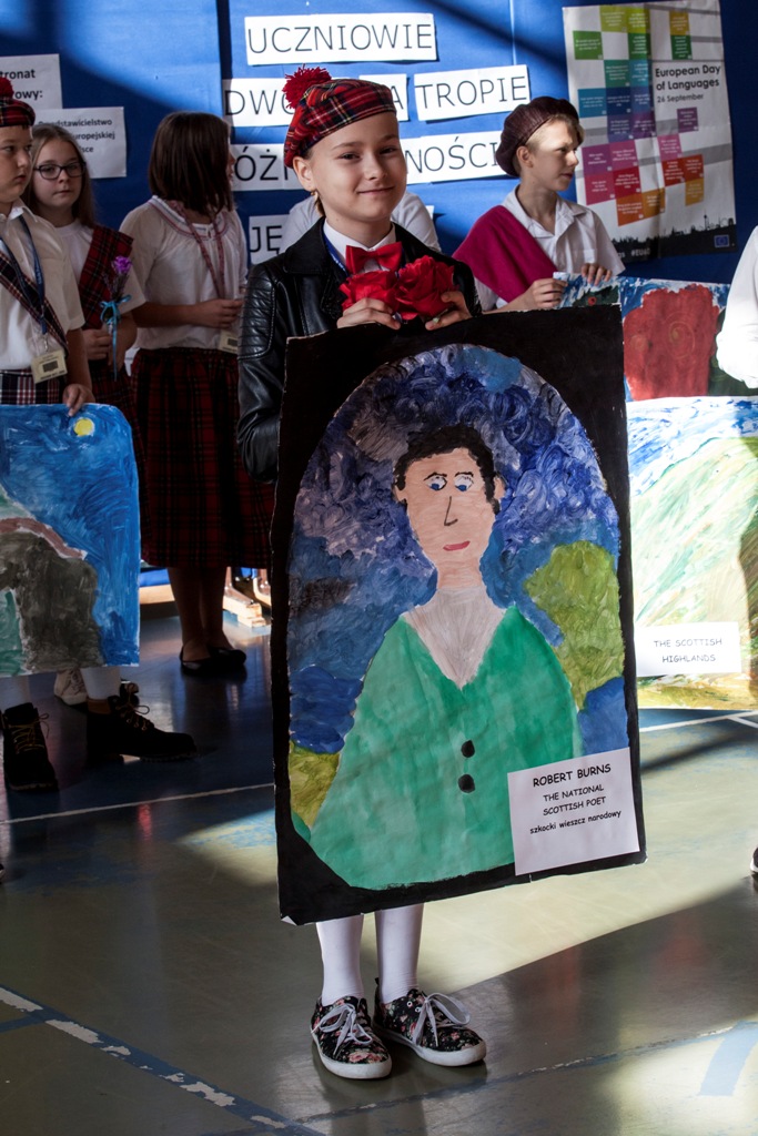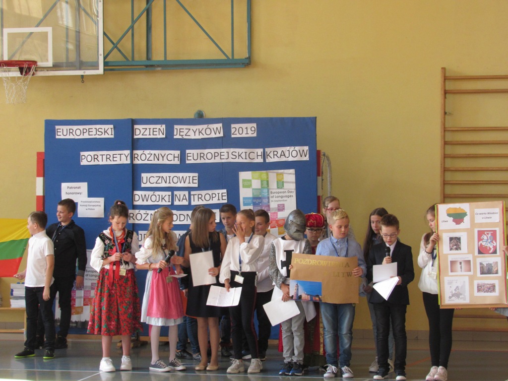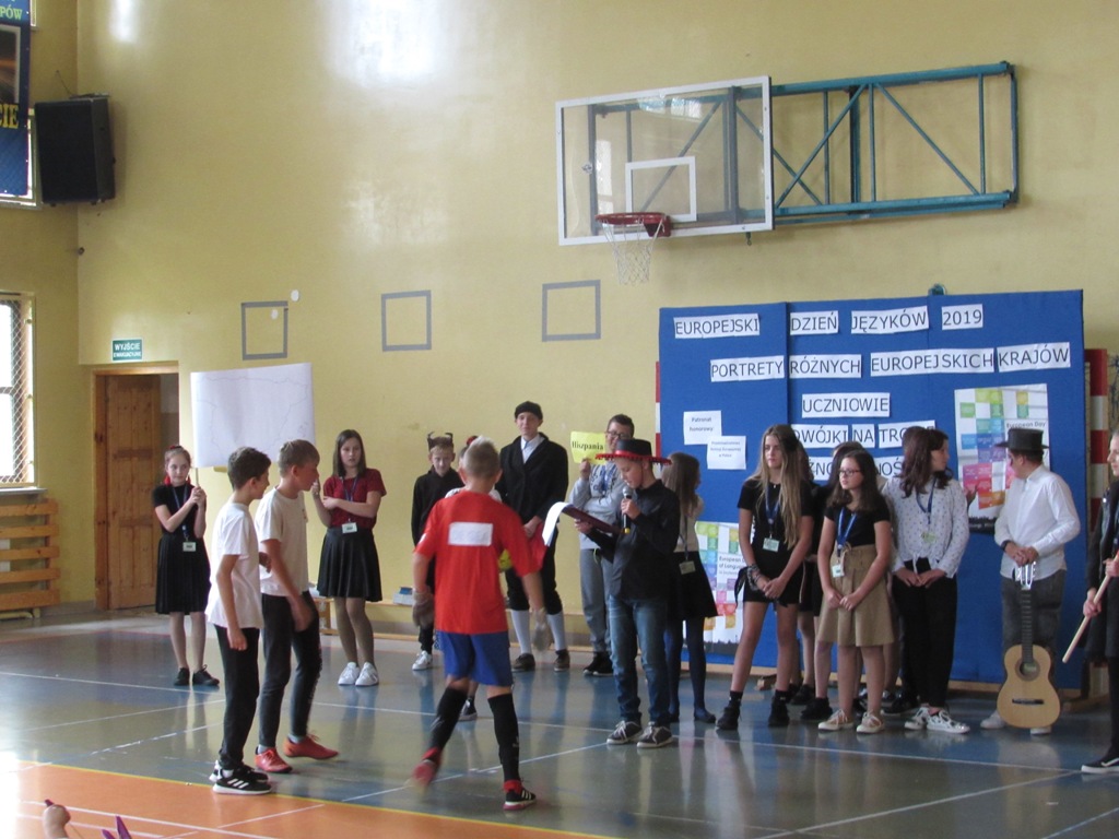 Gdy we czwartek, 26 września, w szkole rozbrzmiały dźwięki „Ody do radości”, na sali gimnastycznej pojawiły się wszystkie klasy wraz z nauczycielami. Każda klasa reprezentowała jeden z 16 europejskich krajów objętych projektem. Uroczysty przemarsz reprezentacji z 16 europejskich krajów rozpoczął szkolny finał projektu. Szymon Kostrzeba i Piotr Damasiewicz z kl. VIa ubrani w tradycyjne stroje szkockie w towarzystwie Wiktorii Damasiewicz z kl. Va w stroju litewskim powitali obecną na sali gimnastycznej dyrekcję szkoły, uczniów oraz nauczycieli. Przypomnieli również, iż nie tylko podczas Europejskiego Dnia Języków, ale każdego dnia, należy pamiętać o tym, że inny język to inna wizja świata. Finał szkolnego projektu pod patronatem honorowym Przedstawicielstwa Komisji Europejskiej otwarła dyrektor szkoły, Wioletta Nowak. Część artystyczną, podczas której wystąpiły wszystkie klasy poprowadziła Amelia Tokarczyk z kl.VIIIa.