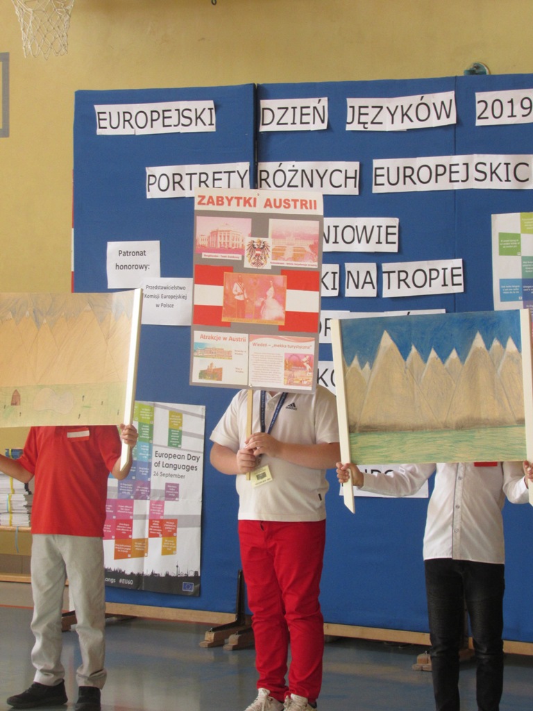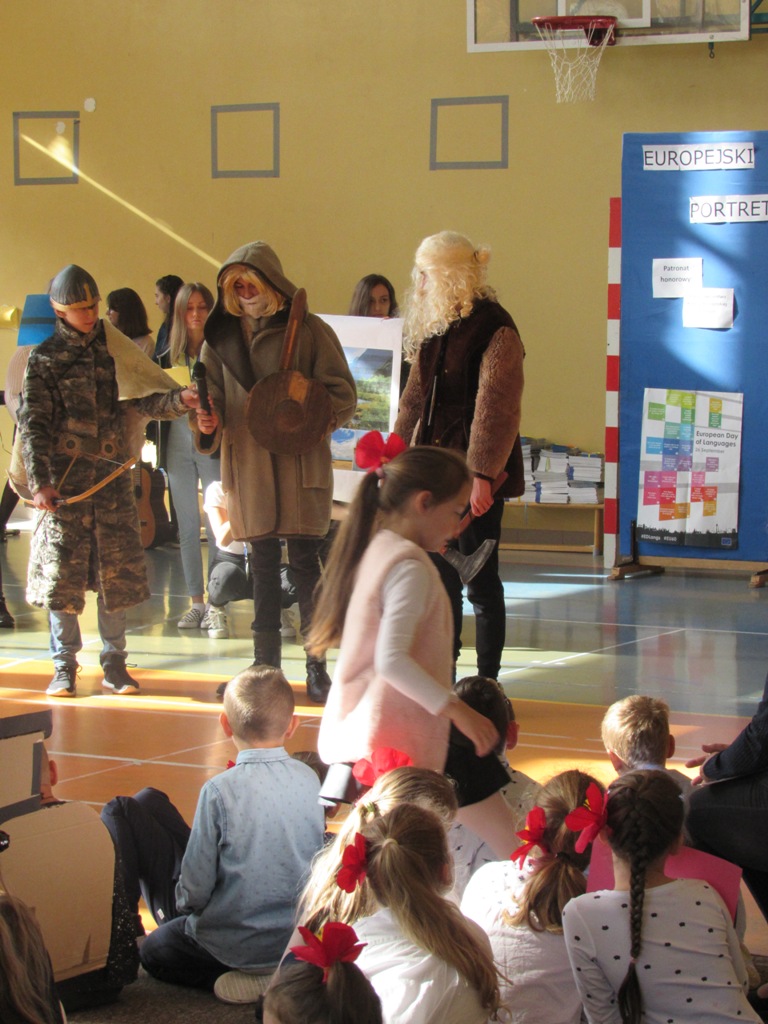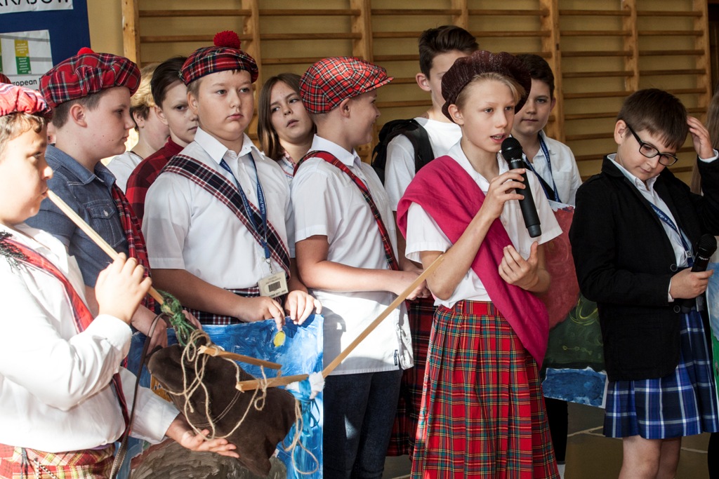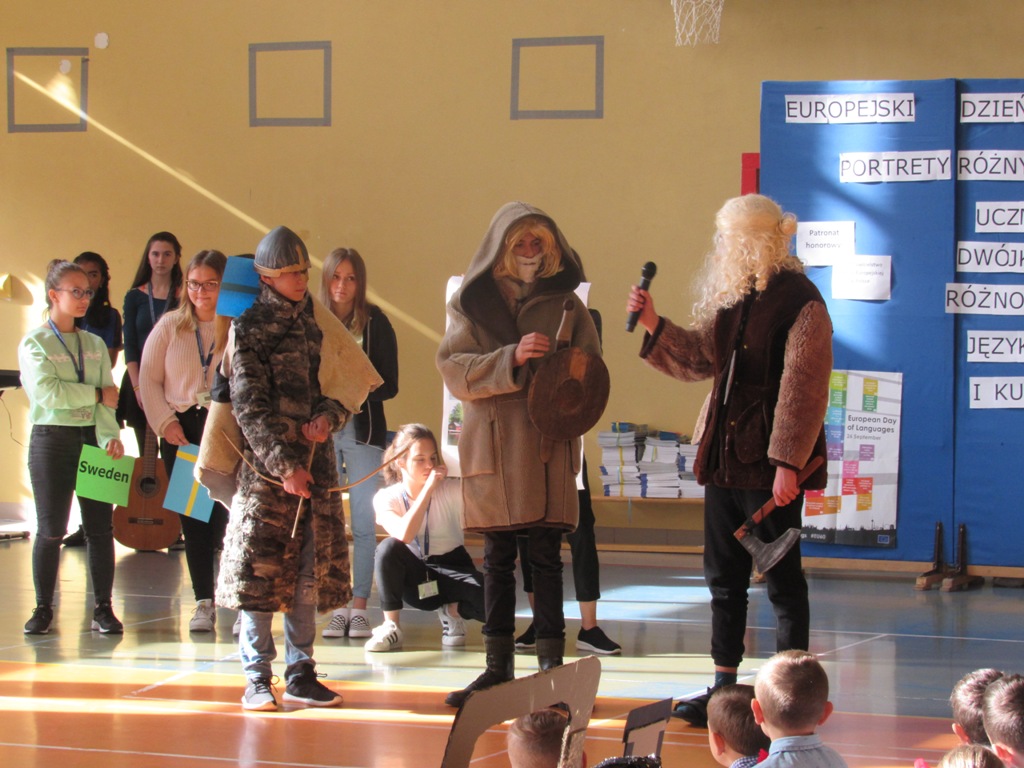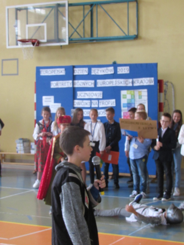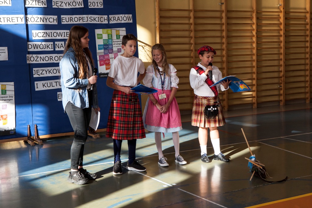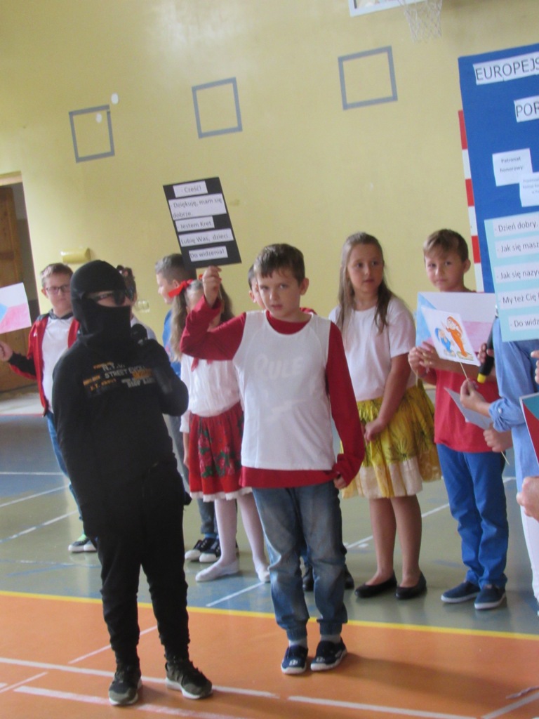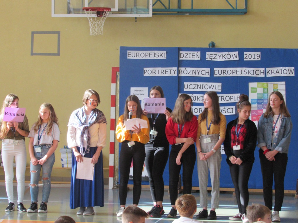 Gdy we czwartek, 26 września, w szkole rozbrzmiały dźwięki „Ody do radości”, na sali gimnastycznej pojawiły się wszystkie klasy wraz z nauczycielami. Każda klasa reprezentowała jeden z 16 europejskich krajów objętych projektem. Uroczysty przemarsz reprezentacji z 16 europejskich krajów rozpoczął szkolny finał projektu. Szymon Kostrzeba i Piotr Damasiewicz z kl. VIa ubrani w tradycyjne stroje szkockie w towarzystwie Wiktorii Damasiewicz z kl. Va w stroju litewskim powitali obecną na sali gimnastycznej dyrekcję szkoły, uczniów oraz nauczycieli. Przypomnieli również, iż nie tylko podczas Europejskiego Dnia Języków, ale każdego dnia, należy pamiętać o tym, że inny język to inna wizja świata. Finał szkolnego projektu pod patronatem honorowym Przedstawicielstwa Komisji Europejskiej otwarła dyrektor szkoły, Wioletta Nowak. Część artystyczną, podczas której wystąpiły wszystkie klasy poprowadziła Amelia Tokarczyk z kl.VIIIa.