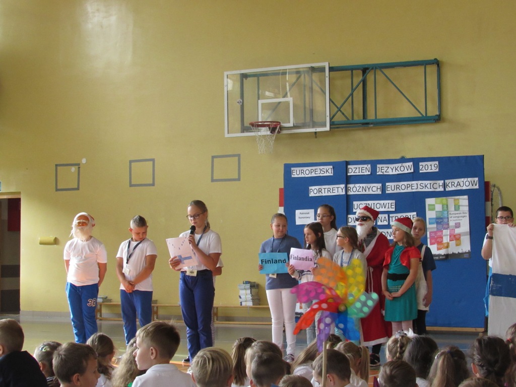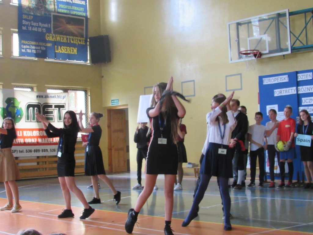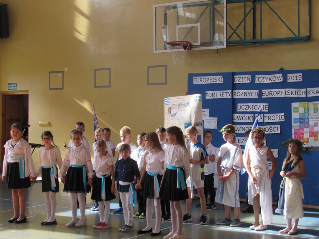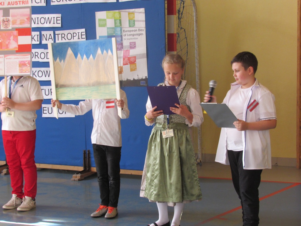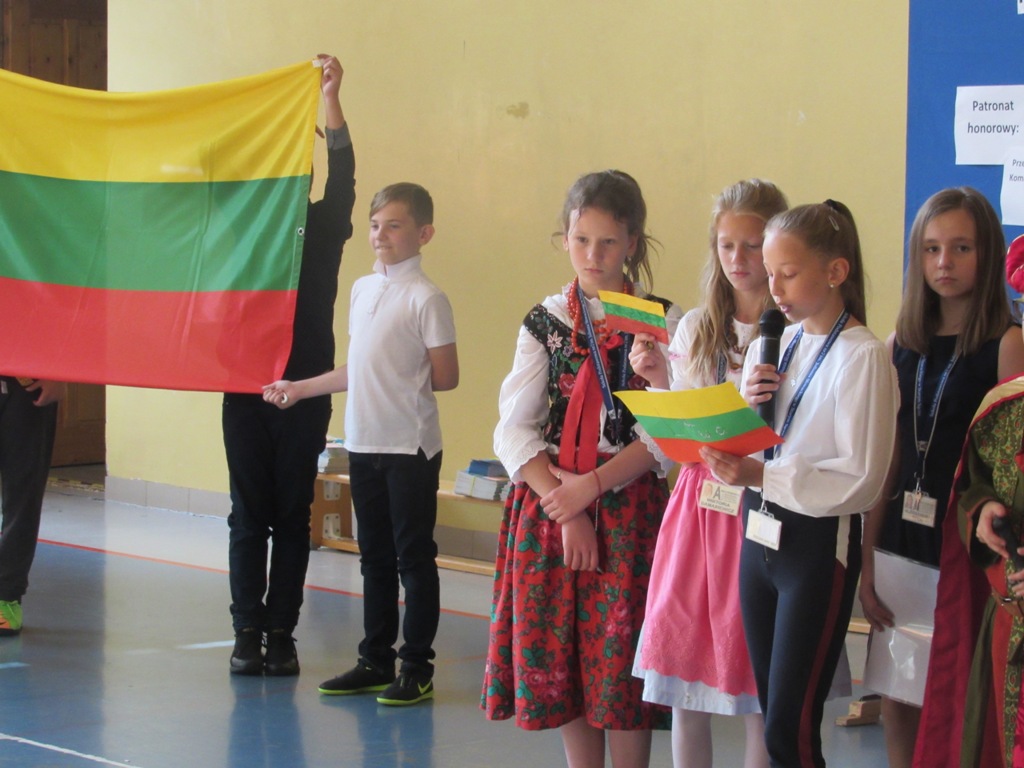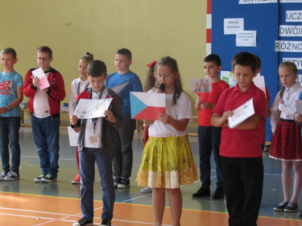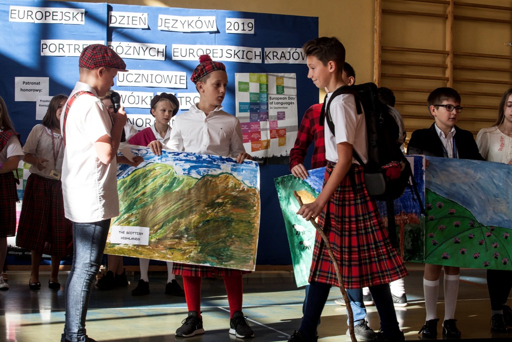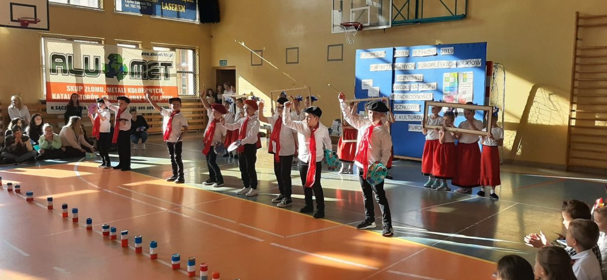 Gdy we czwartek, 26 września, w szkole rozbrzmiały dźwięki „Ody do radości”, na sali gimnastycznej pojawiły się wszystkie klasy wraz z nauczycielami. Każda klasa reprezentowała jeden z 16 europejskich krajów objętych projektem. Uroczysty przemarsz reprezentacji z 16 europejskich krajów rozpoczął szkolny finał projektu. Szymon Kostrzeba i Piotr Damasiewicz z kl. VIa ubrani w tradycyjne stroje szkockie w towarzystwie Wiktorii Damasiewicz z kl. Va w stroju litewskim powitali obecną na sali gimnastycznej dyrekcję szkoły, uczniów oraz nauczycieli. Przypomnieli również, iż nie tylko podczas Europejskiego Dnia Języków, ale każdego dnia, należy pamiętać o tym, że inny język to inna wizja świata. Finał szkolnego projektu pod patronatem honorowym Przedstawicielstwa Komisji Europejskiej otwarła dyrektor szkoły, Wioletta Nowak. Część artystyczną, podczas której wystąpiły wszystkie klasy poprowadziła Amelia Tokarczyk z kl.VIIIa.