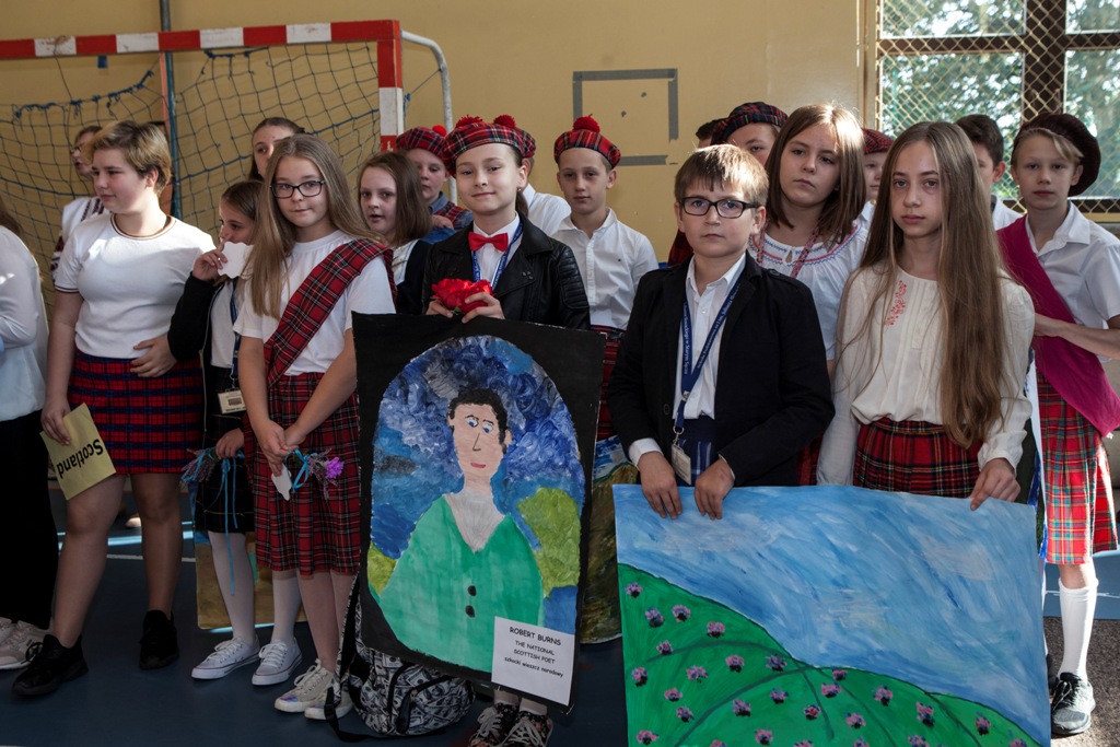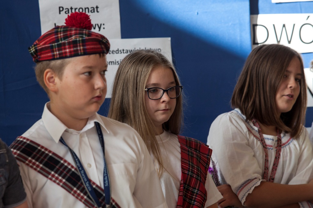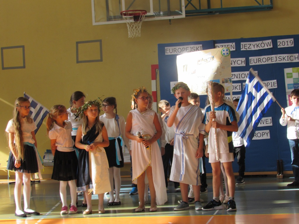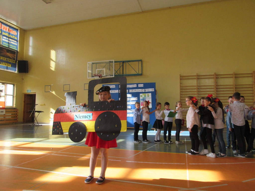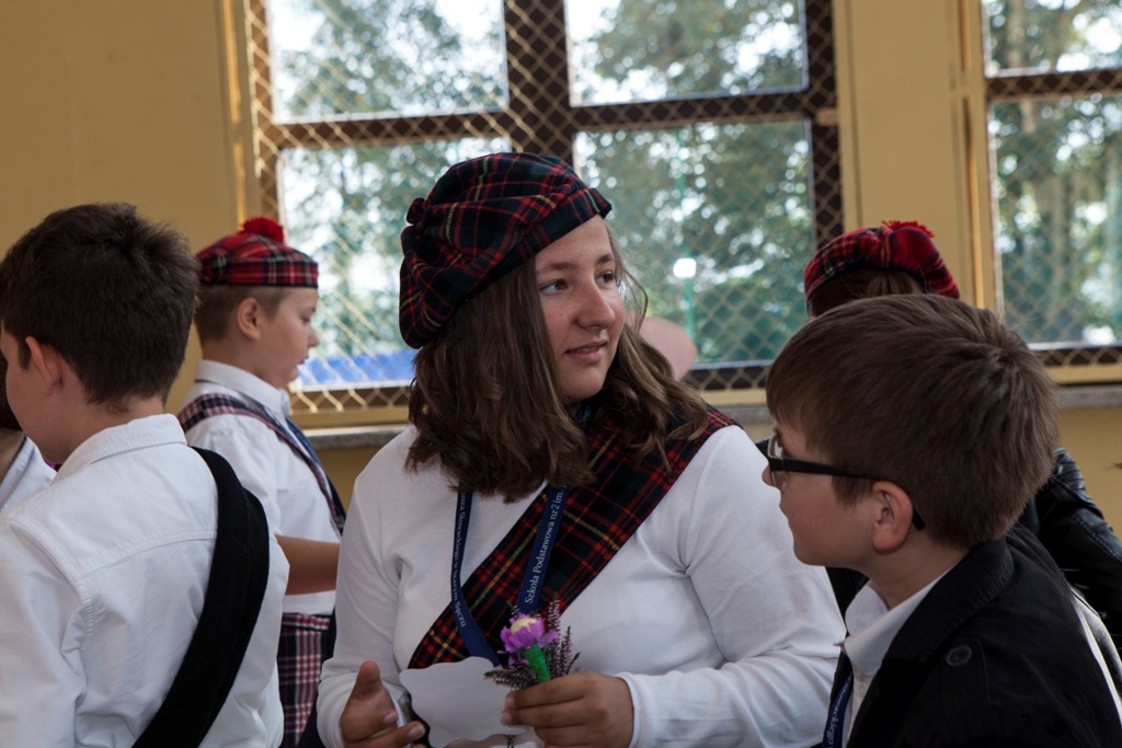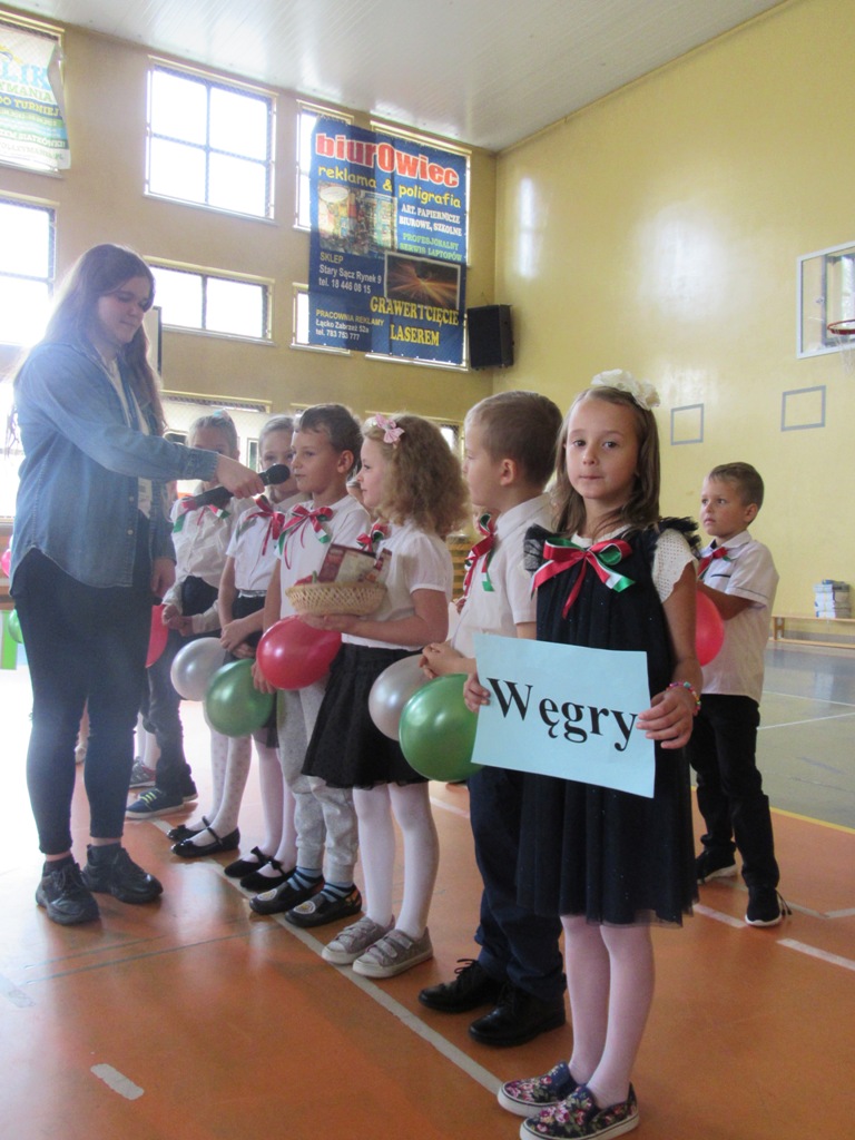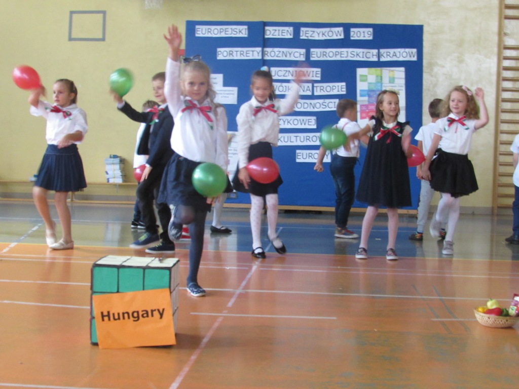 Gdy we czwartek, 26 września, w szkole rozbrzmiały dźwięki „Ody do radości”, na sali gimnastycznej pojawiły się wszystkie klasy wraz z nauczycielami. Każda klasa reprezentowała jeden z 16 europejskich krajów objętych projektem. Uroczysty przemarsz reprezentacji z 16 europejskich krajów rozpoczął szkolny finał projektu. Szymon Kostrzeba i Piotr Damasiewicz z kl. VIa ubrani w tradycyjne stroje szkockie w towarzystwie Wiktorii Damasiewicz z kl. Va w stroju litewskim powitali obecną na sali gimnastycznej dyrekcję szkoły, uczniów oraz nauczycieli. Przypomnieli również, iż nie tylko podczas Europejskiego Dnia Języków, ale każdego dnia, należy pamiętać o tym, że inny język to inna wizja świata. Finał szkolnego projektu pod patronatem honorowym Przedstawicielstwa Komisji Europejskiej otwarła dyrektor szkoły, Wioletta Nowak. Część artystyczną, podczas której wystąpiły wszystkie klasy poprowadziła Amelia Tokarczyk z kl.VIIIa.