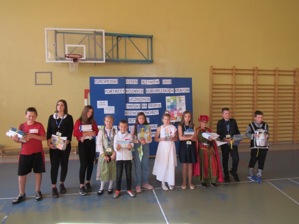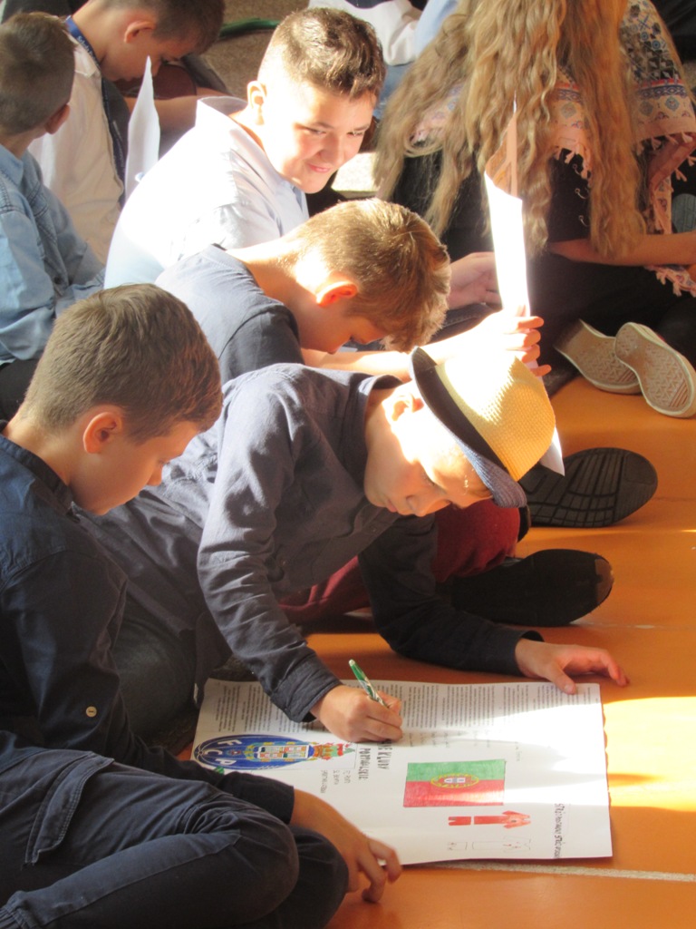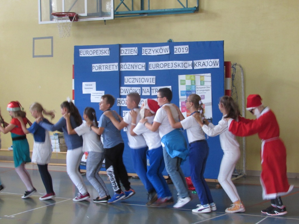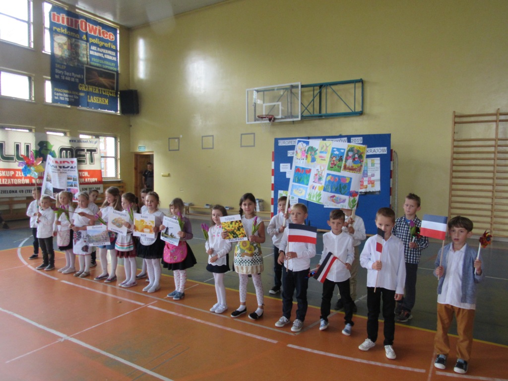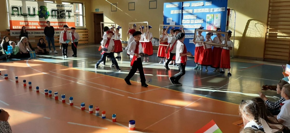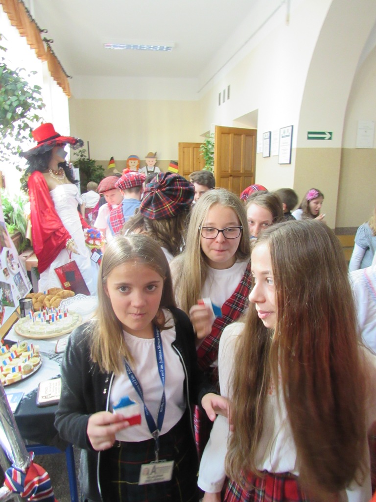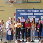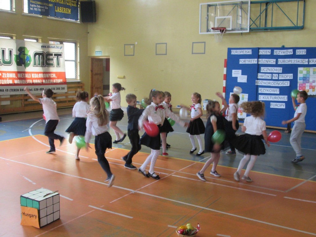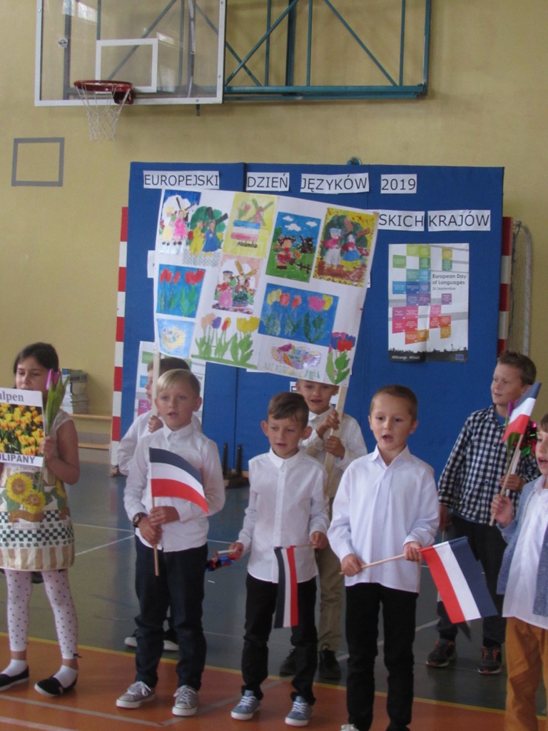 Gdy we czwartek, 26 września, w szkole rozbrzmiały dźwięki „Ody do radości”, na sali gimnastycznej pojawiły się wszystkie klasy wraz z nauczycielami. Każda klasa reprezentowała jeden z 16 europejskich krajów objętych projektem. Uroczysty przemarsz reprezentacji z 16 europejskich krajów rozpoczął szkolny finał projektu. Szymon Kostrzeba i Piotr Damasiewicz z kl. VIa ubrani w tradycyjne stroje szkockie w towarzystwie Wiktorii Damasiewicz z kl. Va w stroju litewskim powitali obecną na sali gimnastycznej dyrekcję szkoły, uczniów oraz nauczycieli. Przypomnieli również, iż nie tylko podczas Europejskiego Dnia Języków, ale każdego dnia, należy pamiętać o tym, że inny język to inna wizja świata. Finał szkolnego projektu pod patronatem honorowym Przedstawicielstwa Komisji Europejskiej otwarła dyrektor szkoły, Wioletta Nowak. Część artystyczną, podczas której wystąpiły wszystkie klasy poprowadziła Amelia Tokarczyk z kl.VIIIa.