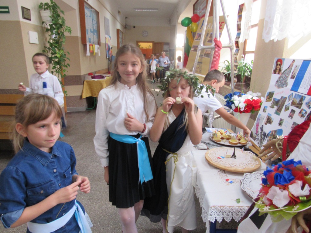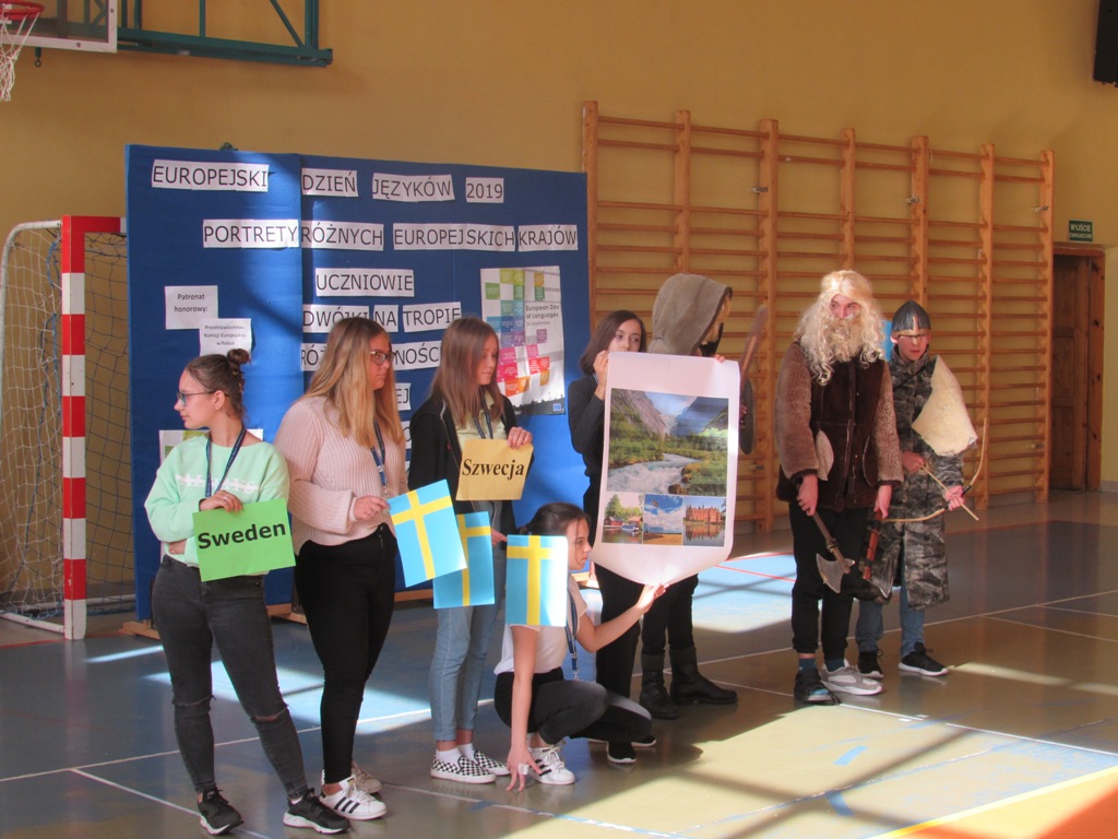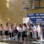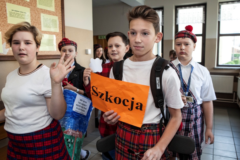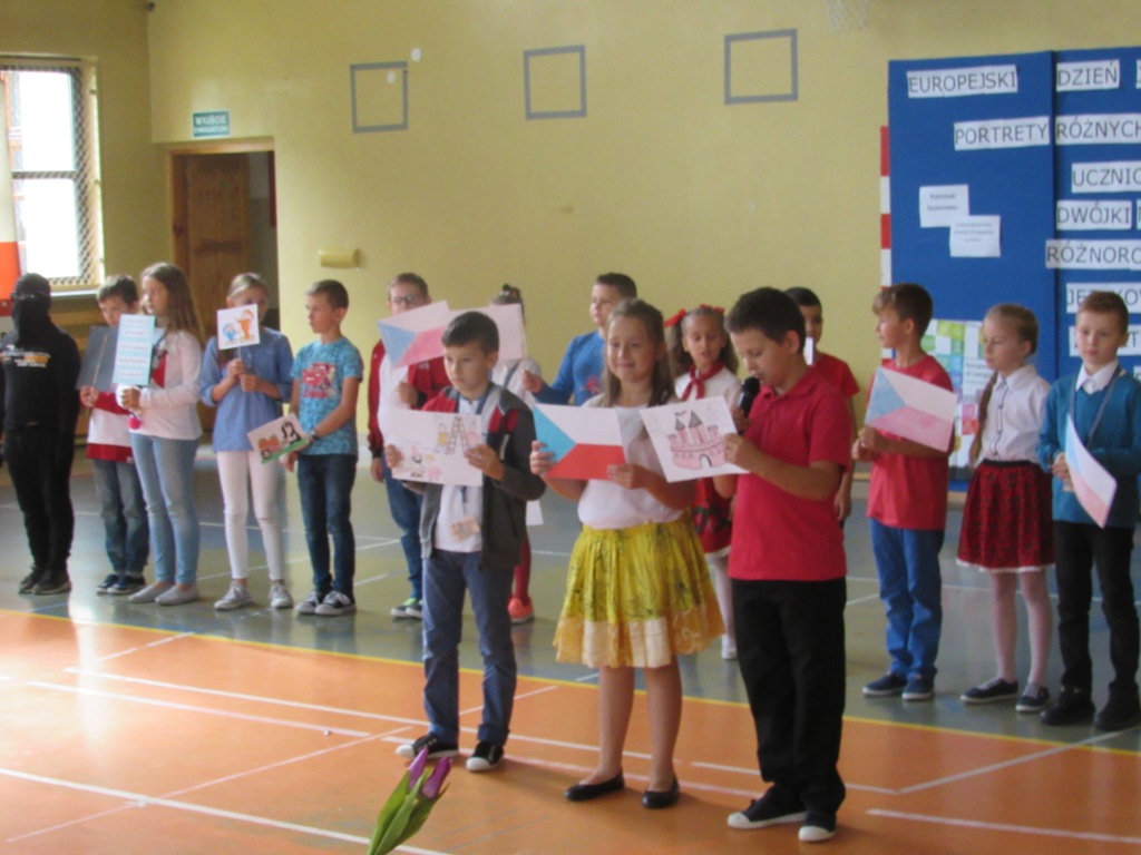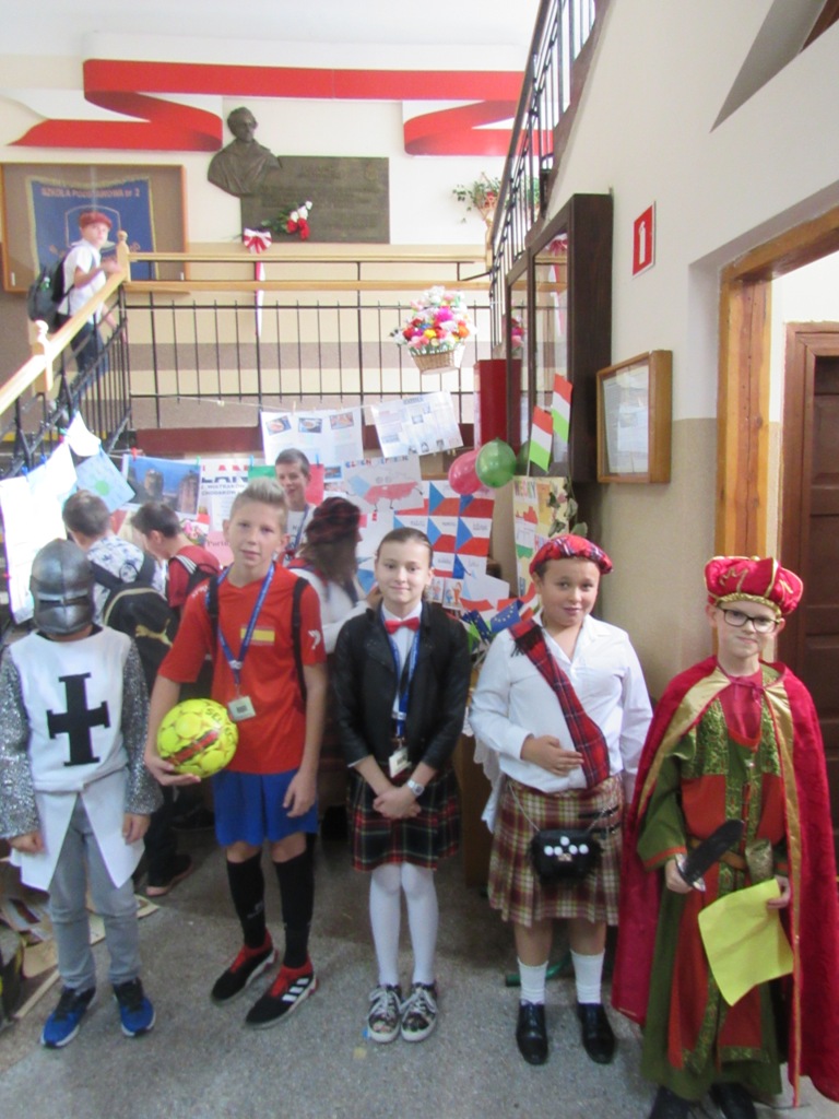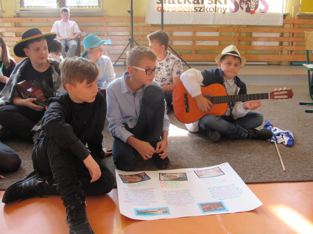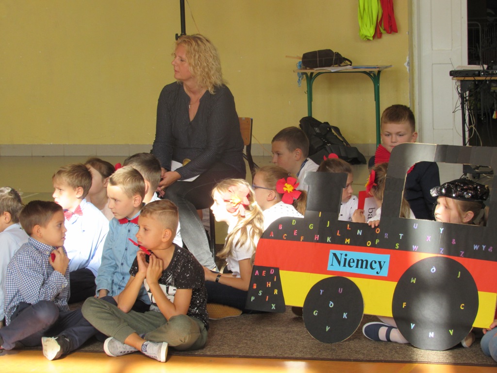 Gdy we czwartek, 26 września, w szkole rozbrzmiały dźwięki „Ody do radości”, na sali gimnastycznej pojawiły się wszystkie klasy wraz z nauczycielami. Każda klasa reprezentowała jeden z 16 europejskich krajów objętych projektem. Uroczysty przemarsz reprezentacji z 16 europejskich krajów rozpoczął szkolny finał projektu. Szymon Kostrzeba i Piotr Damasiewicz z kl. VIa ubrani w tradycyjne stroje szkockie w towarzystwie Wiktorii Damasiewicz z kl. Va w stroju litewskim powitali obecną na sali gimnastycznej dyrekcję szkoły, uczniów oraz nauczycieli. Przypomnieli również, iż nie tylko podczas Europejskiego Dnia Języków, ale każdego dnia, należy pamiętać o tym, że inny język to inna wizja świata. Finał szkolnego projektu pod patronatem honorowym Przedstawicielstwa Komisji Europejskiej otwarła dyrektor szkoły, Wioletta Nowak. Część artystyczną, podczas której wystąpiły wszystkie klasy poprowadziła Amelia Tokarczyk z kl.VIIIa.