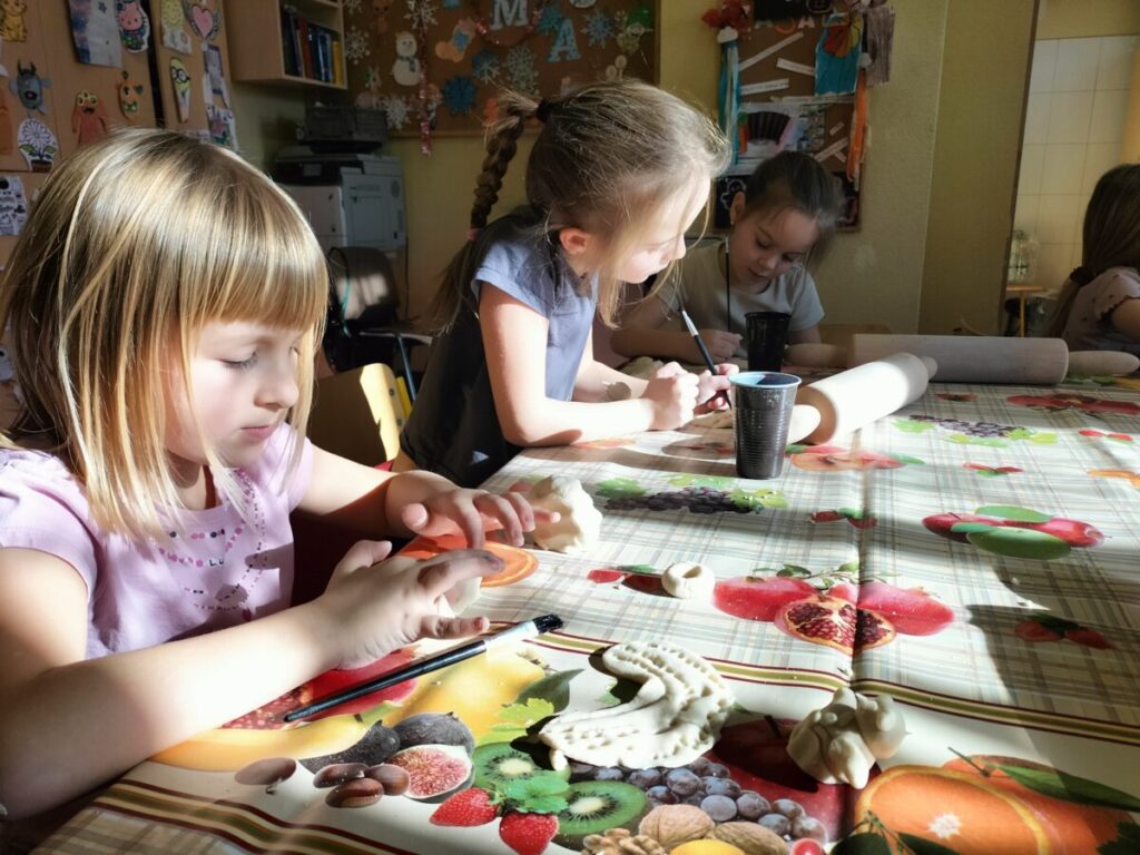 W ramach zajęć stacjonarnych uczestnicy zimowiskawzięli udział w warsztatachz masy porcelanowej i masy solnej, podczas których każdy mógł samodzielnie wykonać pracę według własnego pomysłu i fantazji.