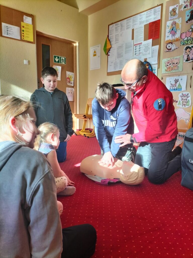 Podsumowaniem zajęć stacjonarnych było spotkanie z Prezesem Polskiego Czerwonego Krzyża w Starym Sączu – Panem Andrzejem Lisem, który przeprowadził warsztaty z Pierwszej Pomocy Przedmedycznej. Odbyły się one w formie prelekcji oraz zajęć praktycznych, tak aby każdy chętny mógł wykonać masaż serca na fantomie.