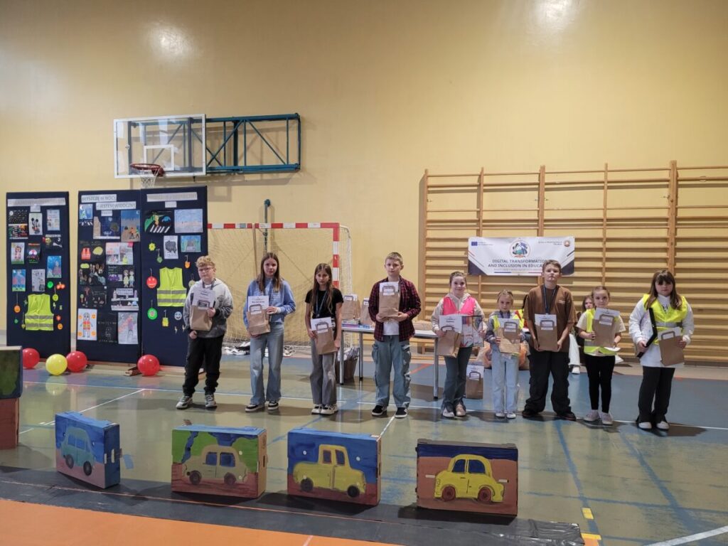 Zagraniczni goście mieli okazję nie tylko podziwiać talent i kreatywność polskich uczniów, ale także poznać polskie metody promowania bezpieczeństwa w ruchu drogowym. Ich obecność podkreśliła europejski wymiar programu i stała się wspaniałą okazją do wymiany doświadczeń edukacyjnych. Co więcej, na zakończenie uroczystości, wszyscy uczestnicy mobilności z Rumunii otrzymali praktyczne opaski odblaskowe, ufundowane przez firmę Rolbud–Materiały Budowlane z Gołkowic Górnych, aby bezpiecznie i widocznie przemieszczali się po ulicach w swojej miejscowości w Rumunii.