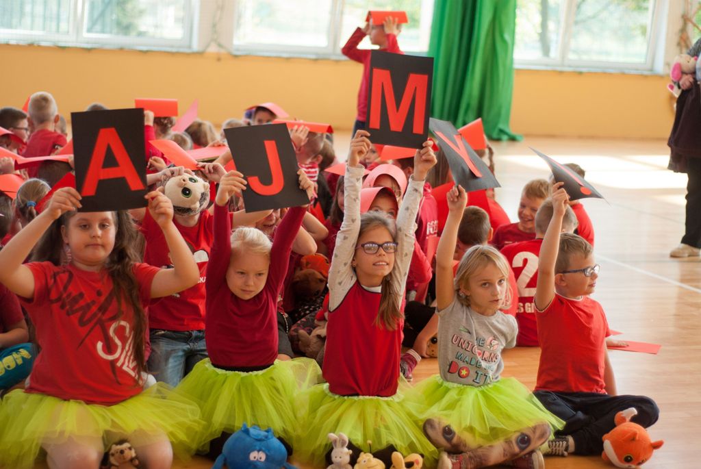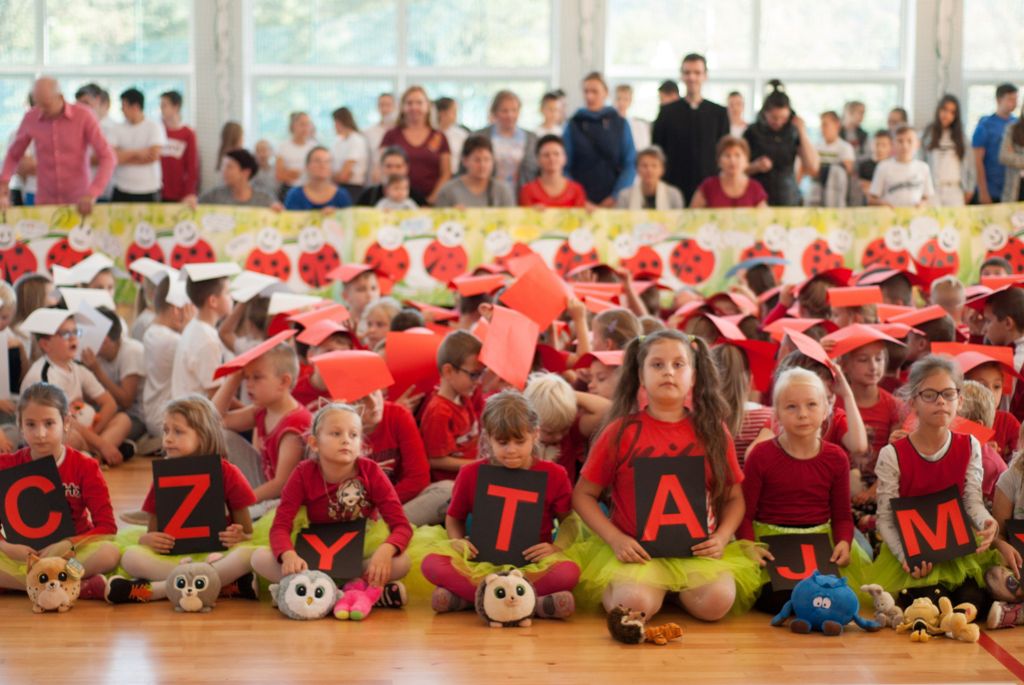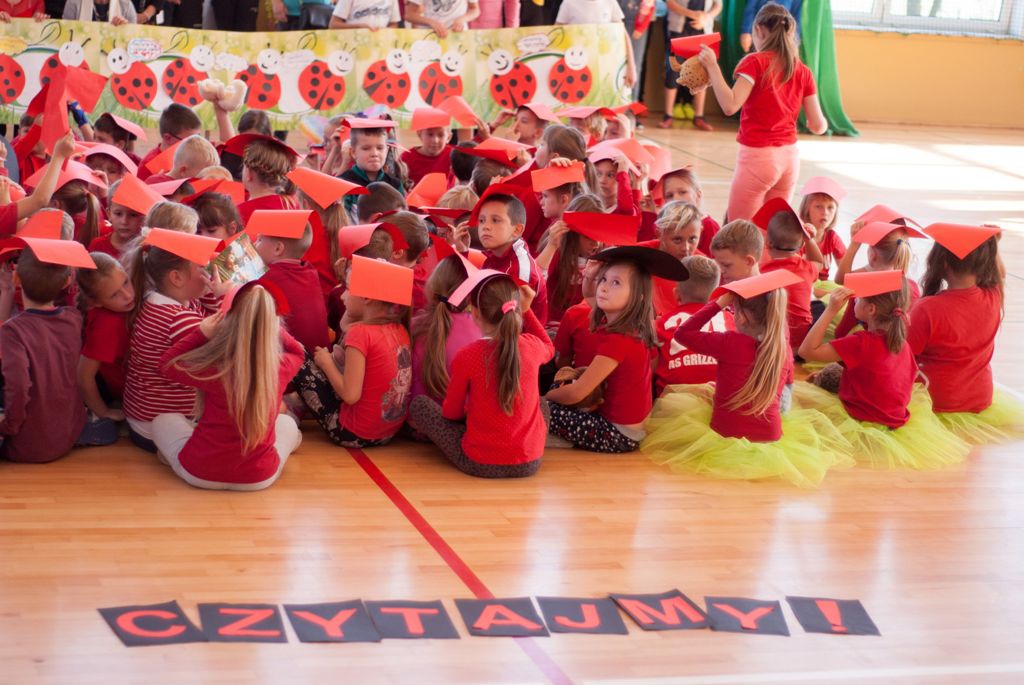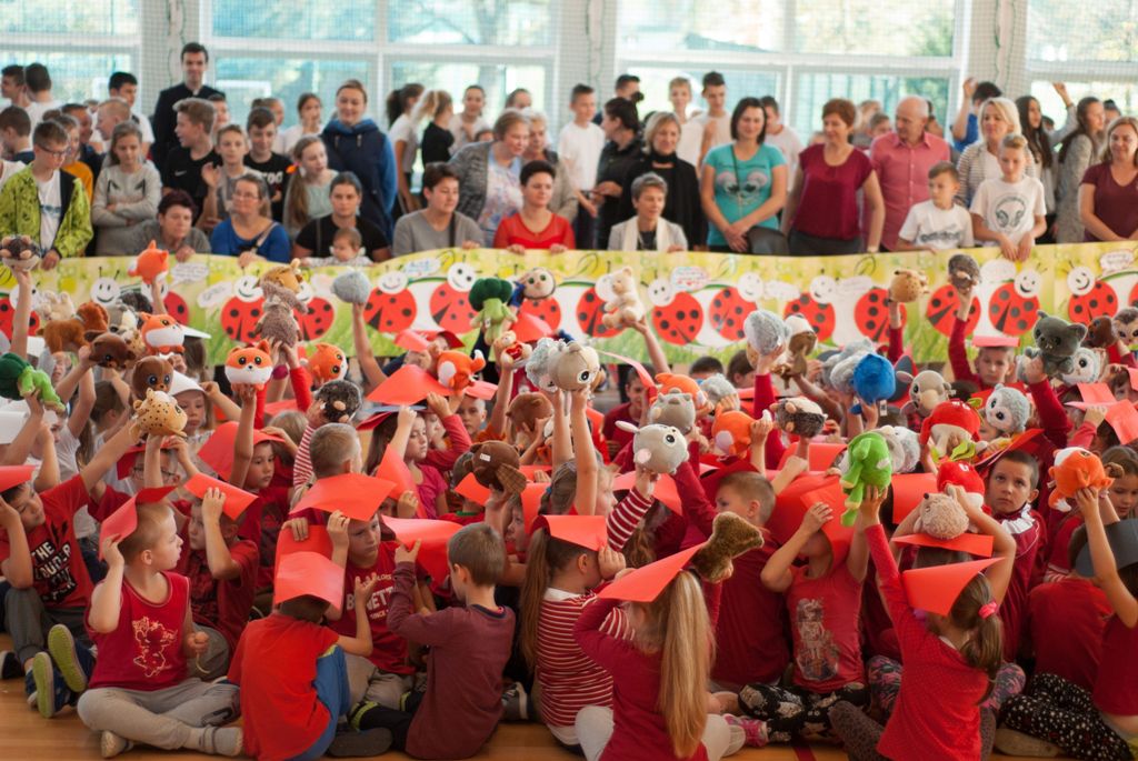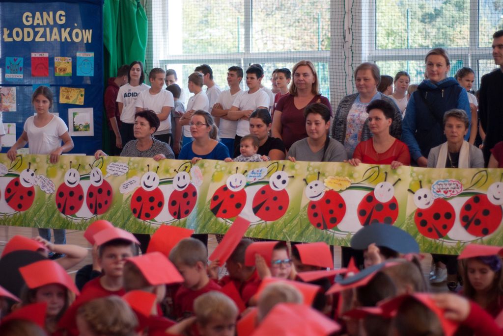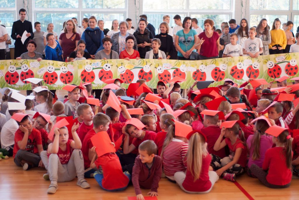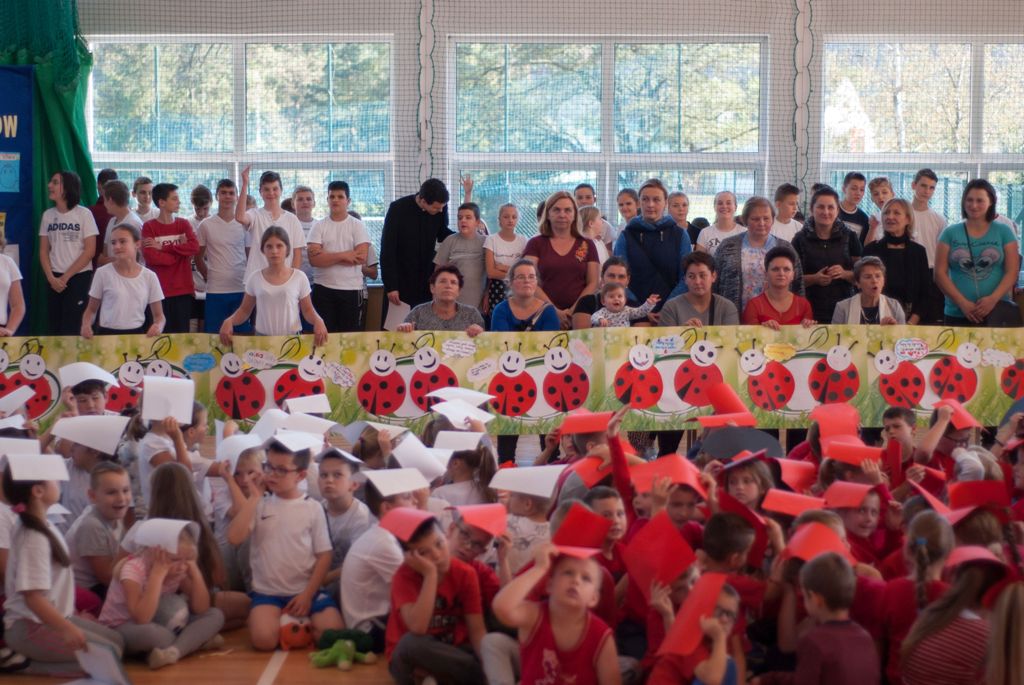 W uroczystości uczestniczyli także starsi uczniowie klas IV –VIII, rodzice i dziadkowie , w sumie 111 osób. Spotkanie uczniów klas I- III ( 129 uczestników) ubranych w czerwone, białe i czarne podkoszulki zakończyło się wspólnym „żywym” zdjęciem – biedronki.