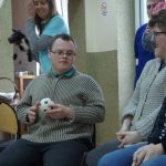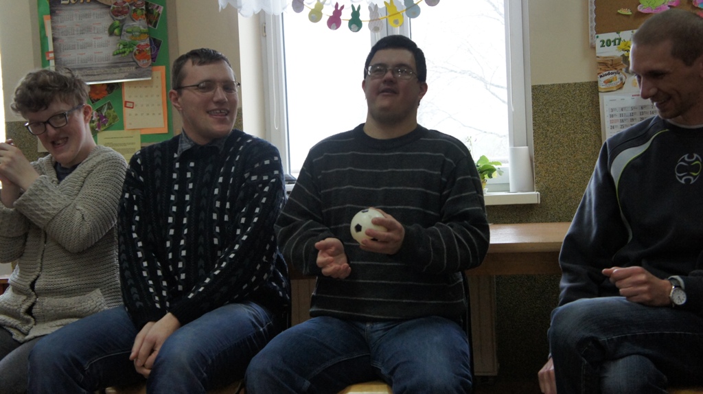 ze sobą miły czas. Zabawa z piłką była okazją do wzajemnego poznania się, przedstawienia swoich pasji i zainteresowań. Zebrani doskonale się bawili, bez jakiejkolwiek nieśmiałości opowiadali o sobie. Po zabawie dzieci zwiedzały ośrodek. Mali goście testowali sprzęt rehabilitacyjny, oglądali pracownie i wytwory podopiecznych z drewna, gliny, ceramiki.