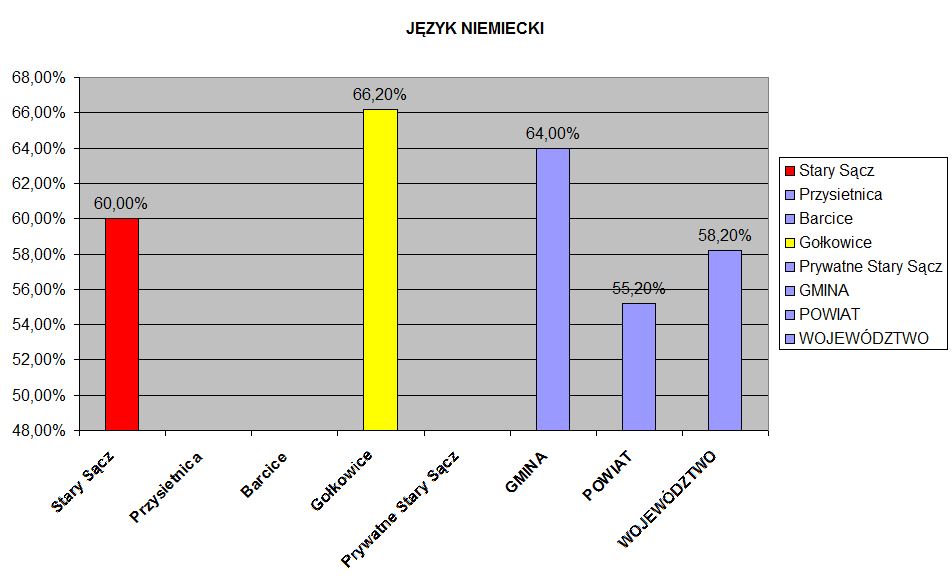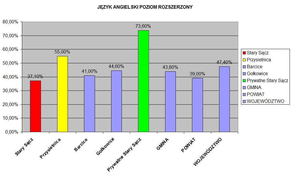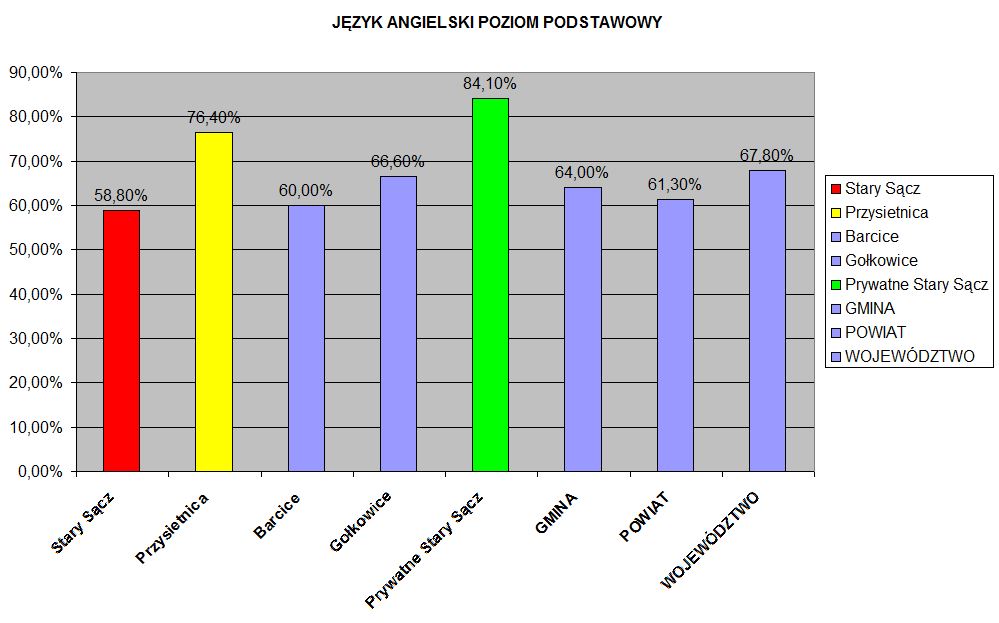 JĘZYK ANGIELSKI (poziom podstawowy) to „Pięta Achillesa” publicznego gimnazjum im Juliusza Słowackiego w Starym Sączu, które wypadło najsłabiej -dużo poniżej gminy, powiatu jak i województwa -58,8%- nie zadowala. Niewiele lepiej poradzili sobie uczniowie z Barcic i Gołkowic.Natomiast prywatne Gimnazjum w Starym Sączu oraz Przysietnica mogą się poszczycić bardzo dobrą znajomością tego języka. Poziom zdawalności znacznie przewyższa gminę, powiat jak i województwo. 76,4 % w Przysietnicy oraz 84,1% w Prywatnym Gimnazjum zadowala! Gołkowice ze swoim wynikiem 66,6% wskoczyli wyżej niż gmina i powiat!