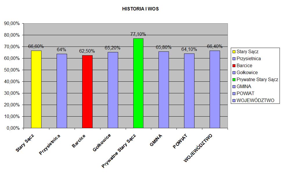 HISTORIA I WOS to przedmioty, które w Starym Sączu wypadły najlepiej, zarówno w publicznym jak i prywatnym gimnazjum.Najsłabiej zaprezentowali się uczniowie z Zespołu Szkół w Barcicach.