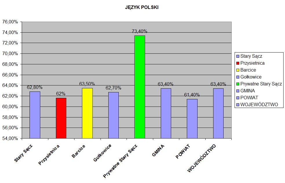 Z naszego ojczystego JĘZYKA POLSKIEGO bardzo dobrze poradzili sobie uczniowie z Barcic, których wynik przewyższył ogólne wyniki z gminy, powiatu oraz województwa. Najsłabiej napisali uczniowie z Zespołu Szkół w Przysietnicy.
