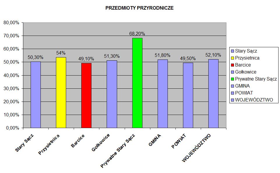 Z PRZEDMIOTÓW PRZYRODNICZYCH bardzo dobrze spisali się uczniowie z Przysietnicy, a najgorzej (słabiej niż gmina, powiat i województwo) wypadli uczniowie z Barcic.