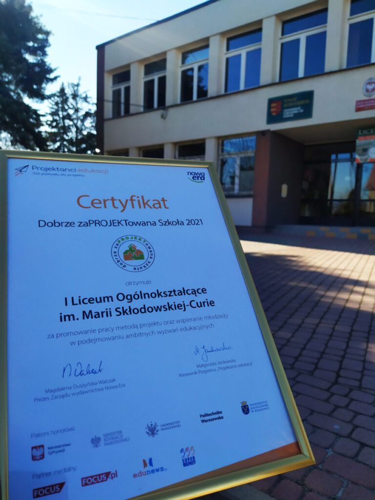 Liceum Ogólnokształcące im. Marii Skłodowskiej-Curie w Starym Sączu po raz kolejny zostało uhonorowane certyfikatem  „Dobrze zaPROJEKTowanej Szkoły” i znalazło się na mapie ogólnopolskich placówek dydaktyczno – wychowawczych, które podejmują ambitne wyzwania edukacyjne umożliwiające uczniom odkrywanie pasji i twórcze doskonalenie kompetencji XXI wieku. Honorowy patronat na konkursem sprawuje Minister Edukacji Narodowej, Uniwersytet Jagielloński, Uniwersytet Warszawski, Politechnika Warszawska i Ministerstwo Cyfryzacji.