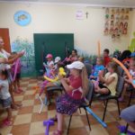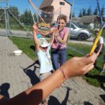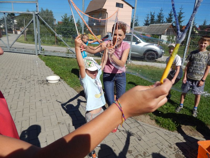 W pierwszym dniu wszyscy mieli możliwość zrobienia ogromnej bańki mydlanej, co dla niektórych było wielkim wyzwaniem. Próbowali oni także swoich sił podczas formowania balonów, z których powstały najrozmaitsze zwierzątka, kwiaty i inne fantazyjne przedmioty. W ramach zapoznania się uczestników zorganizowano zabawy z chustą animacyjną. Po pełnych wrażeń zajęciach uczestnicy zregenerowali siły podczas poczęstunku i pełni energii chętnie oddawali się szaleństwu wspólnego tańca w rytm letnich przebojów pod przewodnictwem pani Dagmary Salamon z Ośrodka Terapeutycznego „ADA”, która przygotowała wszystkie pozostałe zajęcia animacyjne.