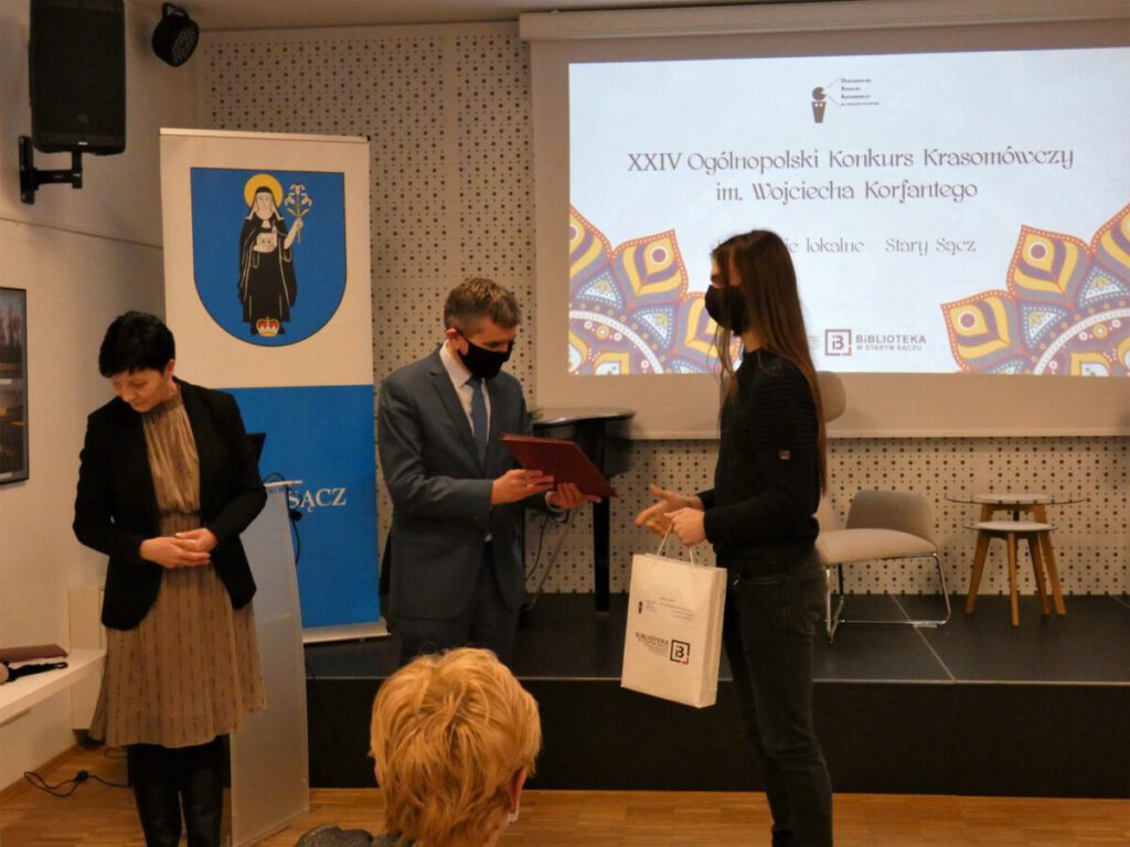 Uczniowie – zwycięzcy prestiżowych eliminacji I etapu Ogólnopolskiego Konkursu Krasomówczego, nad którym honorowy patronat sprawują m.in.: Minister Edukacji Narodowej, Wydział Polonistyki Uniwersytetu Jagiellońskiego w Krakowie oraz Rada Języka Polskiego w Warszawie – nagrodzeni i wyróżnieni przez jury: Nadia Zychowicz, Michał Janus, Aleksandra Kutak, Klaudia Zaryczny – reprezentować będą swoje szkoły i powiat nowosądecki w eliminacjach regionalnych (II etap konkursu), które zaplanowano online w dniu 3 marca 2022 roku.