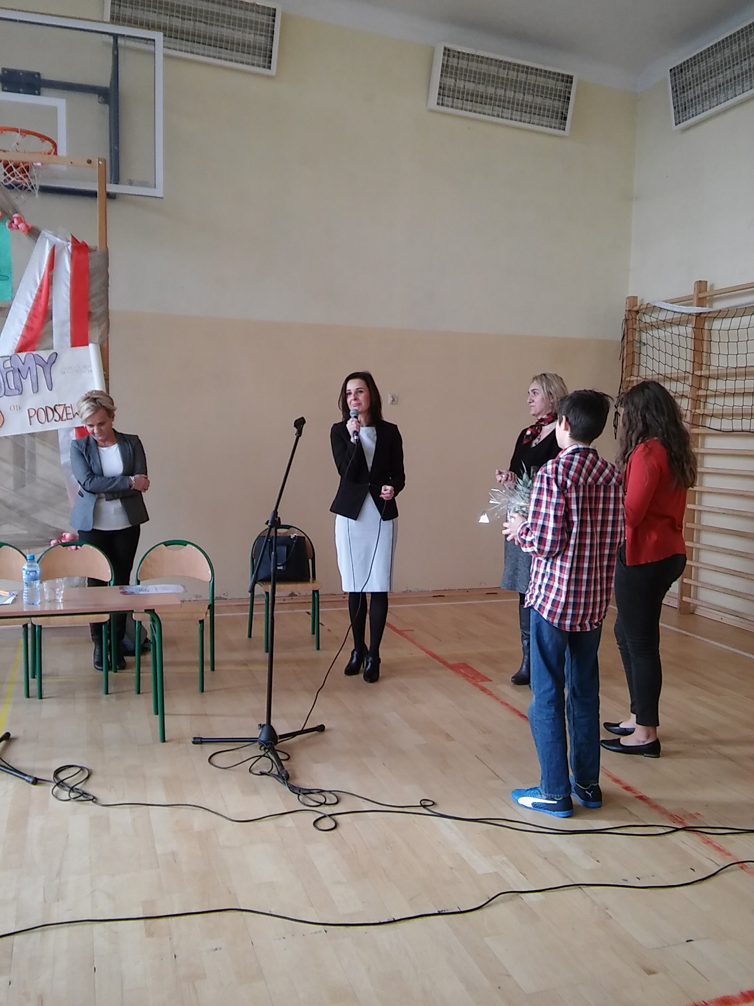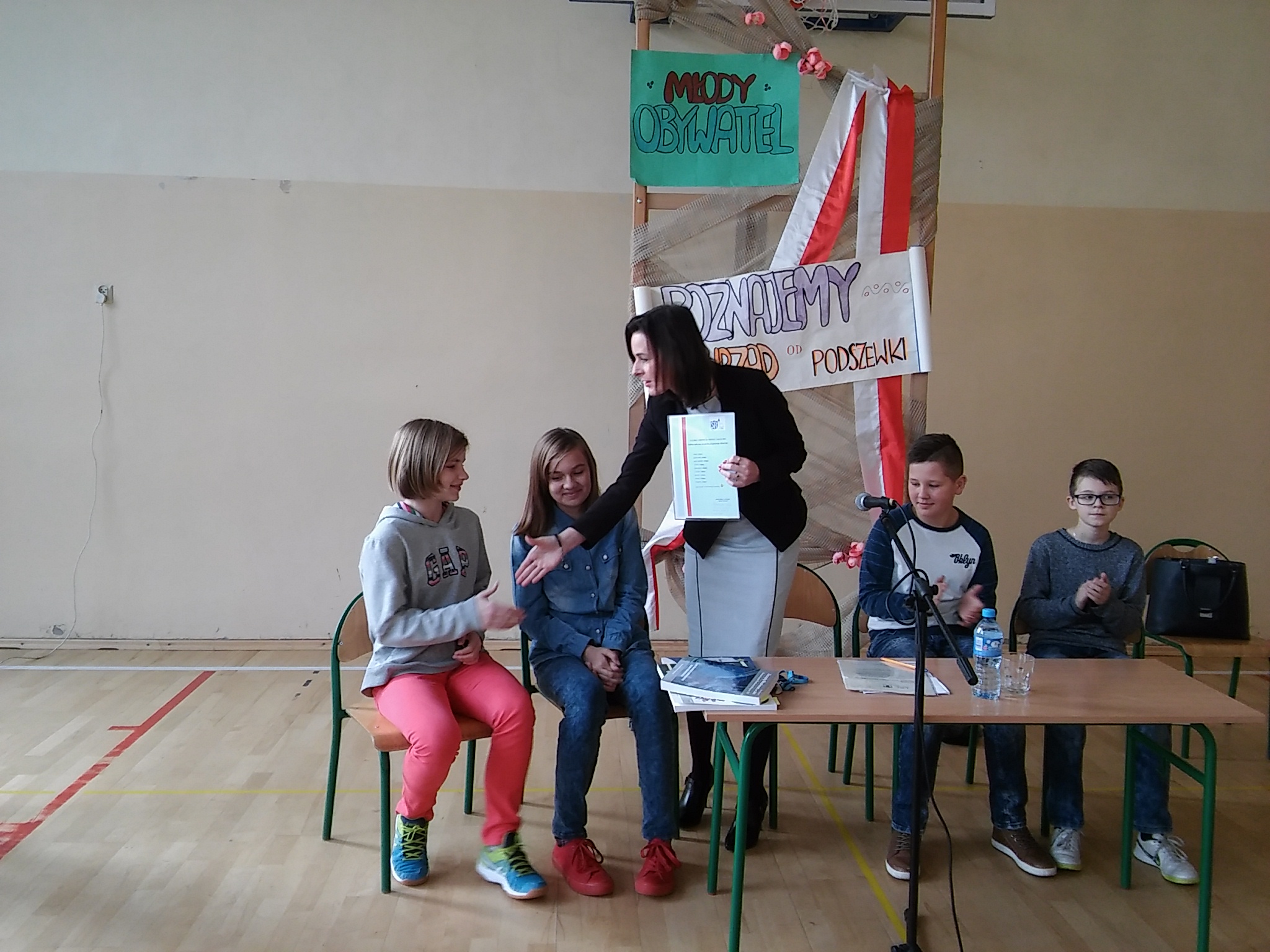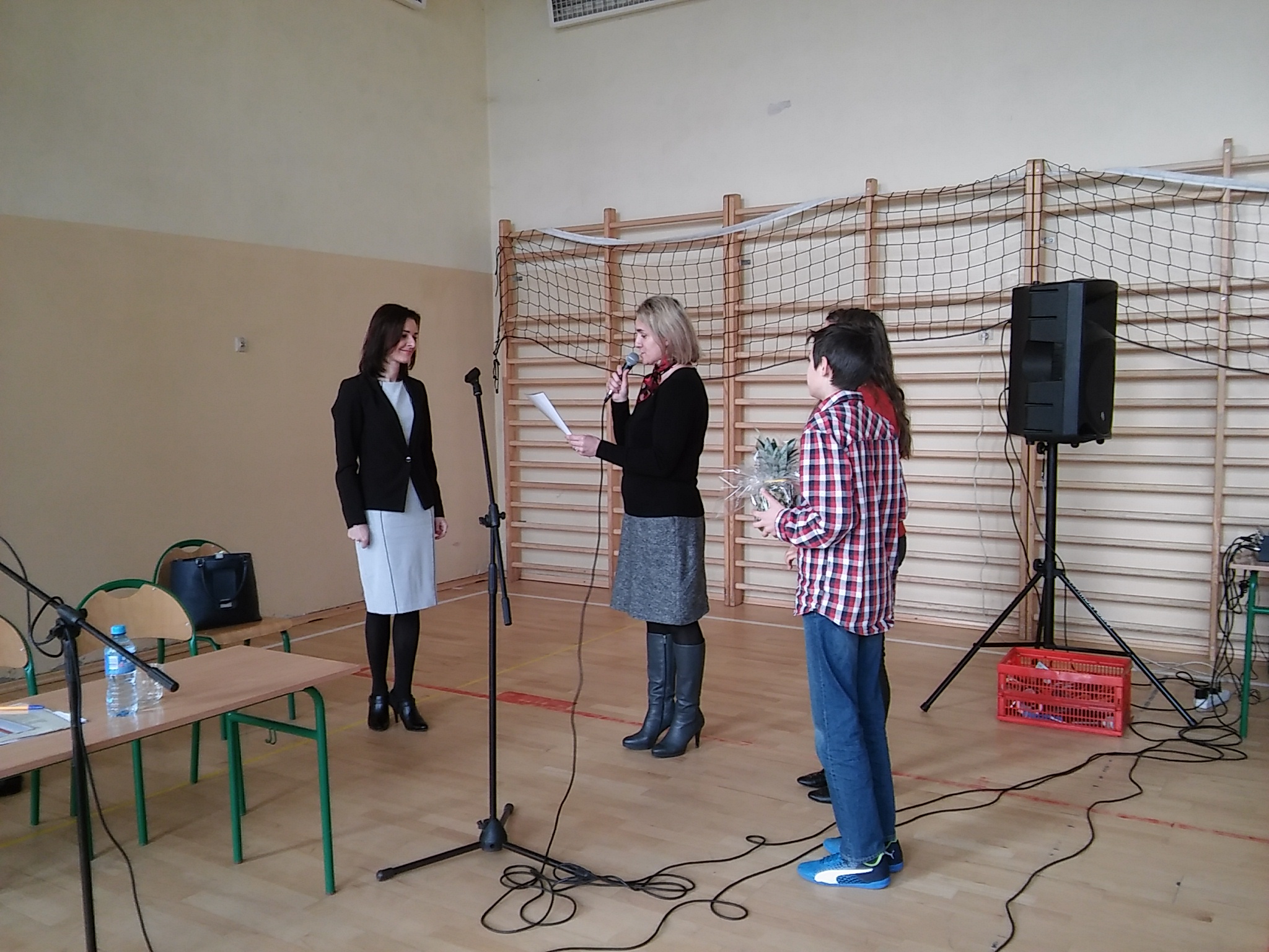 Świadectwo OMNIBUSA wręczyła Pani mgr Barbarze Porębskiej wicedyrektor Pani mgr Barbara Dyrek. Doceniając zaangażowanie Pani Dyrektor w inicjatywy na rzecz upowszechniania edukacji obywatelskiej wśród młodego pokolenia, wicedyrektor Pani mgr Elżbieta Bodziony wyróżniła gościa szkoły tytułem: „Urzędnika przyjaznego dzieciom”.