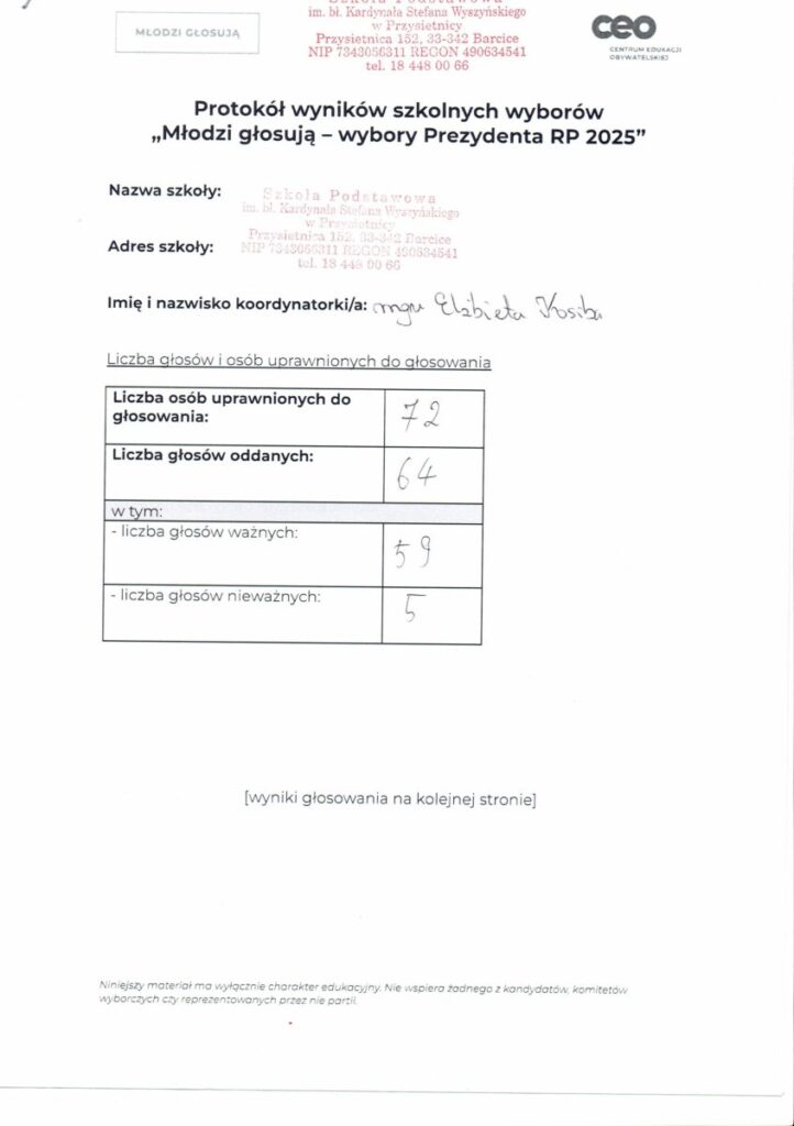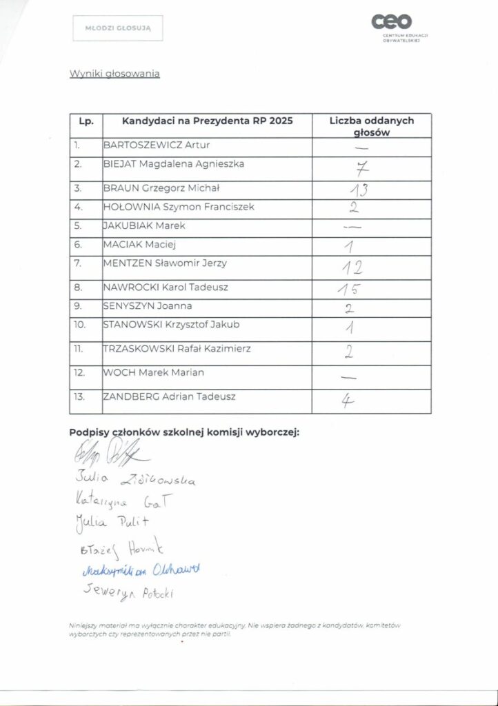 W głosowaniu udział wzięli uczniowie klasy 6, 7 oraz 8. Młodzież naszej szkoły dokonała już wyboru. Teraz czekamy jakiego wyboru dokonają dorośli.