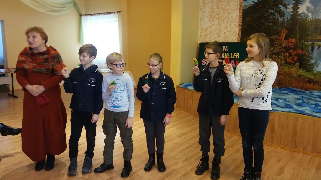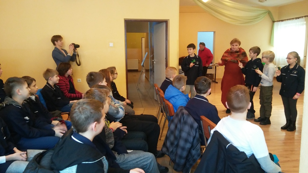 Kolejnym wyzwaniem dla uczestników stały się zabawy słowem. Autorka, wykorzystując swoje umiejętności pedagogiczne i aktorskie, bez trudności wciągała do zabawy kolejne grupy uczniów. Dzieci zmagały się z ćwiczeniami oddechowymi, intonacyjnymi, logopedycznymi. „Gimnastyka buzi i języka” przysporzyła im niemałych trudności, jednakże było przy tym też wiele zabawy. Nie nudzili się nawet ci, którzy nie zostali wywołani na scenę, gdyż pani Stadtmüller aktywizowała wszystkich uczestników. Mówiąc o rytmie w wierszu, autorka prezentowała różne ćwiczenia, powtarzane i naśladowane przez dzieci. Gdy na zewnątrz panowała minusowa temperatura, w auli biblioteki było gorąco: ręce przegrzewały się od klaskania, a nogi od tupania. Wszelkie wystukiwanki, wybijanki czy inne ćwiczenia ruchowe przyczyniały się do zrozumienia pojęcia rytmu w poezji.