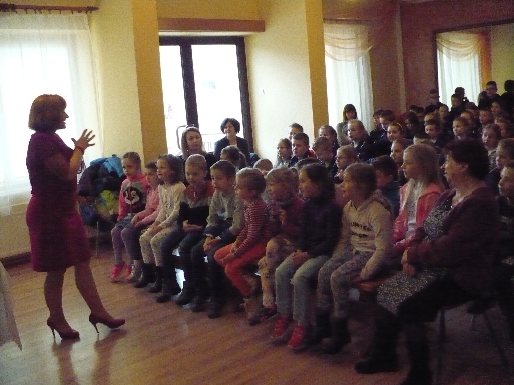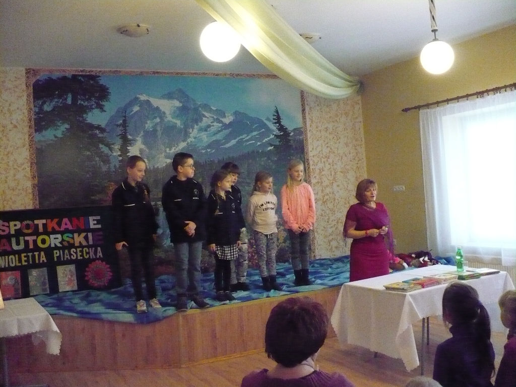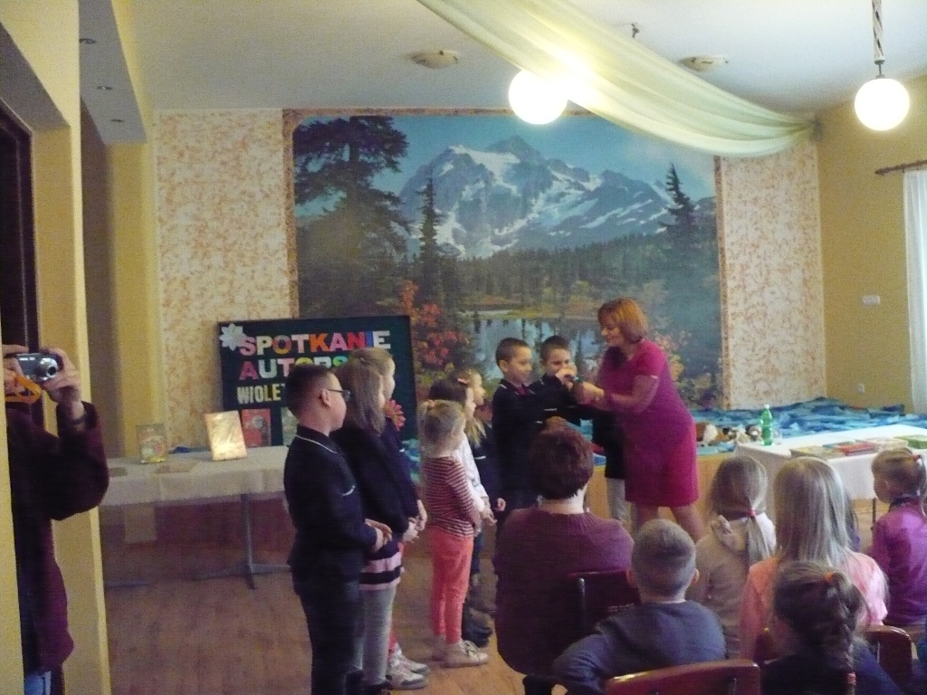 Pisarka, oprócz bajek, pisze również baśnie, wiersze i sztuki teatralne. W spotkaniu uczestniczyli uczniowie klas I – III oraz dzieci z oddziału przedszkolnego. Warsztaty okazały się bardzo interesujące i ciekawe. Były konkursy, zagadki oraz teatrzyk kukiełkowy. Zaskoczeniem dla dzieci było to, że pani Wioletta zna się bardzo dobrze na piłce nożnej. Po skończonym spotkaniu uczestnicy mogli zakupić książki z dedykacją od pisarki. Spotkanie bardzo podobało się małym czytelnikom, którzy, być może, z jeszcze większym entuzjazmem odwiedzać będą bibliotekę.