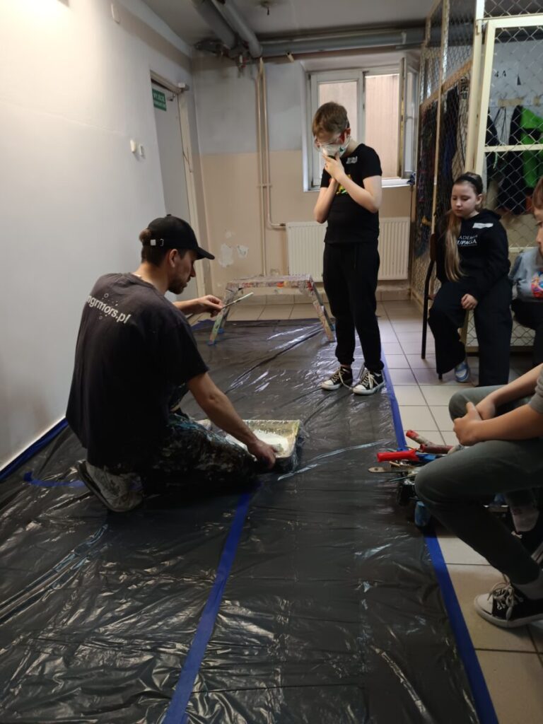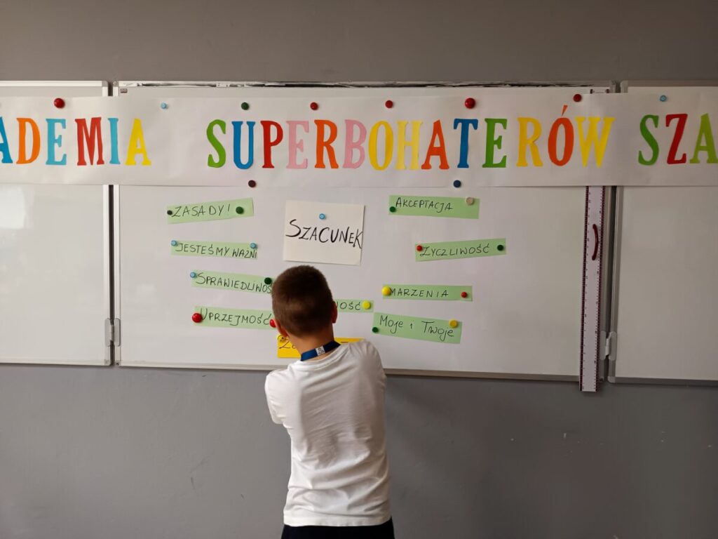W porozumieniu z Dyrekcją szkoły i wychowawcą klasy 3B, postanowił on zainicjować kolorową rewolucję w szkole, czyli przeprowadzić trzydniowe warsztaty wspólnego malowania muralu. Celem było zintegrowanie klasy, wspólna praca dzieci w atmosferze tolerancji dla swoich projektów, wzajemnego poszanowania siebie i swojej pracy. Do tej propozycji przyłączyła się również pani psycholog szkolna i pani pedagog, które na rozpoczęcie warsztatów poprowadziły dwugodzinne spotkanie zatytułowane „Akademia superbohaterów szacunku”. W zabawowej formie omawiana na nich była bardzo ważna tematyka wzajemnego szacunku, współpracy, kulturalnego komunikowania się, życzliwości, samoakceptacji i tolerancji wobec innych, a także wyznaczania i szanowania granic swoich i rówieśników. Spotkanie zwieńczone zostało zabawą w „pajęczynę”, gdzie umowna nić kulturalnego i życzliwego odnoszenia się wobec siebie oplotła całą klasę. Narysowane portrety superbohaterów i ich super mocy pomagających w sytuacjach konfliktowych, zostały umieszczone w sali klasy 3b, aby na co dzień przypominać dzieciom o kulturze i szacunku wobec siebie i innych.