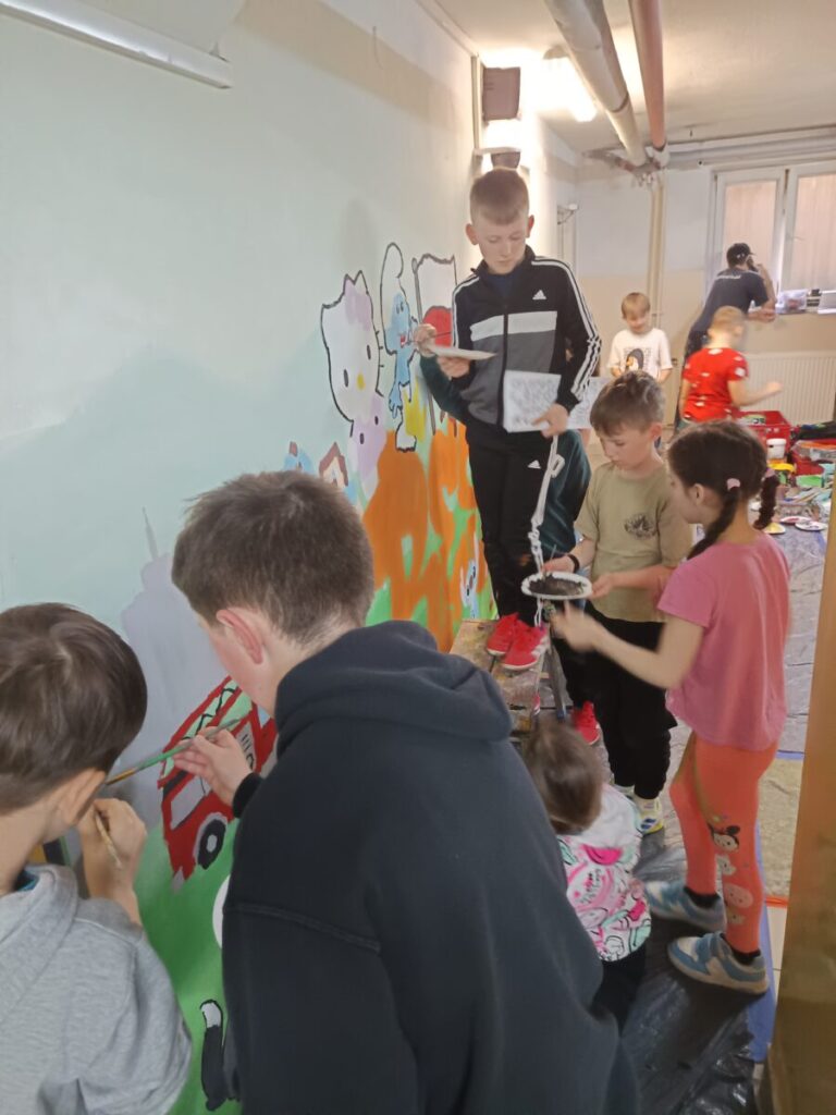 Trzeciego i czwartego dnia warsztatów dzieci od wykonania szkiców projektów przeszły do ich realizacji – wspólnego malowania. Po wcześniejszych wskazówkach mgr Morsa i pod jego czujnym okiem została namalowana na murze tzw. perspektywa powietrzna, czyli tło od najjaśniejszego u góry do ciemniejszego na dole. Potem na tym tle zaczęły się pojawiać malowane przez dzieci, a zaprojektowane wcześniej elementy muralu.
