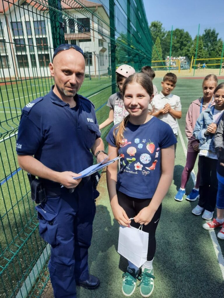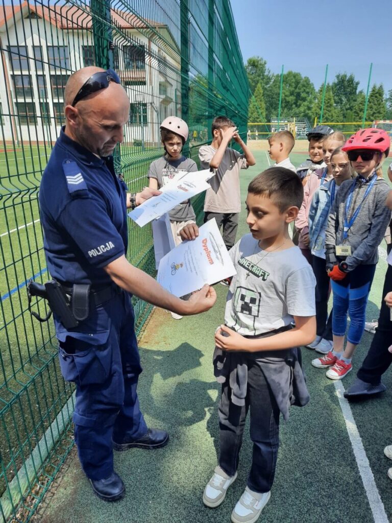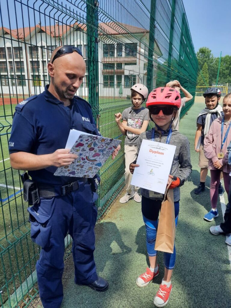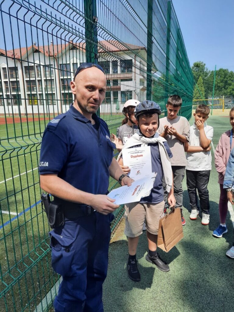 Każdy przejazd był uważnie oceniany przez sierż. szt. Macieja Kamińskiego z Komisariatu Policji w Starym Sączu, który oprócz sprawdzenia technicznych umiejętności dzieci, oceniał ich refleks i właściwą interpretację przepisów drogowych. Po zakończeniu egzaminu funkcjonariusz przeprowadził z uczniami krótką pogadankę na temat zasad bezpiecznego poruszania się po drogach – zarówno na rowerze, jak i pieszo czy na hulajnodze elektrycznej. Szczególną uwagę zwrócił na konieczność noszenia kasków ochronnych podczas jazdy.