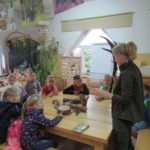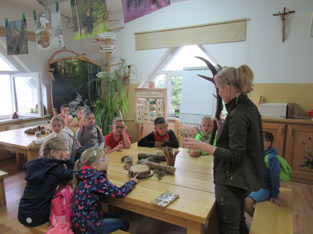 Docierają na Wolę Krogulecką, spoglądając jednocześnie na zamglone wierzchołki okolicznych gór i pochmurne niebo. W siedzibie Popradzkiego Parku Krajobrazowego spotykają się z Iwoną Szczygieł, głównym specjalistą do spraw edukacji, dzięki której w sali edukacyjnej Popradzkiego Parku Krajobrazowego poznają wiele ciekawostek przyrodniczych o rogach i porożach, sarnach i jeleniach, czy nawet hubach drzewnych. Następnie wyruszają na ścieżkę przyrodniczą „Het na hore bez skole”, czyli gdzieś w góry przez kamienie. Już na samym początku zostają podzieleni na dwie drużyny, bo w trakcie wędrówki czekać na nich będzie wiele wyzwań przyrodniczych i językowych. Przed nimi 3,5 km wędrówki wschodnią częścią pasma Jaworzyny Krynickiej, w trakcie której będą poznawać bogactwo przyrodnicze Popradzkiego Parku Krajobrazowego. Idą szlakiem, na którym na samym początku napotykają wędrujących wolniejszym tempem- ślimaków winniczków, a potem nawet dostrzegają nieżywego padalca, więc jest okazja do niespodziewanej lekcji anatomii na szlaku. Są też tropy jelenia na zabłoconym fragmencie ścieżki, więc przez chwilę wszyscy podążają tropem tajemniczego jelenia. Poznają więc różnicę między tropem a śladem w praktyce.