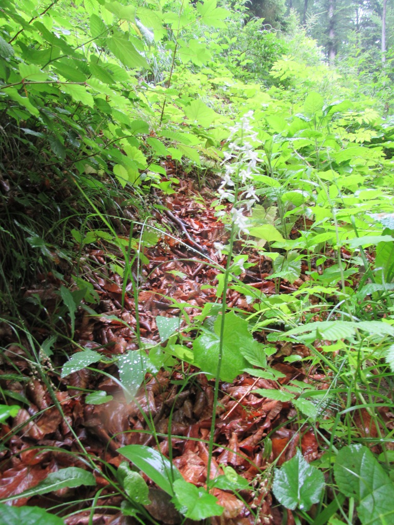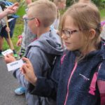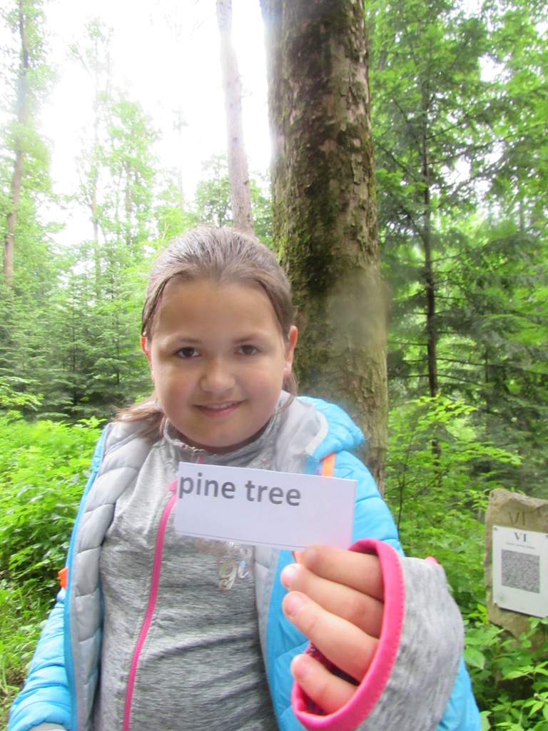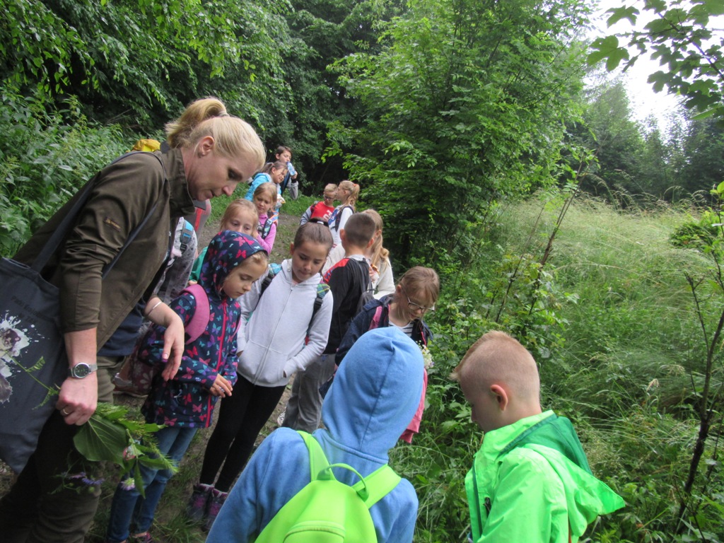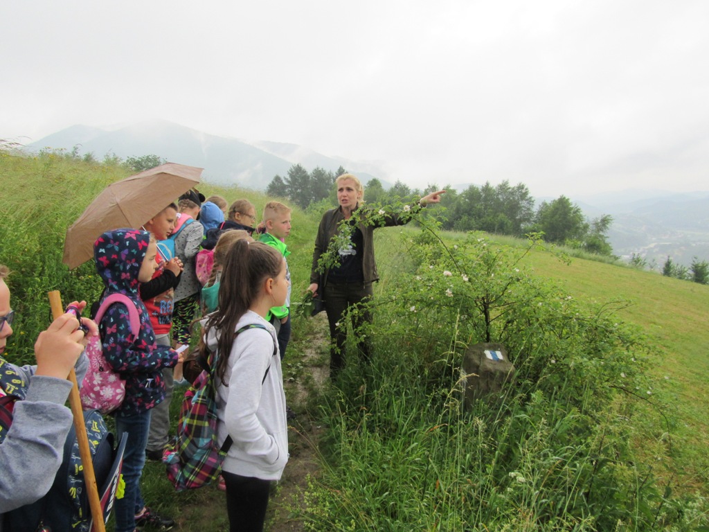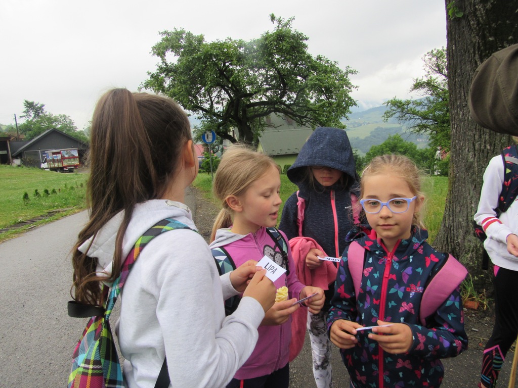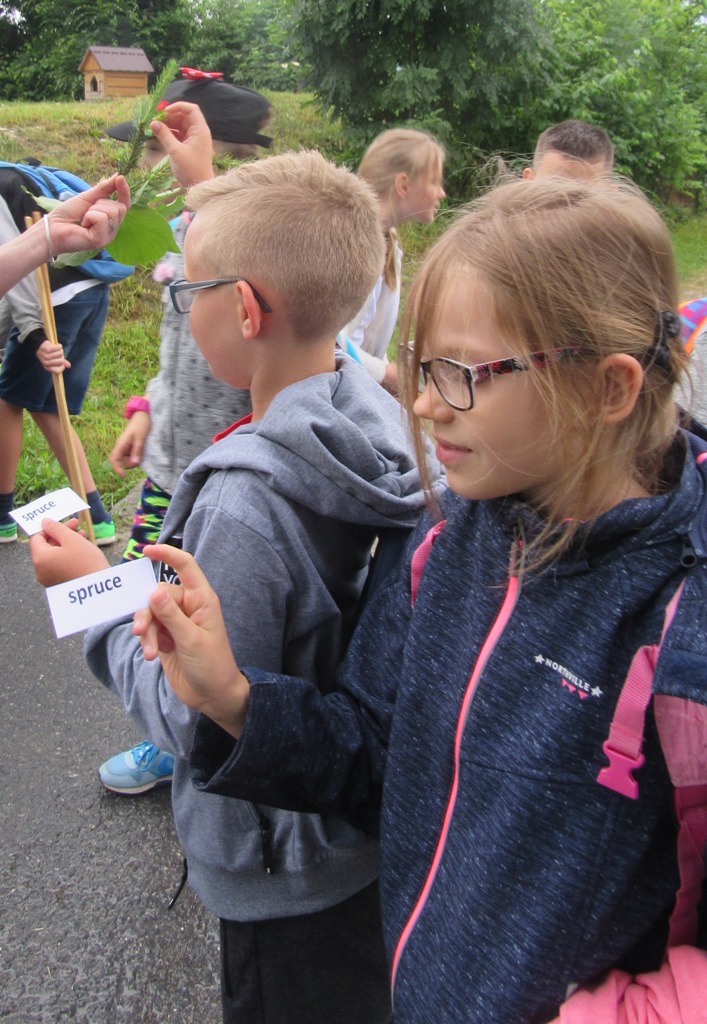 Podczas wędrówki pracownik Popradzkiego Parku Krajobrazowego, czyli sympatyczna pani Iwona opowiada o napotykanych gatunkach drzew: buku, jodle, świerku, dębie, sośnie, sośnie wejmutce, klonie jaworze, modrzewiu i jesionie. Zaczyna kropić deszcz, ale turystyczna ekipa osłonięta rozpostartymi nad nią gałęziami rosnących nieopodal szlaku buków, wędruje nieugięcie. I mają nawet szczęście móc oglądać w naturalnym środowisku objęty ochroną rzadki gatunek z rodziny storczykowatych, czyli podkolan biały. Wąchają więc kwitnące biały kwiaty, by móc delektować się ich przyjemną wonią. W trakcie wędrowania asystenci obu drużyn cały czas na poszczególnych etapach ścieżki przyrodniczej rozdają młodszym kolegom przygotowane przez nauczycieli języka angielskiego karty wyrazowe, na których z jednej strony znajdują się nazwy gatunków drzew spotykanych na szlaku w języku polskim, a z drugiej ich angielskie odpowiedniki. Mali wędrowcy uczą się nie tylko ciekawostek o różnych gatunkach drzew, ale także jak nazywać te drzewa w języku angielskim.