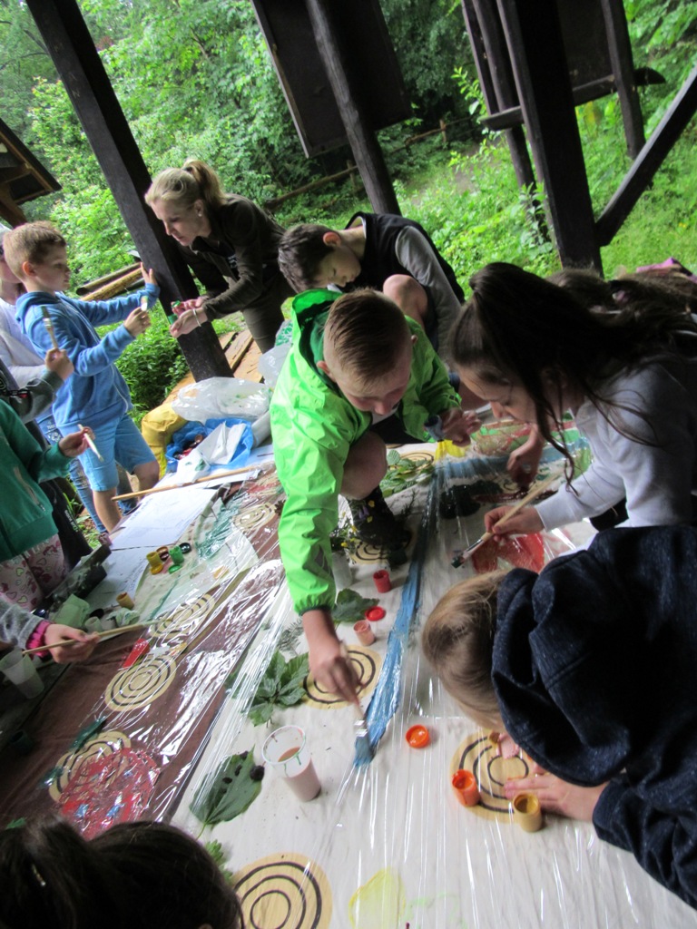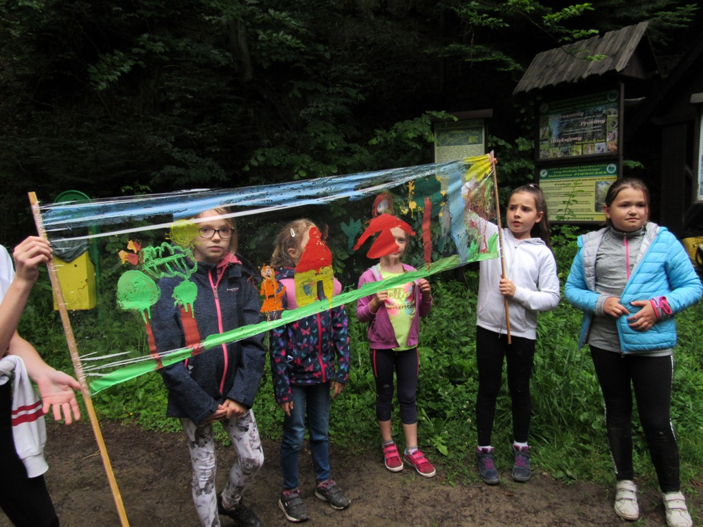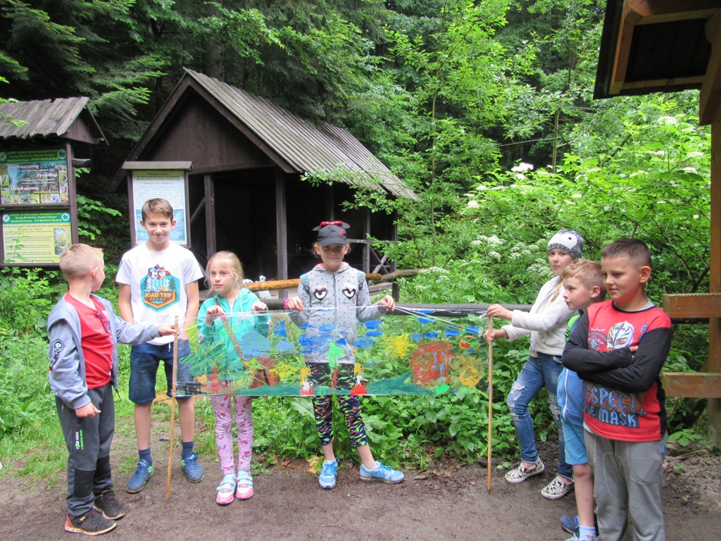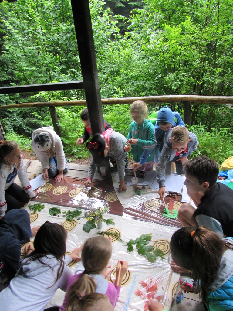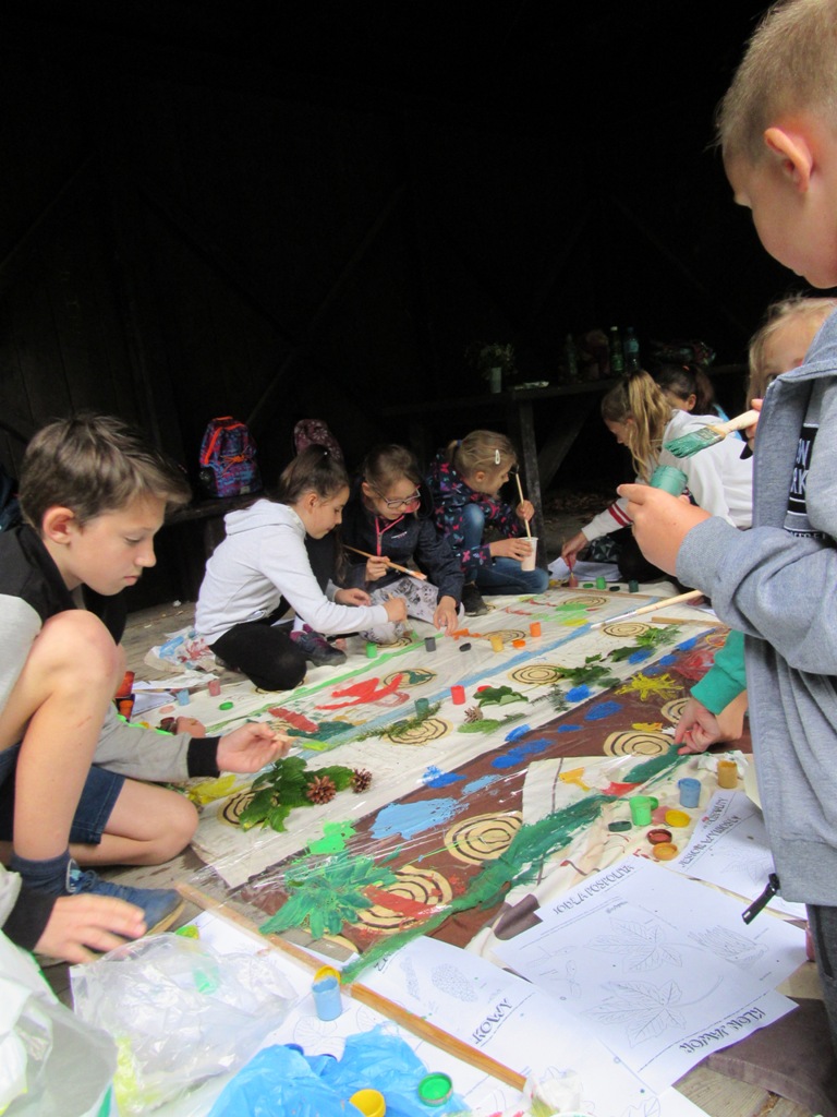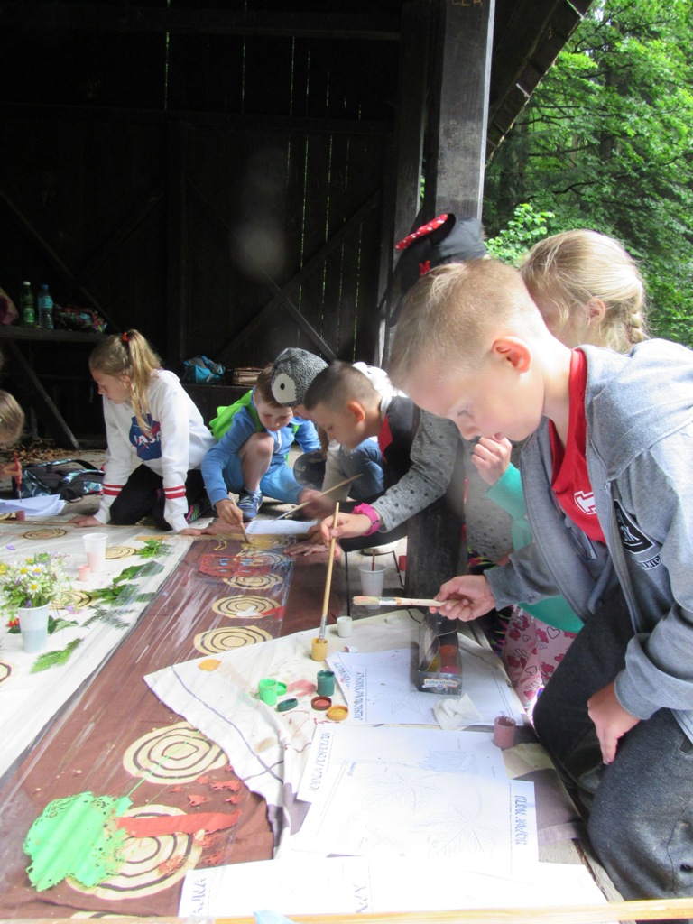 Pomimo padającego deszczu, po zabłoconym szlaku pokonują dzielnie 3,5 km. Potem pora na zasłużony odpoczynek pod drewnianą wiatą obok mostu nad Głębokim Jarem. W międzyczasie, gdy mali turyści jedzą przygotowane przez rodziców i spakowane do plecaków kanapki, czeka atrakcja, której pomysłodawcami są nauczyciele języka angielskiego. Na ziemi rozkładają ogromne płótna, a na nich rozciągniętą na listewkach folię. Obok ku zdziwieniu uczestników wyprawy pojawiają się wielobarwne farby i pędzle dla każdego. Na środku piękny bukiet polnych kwiatów zerwanych na łące przez Julkę. Są też karty pracy ze szkicami liści poznanych gatunków drzew, ich charakterystycznymi owocami i szyszkami. By ułatwić zadanie, pani Iwona Szczygieł z Popradzkiego Parku Krajobrazowego pokazuje raz jeszcze liście i gałązki drzew, o których w niezmiernie ciekawy sposób opowiadała wcześniej na szlaku.