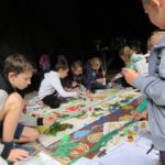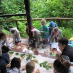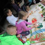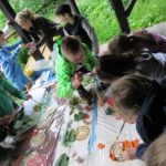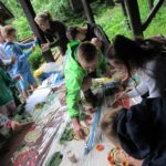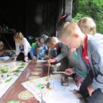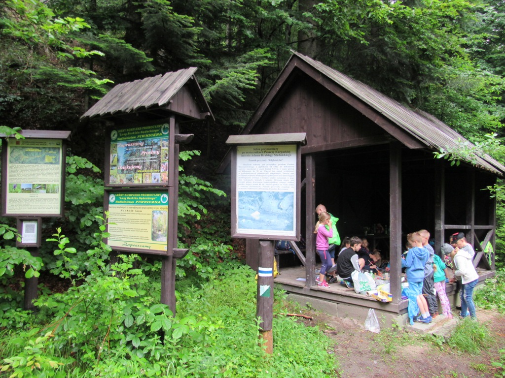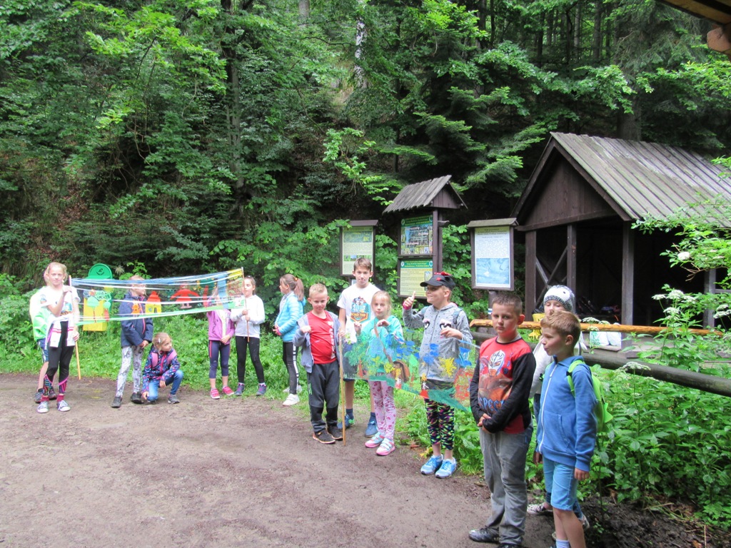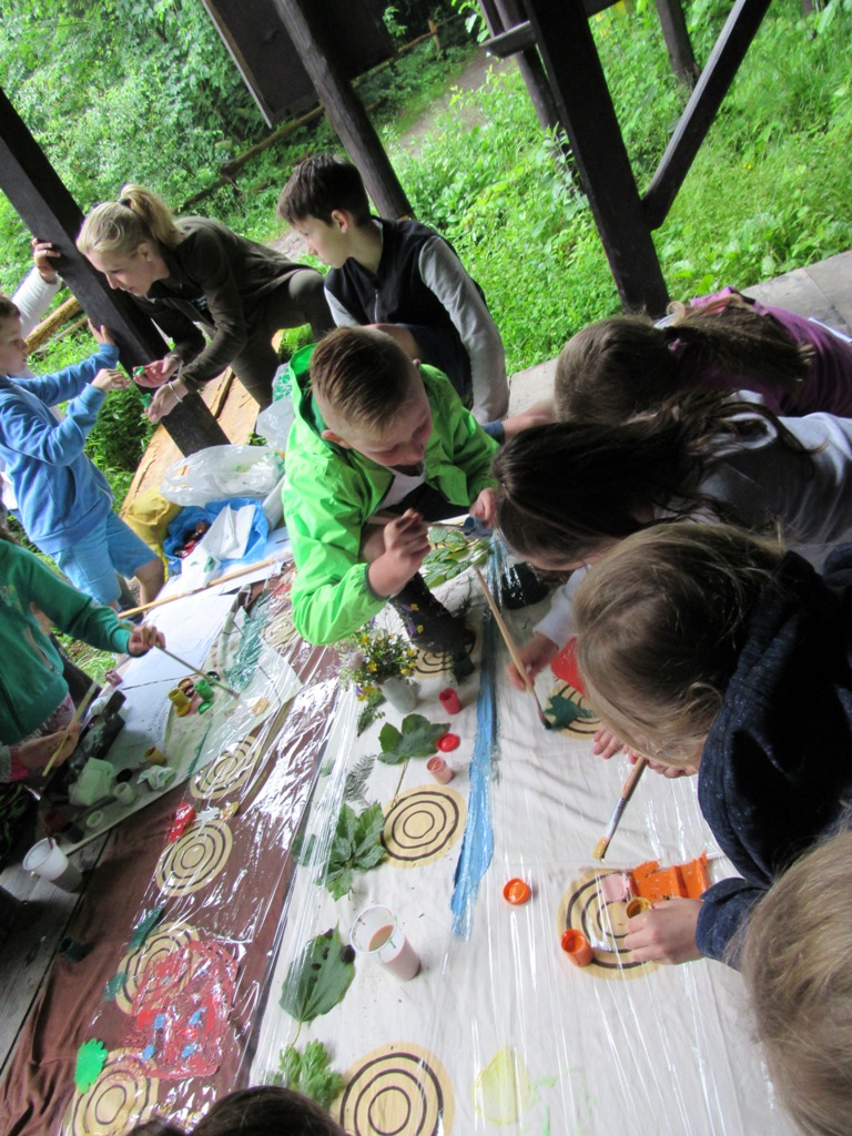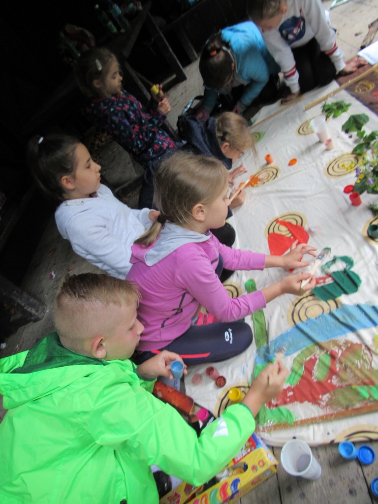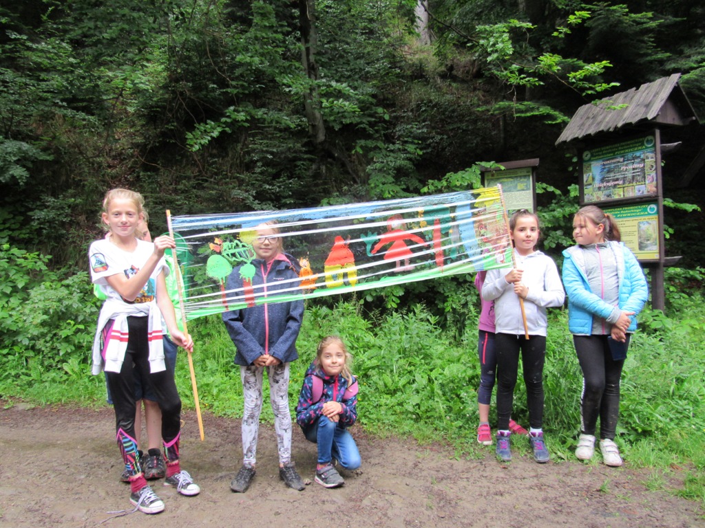 Pomimo padającego deszczu, po zabłoconym szlaku pokonują dzielnie 3,5 km. Potem pora na zasłużony odpoczynek pod drewnianą wiatą obok mostu nad Głębokim Jarem. W międzyczasie, gdy mali turyści jedzą przygotowane przez rodziców i spakowane do plecaków kanapki, czeka atrakcja, której pomysłodawcami są nauczyciele języka angielskiego. Na ziemi rozkładają ogromne płótna, a na nich rozciągniętą na listewkach folię. Obok ku zdziwieniu uczestników wyprawy pojawiają się wielobarwne farby i pędzle dla każdego. Na środku piękny bukiet polnych kwiatów zerwanych na łące przez Julkę. Są też karty pracy ze szkicami liści poznanych gatunków drzew, ich charakterystycznymi owocami i szyszkami. By ułatwić zadanie, pani Iwona Szczygieł z Popradzkiego Parku Krajobrazowego pokazuje raz jeszcze liście i gałązki drzew, o których w niezmiernie ciekawy sposób opowiadała wcześniej na szlaku.