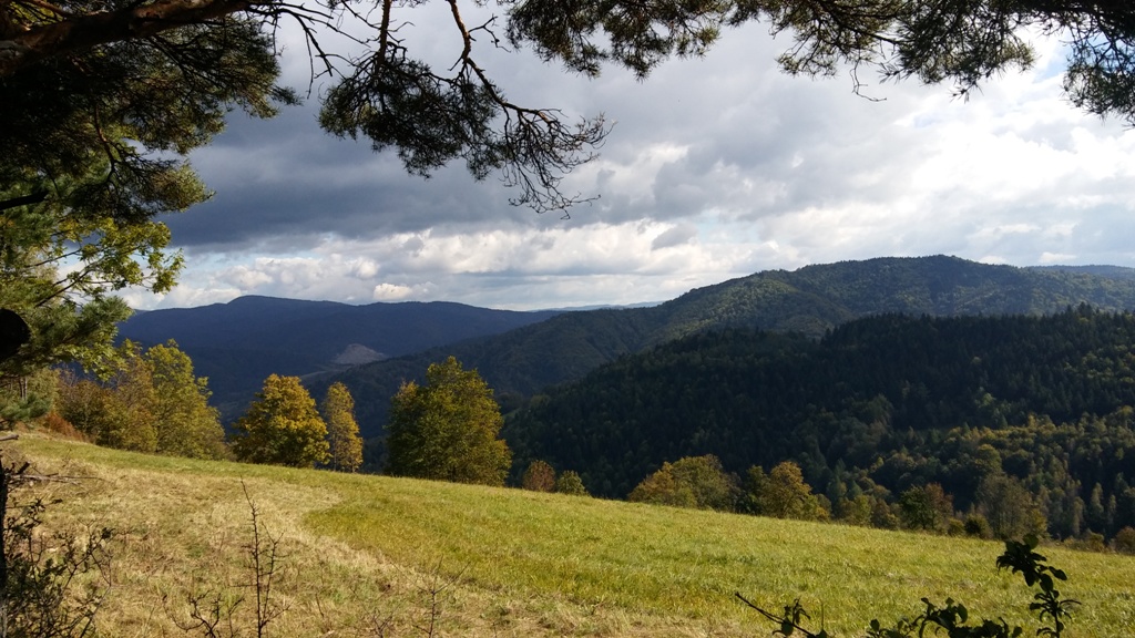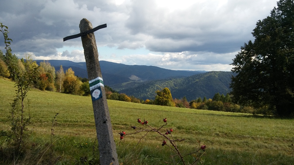 Pochmurny poranek na starosądeckim rynku nie zapowiadał tego, iż przez resztę dnia będziemy cieszyć się już tylko błękitem nieba i słońcem zamieniającym jesienne beskidzkie krajobrazy w prawdziwie bajkowe pejzaże. Gdy docieramy autobusem do Kosarzysk, podążamy za czerwonymi znakami w kierunku Obidzy.