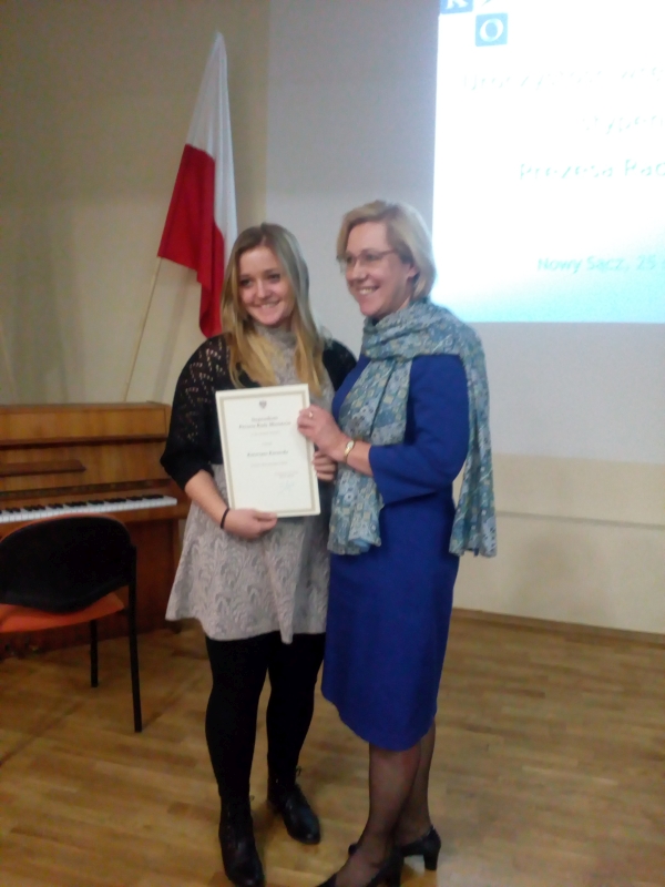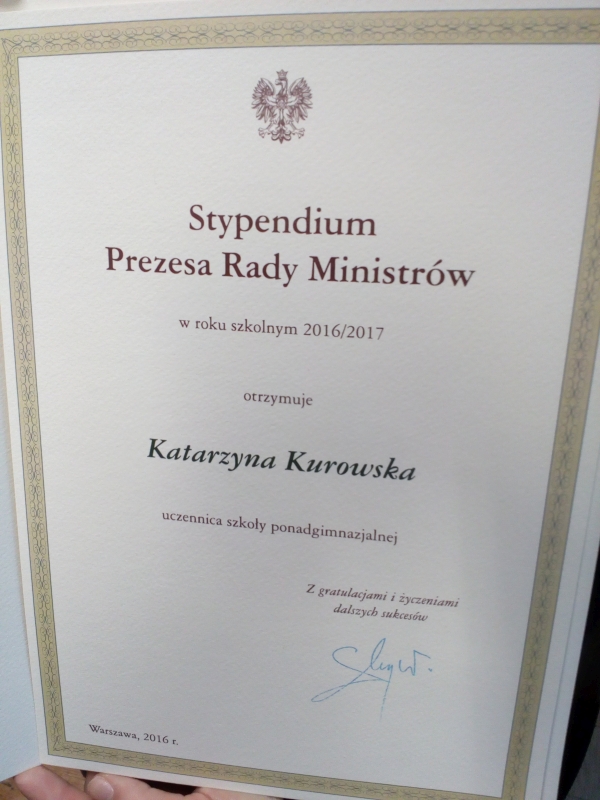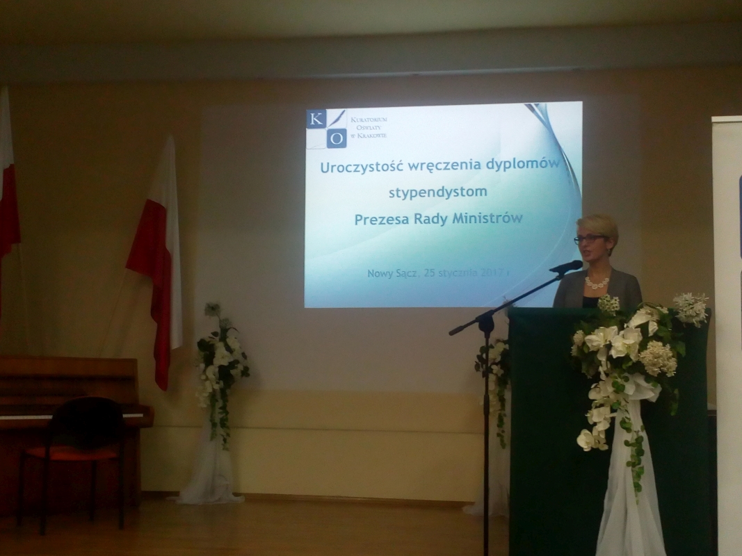 W środę 25 stycznia Katarzyna Kurowska -uczennica Zespołu Szkół Ponadgimnazjalnych im. ks. prof. Józefa Tischnera w Starym Sączu  – wraz z dyrektorem Grzegorzem Skalskim uczestniczyli w uroczystym spotkaniu z panią Barbarą Nowak – Małopolskim Kuratorem Oświaty, która osobiście wręczyła dyplomy najzdolniejszym, wyróżnionym Stypendium Prezesa Rady Ministrów.