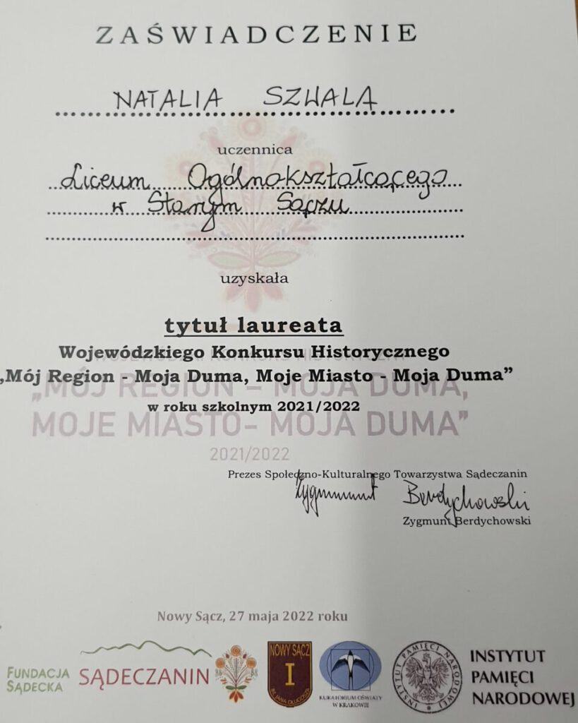 27 maja 2022 roku odbył się finał Wojewódzkiego Konkursu Historycznego „ Mój Region – Moja Duma. Moje Miasto – Moja Duma”, organizowanego przez Fundację Sądecką. Konkurs miał trzy etapy. Starosądeckie liceum reprezentowała Natalia Szwala z klasy III b, podopieczna pani Teresy Szewczyk. W pierwszym etapie Natalia przygotowała pracę pisemną na temat związków Karola Wojtyły i prymasa Stefana Wyszyńskiego z Sądecczyzną. W finale odbywającym się w Szkole Biznesu w Nowym Sączu najpierw uczestnicy rozwiązywali test a następnie odpowiadali na pytania z zakresu historii lokalnej. W kategorii szkół ponadpodstawowych bezkonkurencyjna okazała się Natalia Szwala, która została laureatką pierwszego miejsca. W nagrodę Natalia zdobyła stypendium Braci Potoczków oraz liczne upominki i nagrody książkowe. Już po raz drugi Natalia została laureatka tego konkursu stając się specjalistką w zakresie historii Ziemi Sądeckiej. Serdecznie gratulujemy Natalii i życzymy kolejnych sukcesów w konkursach historycznych.