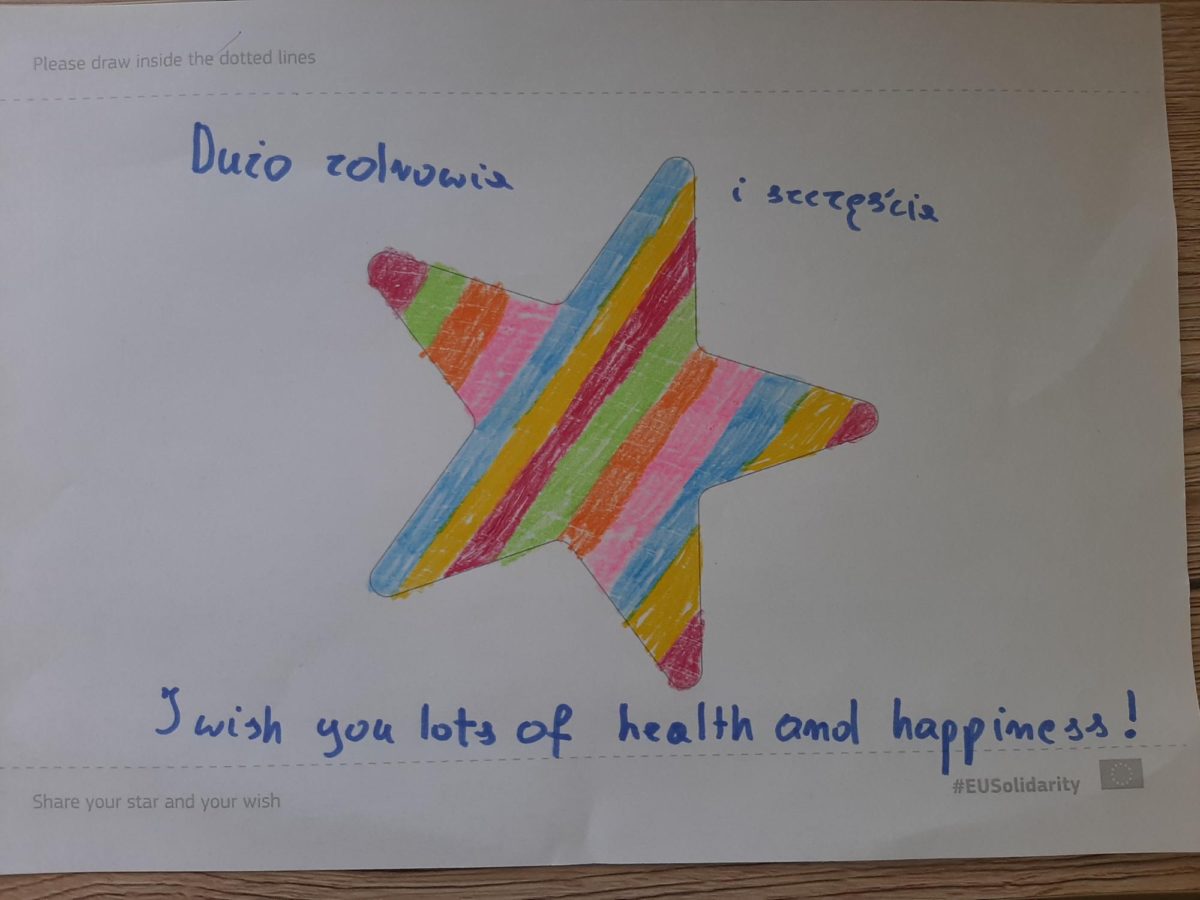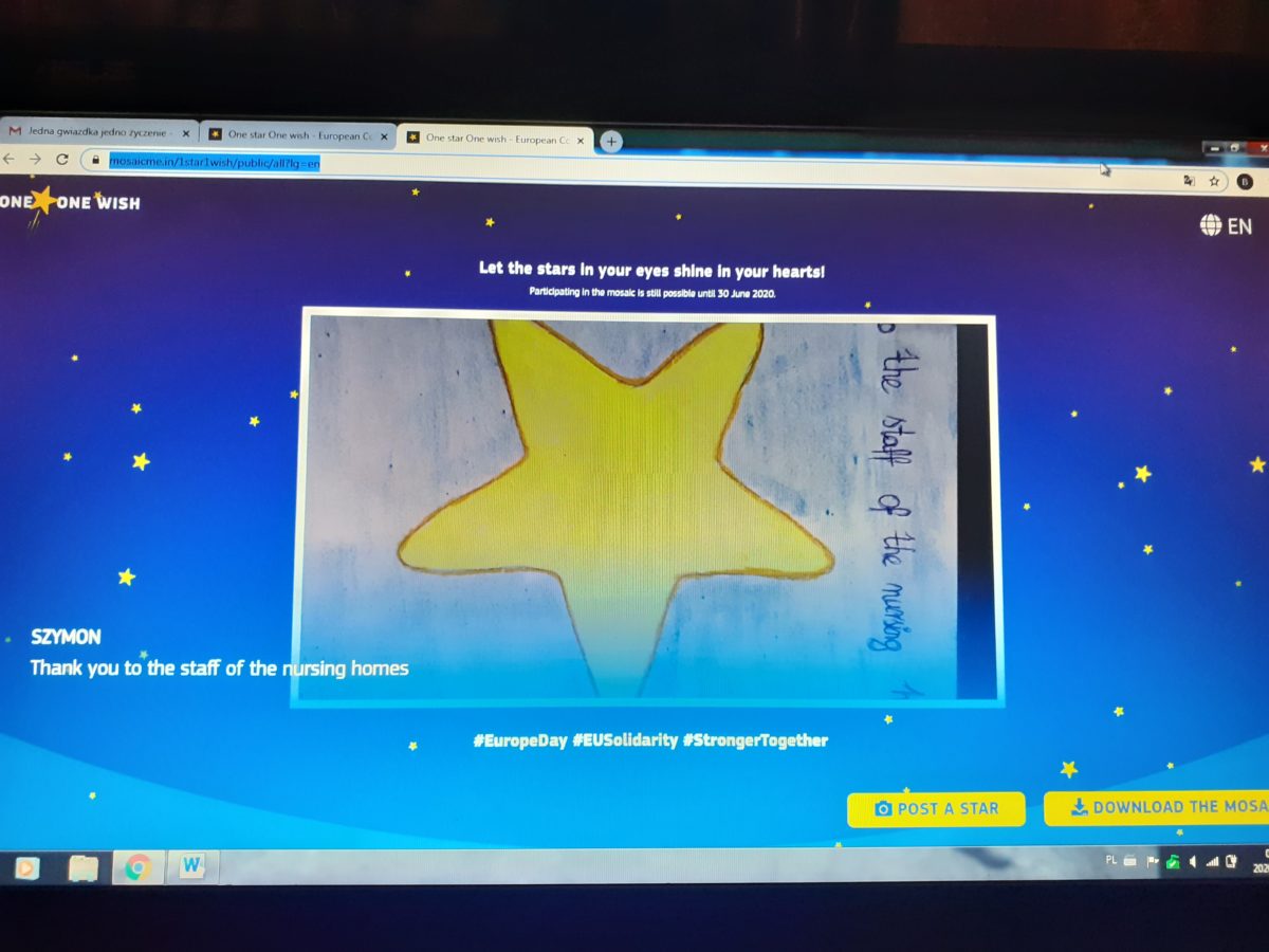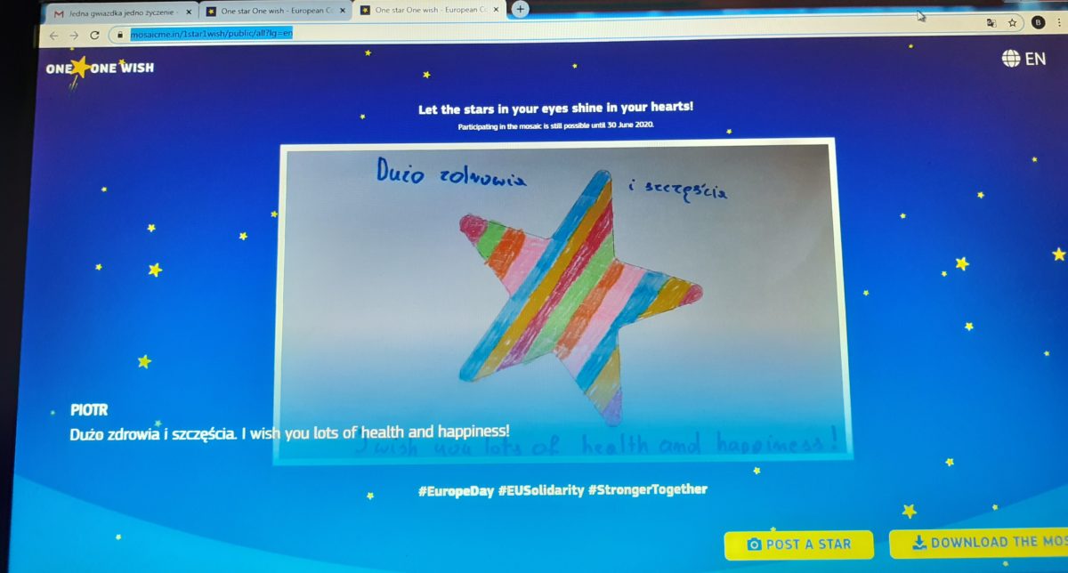 Inicjatywą Przedstawicielstwa Komisji Europejskiej w Belgii jest akcja Jedna gwiazda, jedno życzenie- One star, one wish. Daje wyraz solidarności i jest okazją do tego, by uhonorować wszystkich Europejczyków, którzy wspólnie działają na rzecz wyjścia z kryzysu wywołanego przez pandemię COVID-19. Zaangażowani w projekt uczniowie ze Szkoły Podstawowej nr 2 im. Juliusza Słowackiego w Starym Sączu rysowali gwiazdy lub wykorzystywali gotowy model gwiazdy dostępny na stronie internetowej europejskiego projektu One star, one wish, a następnie osobiście zaprojektowaną gwiazdę poświęcali jakiejś sprawie, ważnym osobom w ich życiu, albo komuś, komu chcieli podziękować.