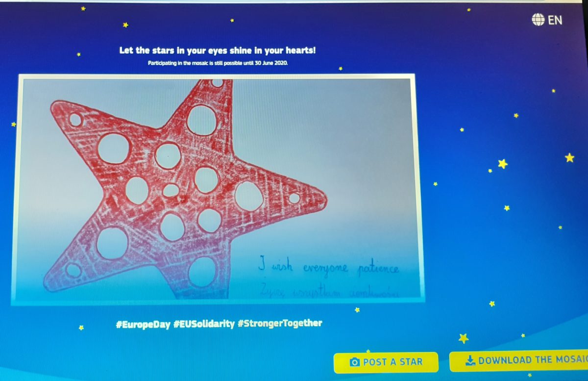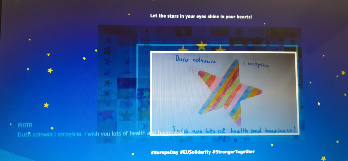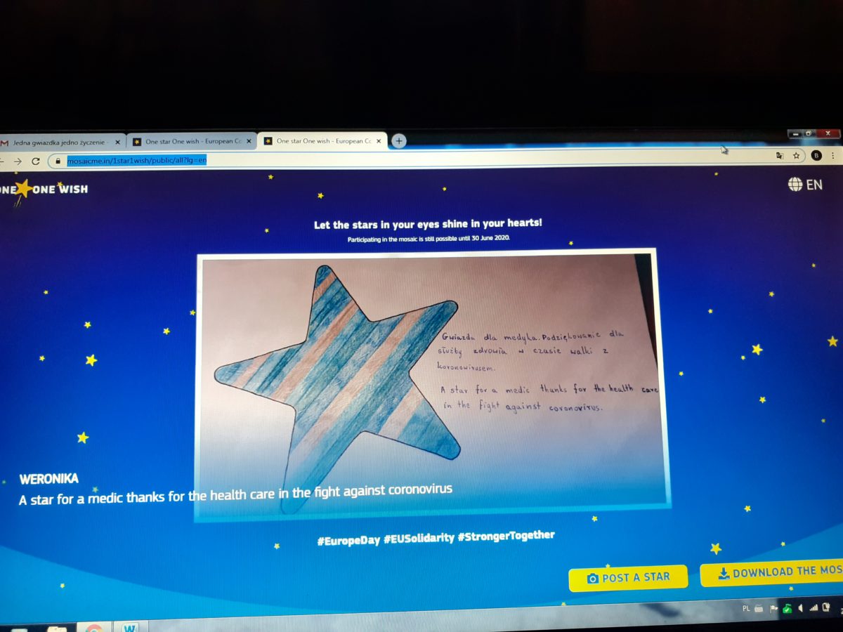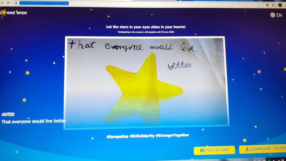 Inicjatywą Przedstawicielstwa Komisji Europejskiej w Belgii jest akcja Jedna gwiazda, jedno życzenie- One star, one wish. Daje wyraz solidarności i jest okazją do tego, by uhonorować wszystkich Europejczyków, którzy wspólnie działają na rzecz wyjścia z kryzysu wywołanego przez pandemię COVID-19. Zaangażowani w projekt uczniowie ze Szkoły Podstawowej nr 2 im. Juliusza Słowackiego w Starym Sączu rysowali gwiazdy lub wykorzystywali gotowy model gwiazdy dostępny na stronie internetowej europejskiego projektu One star, one wish, a następnie osobiście zaprojektowaną gwiazdę poświęcali jakiejś sprawie, ważnym osobom w ich życiu, albo komuś, komu chcieli podziękować.