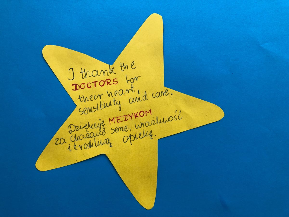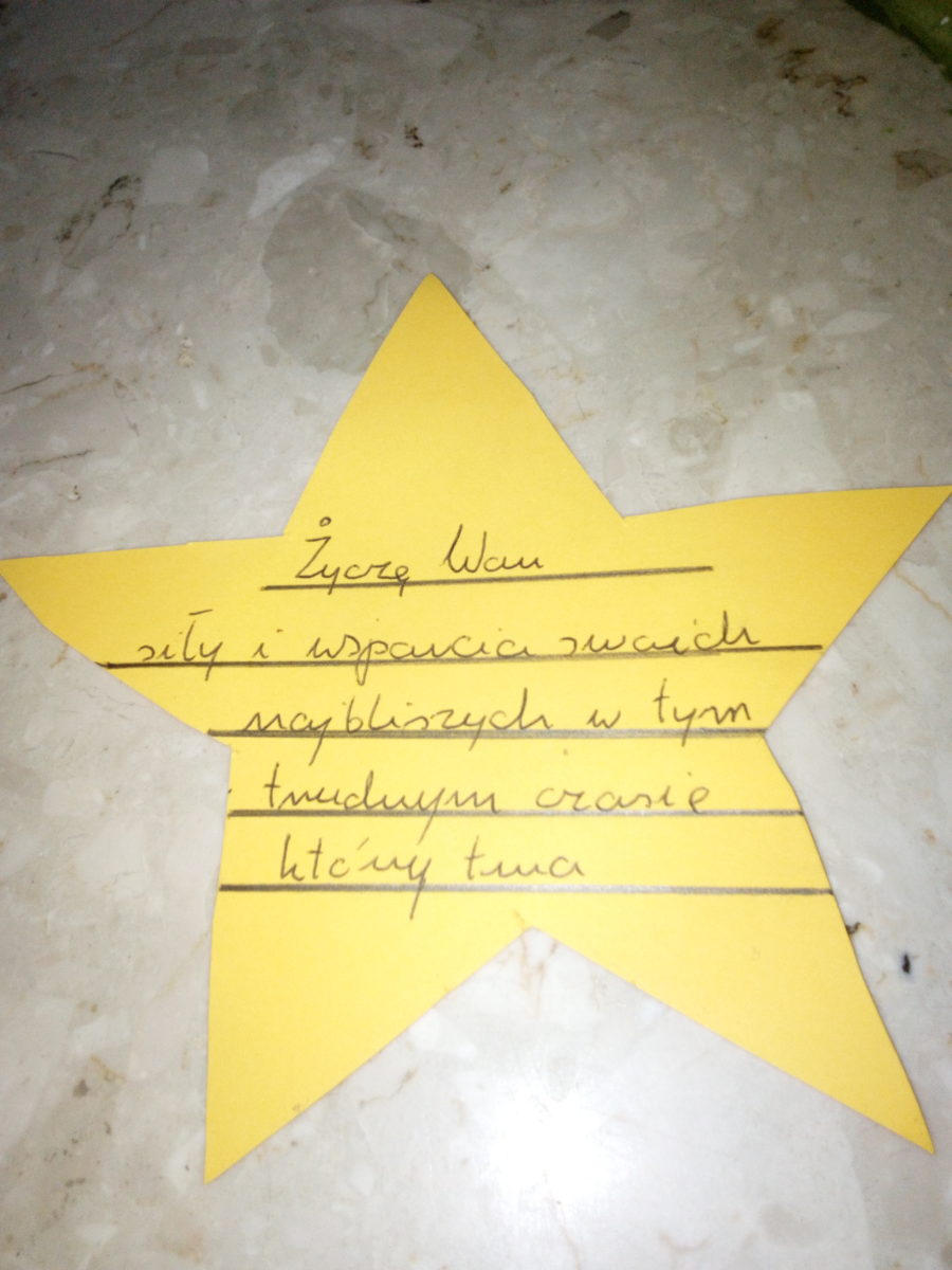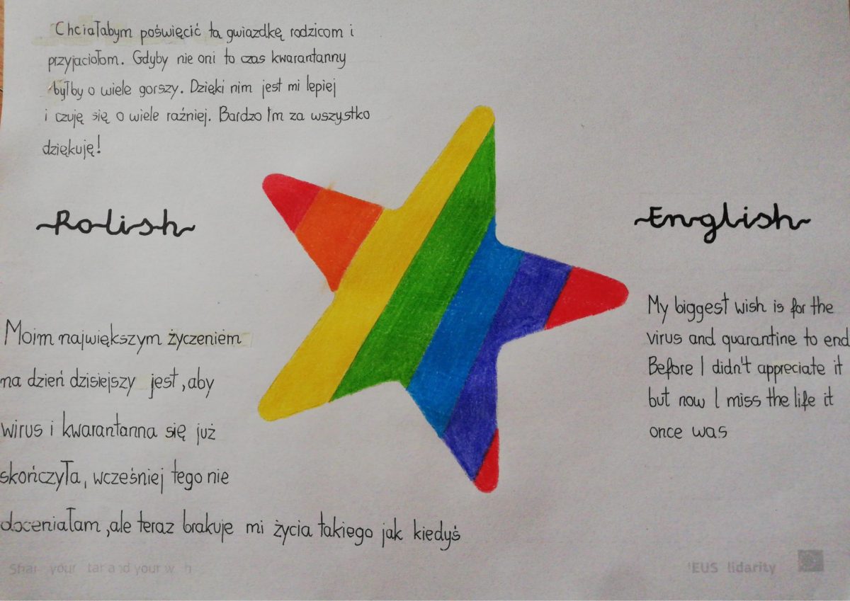 Udział w europejskim projekcie „One star, one wish” dał możliwość spojrzenia na otaczającą nas rzeczywistość sercem, okazania empatii i dostrzeżenia potrzeb nie tylko własnych, ale i innych osób. Do gwiazd uczniowie dołączali przesłania, przemyślenia lub życzenia. Dziękowali najbliższym za to, że są blisko nich, dodając im siły i będąc nieocenionym wsparciem w tym trudnym czasie. Gwiazdy niosły ze sobą młodzieńcze marzenie o tym, by wszyscy żyli lepiej, pragnienie bycia bezpiecznym, a także życzenia zdrowia i cierpliwości. Były też podziękowania dla osób, które okazują serce, troskliwość i wrażliwość w opiece nad potrzebującymi.