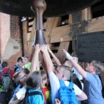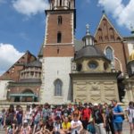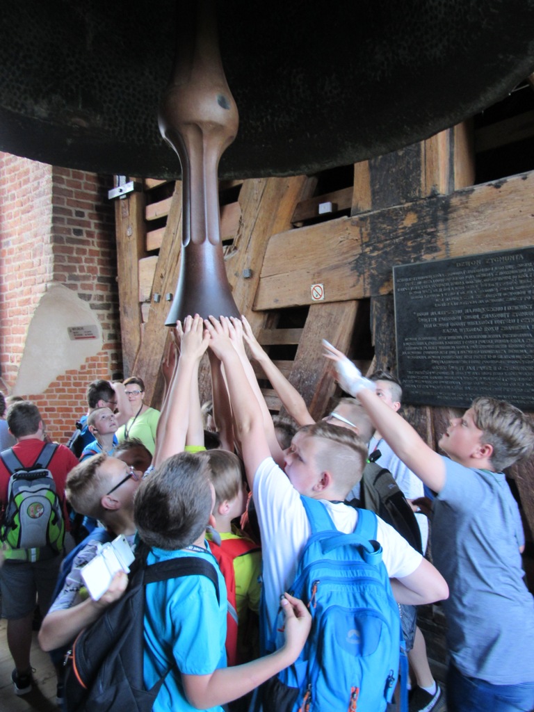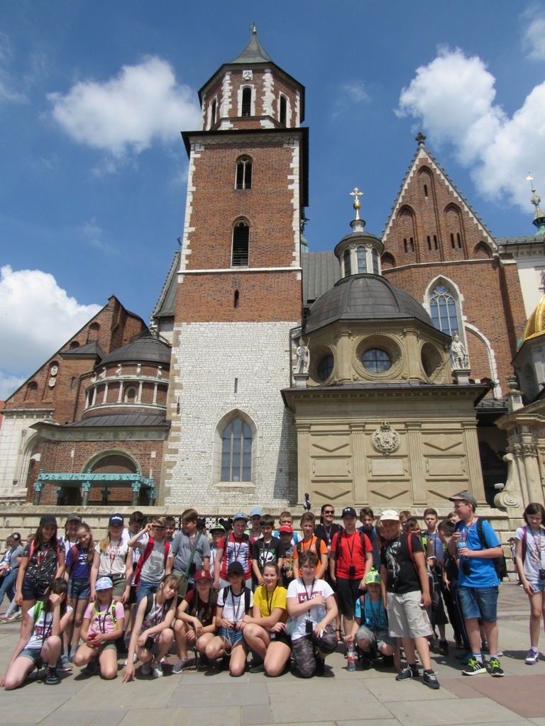 Autokarowy spacer po Drodze Królewskiej absorbuje i nagle okazuje się,  że dojeżdżamy pod Wzgórze Wawelskie, gdzie czeka na uczniów przewodnik, czyli sympatyczna pani Ania. Zanim rozpocznie się zwiedzanie, każdy uczeń otrzymuje odbiorniki ze słuchawkami, dzięki czemu odkrywanie Krakowa będzie jeszcze lepsze. Piątoklasiści mijają słynną Smoczą Jamę i ziejącego ogniem Smoka Wawelskiego, docierając pod Katedrę na Wawelu. Mogą zobaczyć konfesję św. Stanisława, groby królów polskich, krypty w katedrze z Kryptą Wieszczy Narodowych, gdzie spoczywa patron szkoły- Juliusz Słowacki. Mają wiele szczęścia. Wspinają się bowiem na Wieżę Zygmuntowską, by dotknąć serca potężnego Dzwonu Zygmunta. Po opuszczeniu katedry, idą ulicą Kanoniczą i docierają do ulicy Grodzkiej, spoglądając jednocześnie na wspaniałą kamienną fasadę Kościoła św. Piotra i Pawła oraz położony nieopodal romański Kościół św. Andrzeja. Docierają na Rynek Główny z Sukiennicami i odchyloną od pionu o 40 cm wieżą dawnego ratusza, przed którą znajdują się dwa kamienne lwy. Przy pomniku Mickiewicza spoglądają na Bazylikę Mariacką w oczekiwaniu na hejnał, a potem patrzą w kierunku ulicy Floriańskiej, bo podążając dalej aż do Bramy Floriańskiej dociera się przecież do miejsca, gdzie rozpoczął się poranny autokarowy spacer po krakowskiej Drodze Królewskiej.