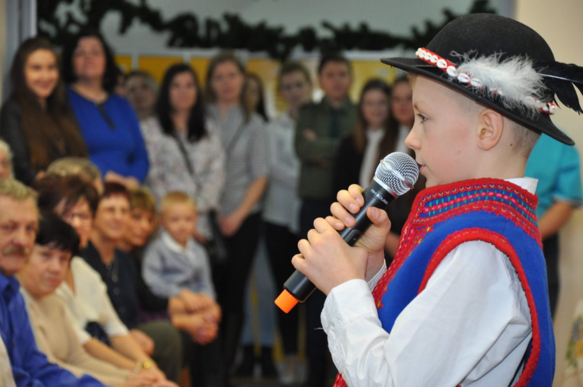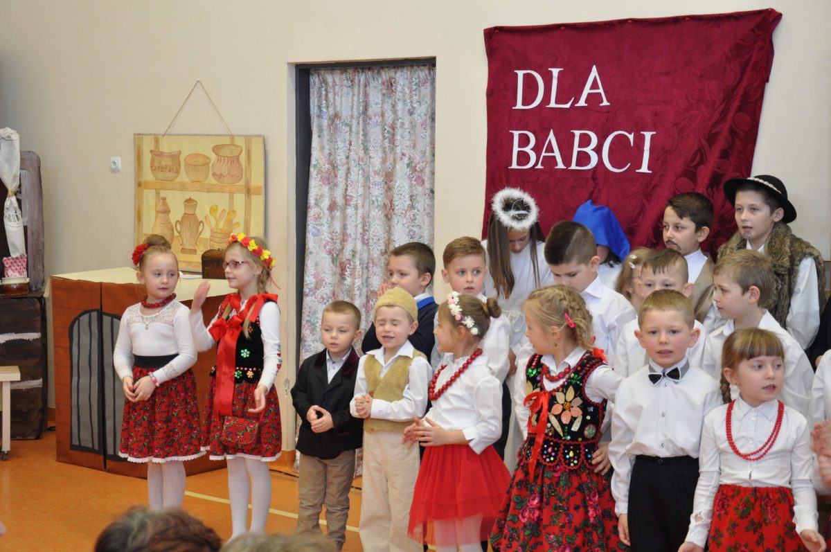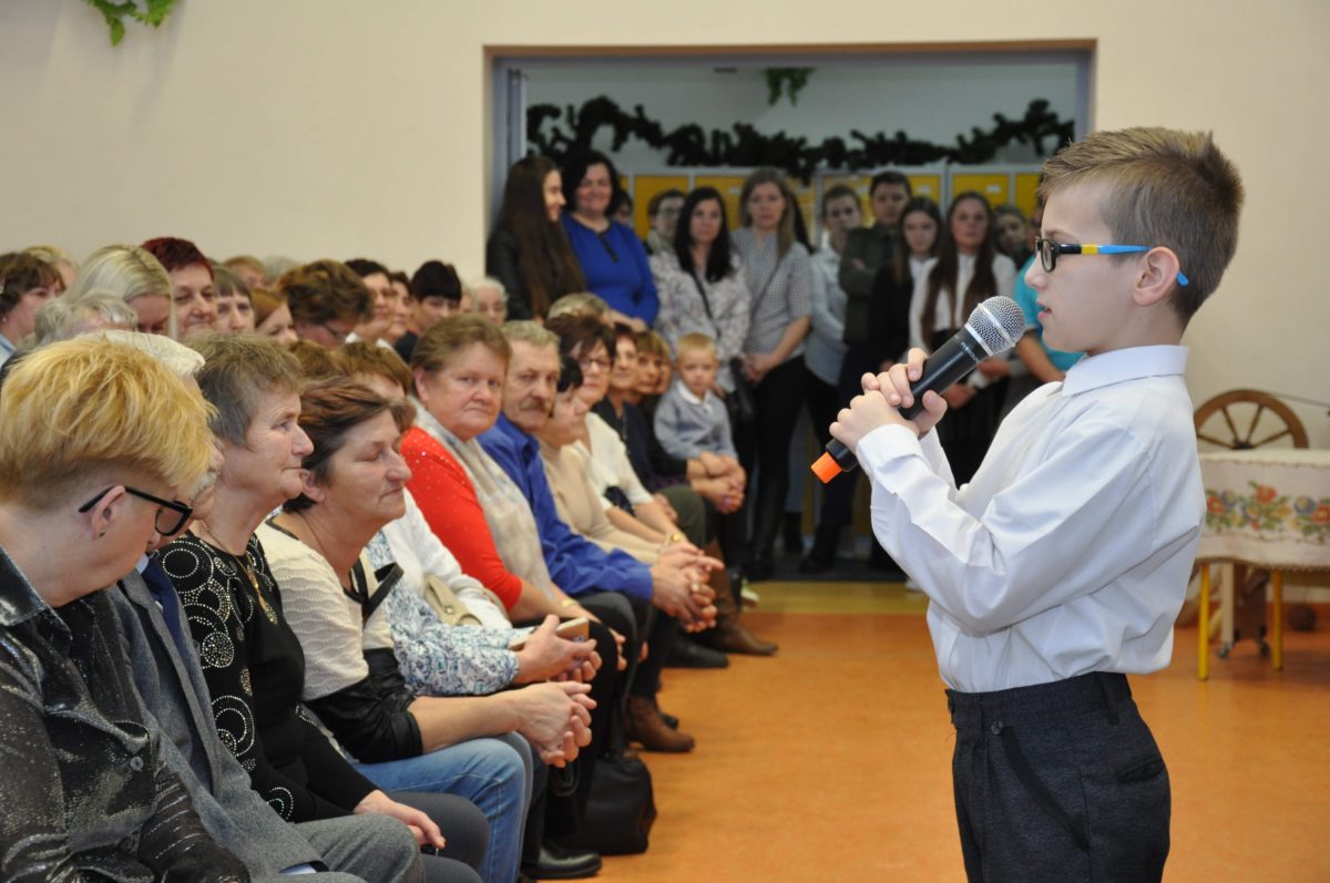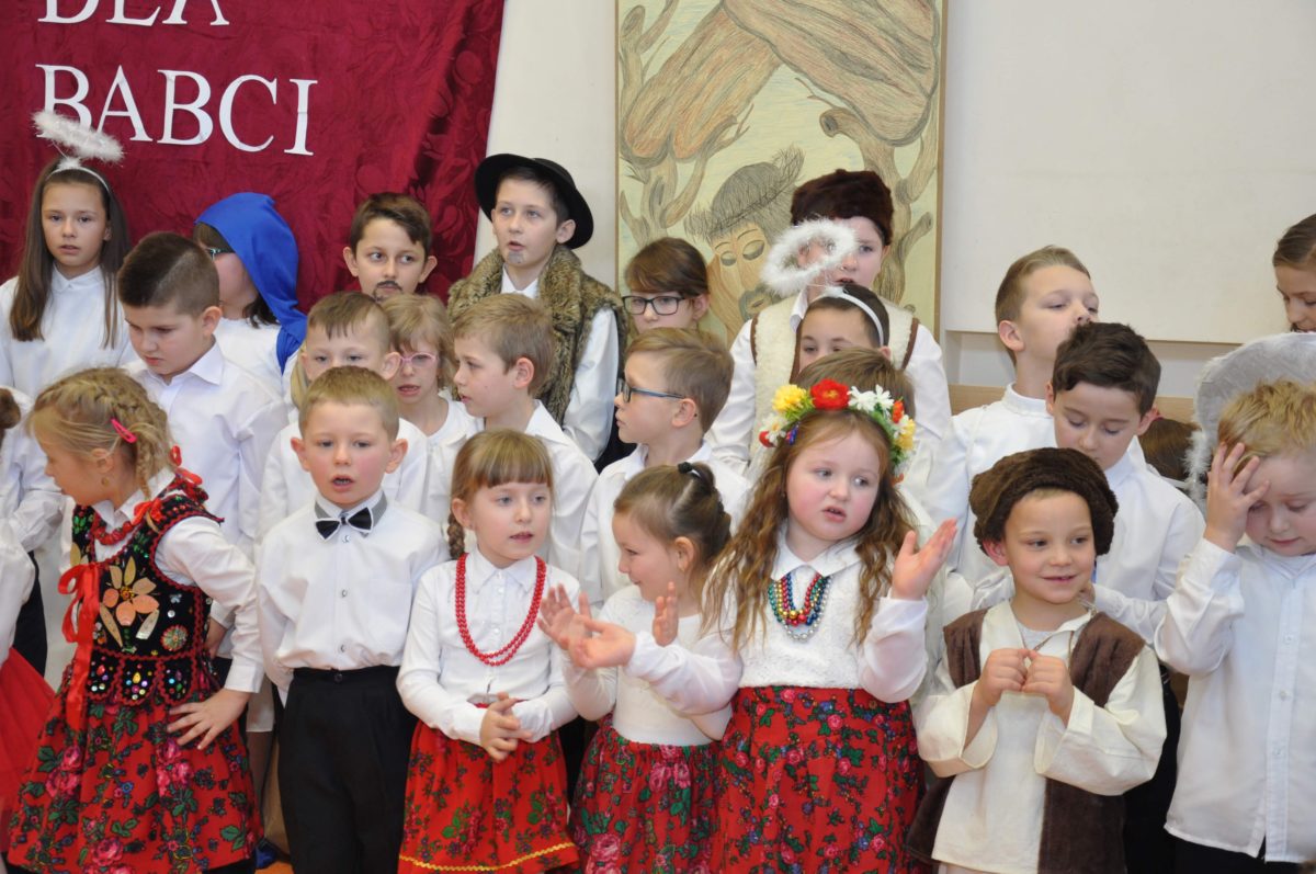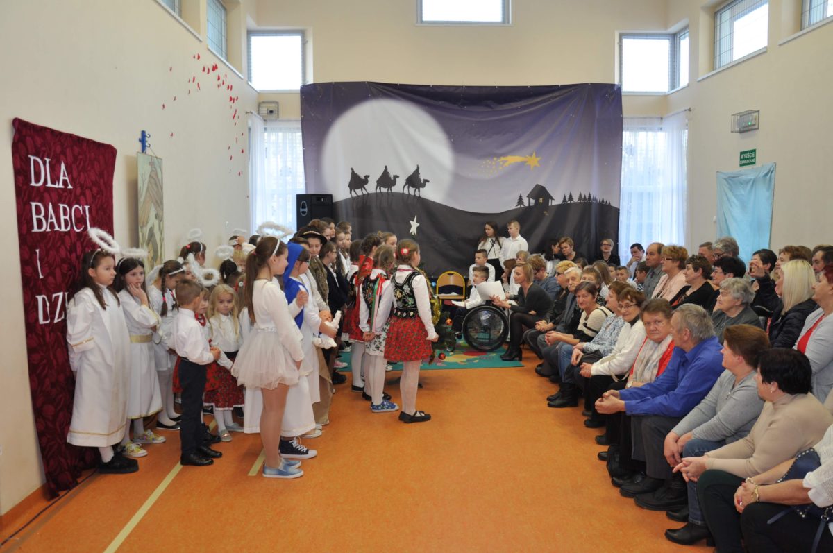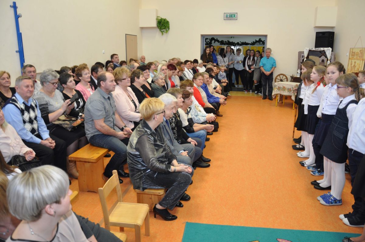 Uroczystość rozpoczęła Pani Dyrektor Grażyna, która powitała wszystkich i zaprosiła do wspólnego oglądania występów dzieci. Dzieci z klasy 3, pod przewodnictwem Pani Marty Słaby, przygotowały główną część programu. Następnie klasa 1, pod przewodnictwem Pani Jadwigi Bochniarz, klasa 2, pod przewodnictwem Pani Anety Lompart, klasa 5, pod przewodnictwem Pani Moniki Wojtaszek i oddział zerówki, pod przewodnictwem Pani Doroty Ogorzały zaśpiewały w ramach koncertu życzeń piękne kolędy i pastorałki z życzeniami dla Babć i Dziadków. Na wyróżnienie zasługuję Lena, która wykonała piękną pastorałkę oraz Oliwier, który wspaniale zagrał na akordeonie 100 lat dla zaproszonych gości. Po występach dzieci podchodziły do swoich dziadków i babć, składali im życzenia i wręczali przygotowane przez Panią Justynę Sejud upominki. Po życzeniach wszyscy oglądnęli wysęp Koła Gospodyń Wiejskich, które przygotowało występ pt. Gość Oczekiwany. Pani Dyrektor przekazał występującym upominki i podziękowało Kołu za ich trud i zaangażowanie na rzecz szkoły.