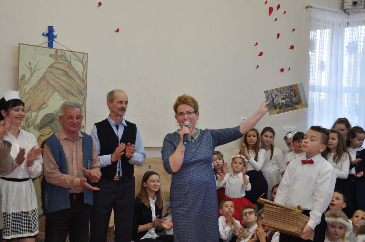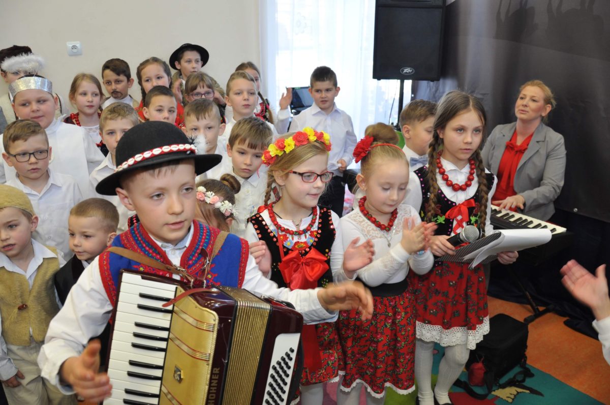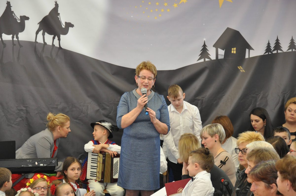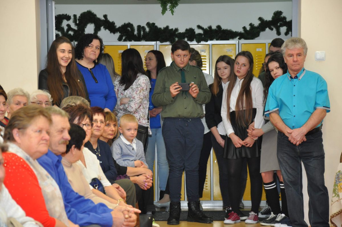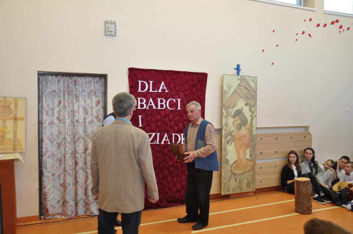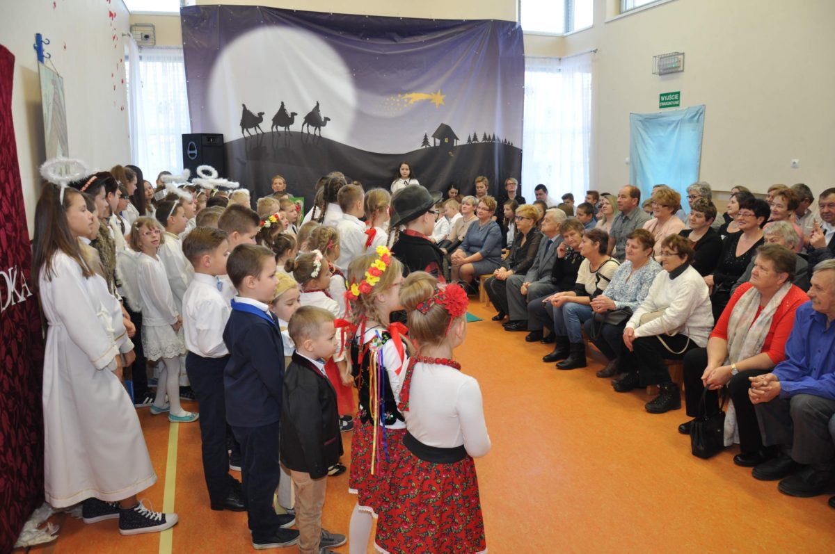 Uroczystość rozpoczęła Pani Dyrektor Grażyna, która powitała wszystkich i zaprosiła do wspólnego oglądania występów dzieci. Dzieci z klasy 3, pod przewodnictwem Pani Marty Słaby, przygotowały główną część programu. Następnie klasa 1, pod przewodnictwem Pani Jadwigi Bochniarz, klasa 2, pod przewodnictwem Pani Anety Lompart, klasa 5, pod przewodnictwem Pani Moniki Wojtaszek i oddział zerówki, pod przewodnictwem Pani Doroty Ogorzały zaśpiewały w ramach koncertu życzeń piękne kolędy i pastorałki z życzeniami dla Babć i Dziadków. Na wyróżnienie zasługuję Lena, która wykonała piękną pastorałkę oraz Oliwier, który wspaniale zagrał na akordeonie 100 lat dla zaproszonych gości. Po występach dzieci podchodziły do swoich dziadków i babć, składali im życzenia i wręczali przygotowane przez Panią Justynę Sejud upominki. Po życzeniach wszyscy oglądnęli wysęp Koła Gospodyń Wiejskich, które przygotowało występ pt. Gość Oczekiwany. Pani Dyrektor przekazał występującym upominki i podziękowało Kołu za ich trud i zaangażowanie na rzecz szkoły.